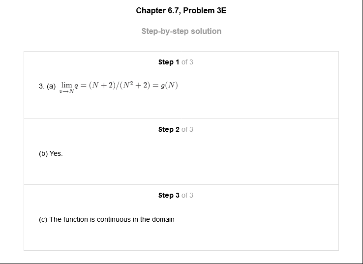 Chapter 6.7, Problem 3E Step-by-step solution Step 1 of 3 3. (a) lim q = (N + + 2) = g(N) Step 2 of 3 (b) Yes. Step 3 of 3 (c) The function is continuous in the domain