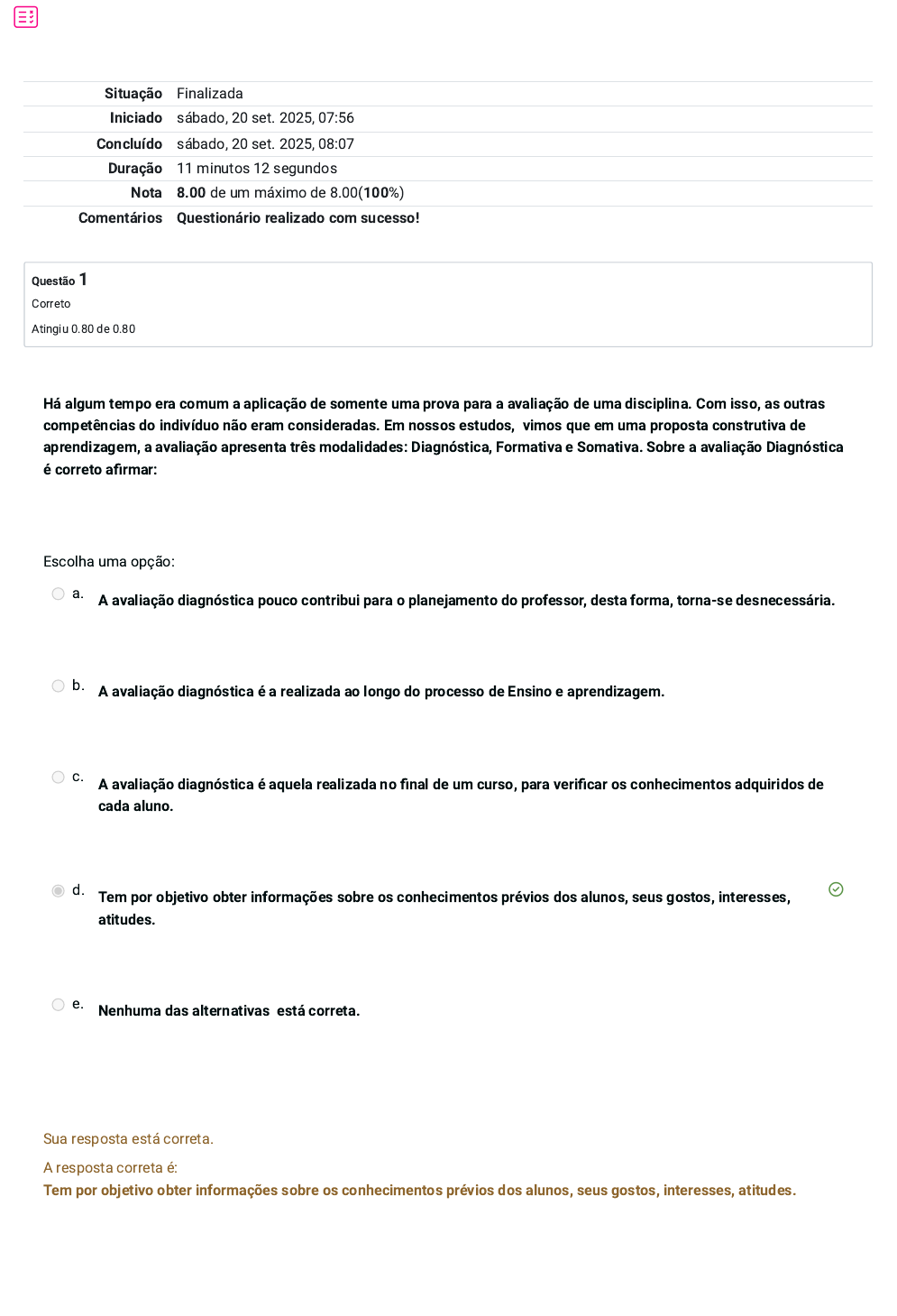 Situação Finalizada Iniciado sábado, 20 set. 2025, 07:56 Concluído sábado, 20 set. 2025, 08:07 Duração 11 minutos 12 segundos Nota 8.00 de um máximo de 8.00(100%) Comentários Questionário realizado com sucesso! Questão 1 Correto Atingiu 0.80 de 0.80 Há algum tempo era comum a aplicação de somente uma prova para a avaliação de uma disciplina. Com isso, as outras competências do indivíduo não eram consideradas. Em nossos estudos, vimos que em uma proposta construtiva de aprendizagem, a avaliação apresenta três modalidades: Diagnóstica, Formativa e Somativa. Sobre a avaliação Diagnóstica é correto afirmar: Escolha uma opção: a. A avaliação diagnóstica pouco contribui para o planejamento do professor, desta forma, torna-se desnecessária. b. A avaliação diagnóstica é a realizada ao longo do processo de Ensino e aprendizagem. c. A avaliação diagnóstica é aquela realizada no final de um curso, para verificar os conhecimentos adquiridos de cada aluno. d. Tem por objetivo obter informações sobre os conhecimentos prévios dos alunos, seus gostos, interesses, atitudes. e. Nenhuma das alternativas está correta. Sua resposta está correta. A resposta correta é: Tem por objetivo obter informações sobre os conhecimentos prévios dos alunos, seus gostos, interesses, atitudes. Questão 2 Correto Atingiu 0.80 de 0.80 No contexto da avaliação da aprendizagem é preciso que haja uma exclusão do conceito de avaliação como forma de averiguação do nível de aprendizagem. Leia as afirmativas e assinale a alternativa que apresenta um processo de avaliação centrado no processo de construção do conhecimento do aluno. I- Ao avaliar o professor deverá coletar, analisar, sintetizar, da forma mais objetiva possível, as manifestações de conduta cognitivas e afetivas dos educandos. II- Avaliação deve ser um processo em que o aluno se sinta livre para expressar suas impressões acerca dos conteúdos. III- A avaliação é um instrumento de grande importância, somente para o aluno. IV- A avaliação deve ser algo presente no contexto escolar, não assustando os alunos, mas sim possibilitando a aprendizagem. Escolha uma opção: a. Somente as afirmativas I, III e IV estão corretas. b. Somente as afirmativas I, II e III estão corretas. c. Somente as afirmativas I e II estão corretas. d. Nenhuma das alternativas está correta. e. Somente as afirmativas I, II e IV estão corretas. Sua resposta está correta. A resposta correta é: Somente as afirmativas I, II e IV estão corretas. Questão 3 Correto Atingiu 0.80 de 0.80 O processo de avaliação da aprendizagem é tema de estudos de muitos autores renomados e também de diversos professores que estão preocupados e comprometidos com a qualidade da educação. As avaliações podem ser classificadas em avaliação tradicional, conservadora e inovadora. Assinale a alternativa correta que corresponde à avaliação inovadora. I- Processo de avaliação contínuo. II- Possibilita o replanejamento das aulas de acordo com o desempenho dos alunos. III- Jogos e pesquisa podem ser instrumentos de avaliação. IV- Única, individual e classificatória. Escolha uma opção: a. Somente as afirmativas III e IV estão corretas. b. Somente as afirmativas I, II e III estão corretas. c. Nenhuma das alternativas está correta. d. Somente as afirmativas II e IV estão corretas. e. Somente as afirmativas I e II estão corretas. Sua resposta está correta. A resposta correta é: Somente as afirmativas I, II e III estão corretas. Questão 4 Correto Atingiu 0.80 de 0.80 A educação superior desempenha um papel muito importante no atual cenário de desenvolvimento econômico, no qual a inovação e pesquisa agregam valor a uma economia baseada no conhecimento. Nesse sentido, os Ambientes Virtuais de Aprendizagem, contribuem para romper a barreira do espaço. Sobre os ambientes virtuais de aprendizagem é correto afirmar: I- Os ambientes virtuais de aprendizagem são espaços que integram os ciberespaços e facilitam a interação entre seus usuários; II- Os ambientes virtuais de aprendizagem podem conter ferramentas que favorecem a prática do aluno com autonomia, oferecendo recursos para a aprendizagem coletiva e individual. III- Os ambientes virtuais de aprendizagem são suficientes para garantir educação de qualidade. IV- Os ambientes virtuais de aprendizagem são espaços inovadores que por meio da tecnologia os professores devem transmitir o conteúdo a partir de velhas metodologias. Escolha uma opção: a. Somente as afirmativas II e IV estão corretas. b. Somente as afirmativas I, II e III estão corretas. c. a)Somente as afirmativas I e II estão corretas. d. Somente as afirmativas I, III e IV estão corretas. e. Nenhuma das alternativas está correta. Sua resposta está correta. A resposta correta é: a)Somente as afirmativas I e II estão corretas. Questão 5 Correto Atingiu 0.80 de 0.80 1. Cipriano Carlos Luckesi é um dos estudiosos de referência em avaliação da aprendizagem escolar. Para Luckesi (2005) A avaliação é inclusiva porque o estudante vai ser ajudado a dar um passo à frente. Conforme nossos estudos, assinale com V para verdadeira e F para falso: I- A avaliação deve ser pautada nos instrumentos de memorização. II- A educação deve superar as práticas autoritárias de avaliação. III- A avaliação deve ter como finalidade o diagnóstico da ocorrência ou não de aprendizagem e seus reais motivos. IV- A avaliação deve ser entendida como forma de auxiliar o aluno direta e indiretamente. V- Luckesi defende que a avaliação deve ser entendida como um processo classificatório. A sequência correta para a resposta da questão é: Escolha uma opção: a. V,V,V,F,V b. Nenhuma das alternativas está correta c. F,V,V,V,F d. F,F,F,V,F e. V,F,V,F,V Sua resposta está correta. A resposta correta é: F,V,V,V,F Questão 6 Correto Atingiu 0.80 de 0.80 A sociedade contemporânea é dinâmica, a economia,