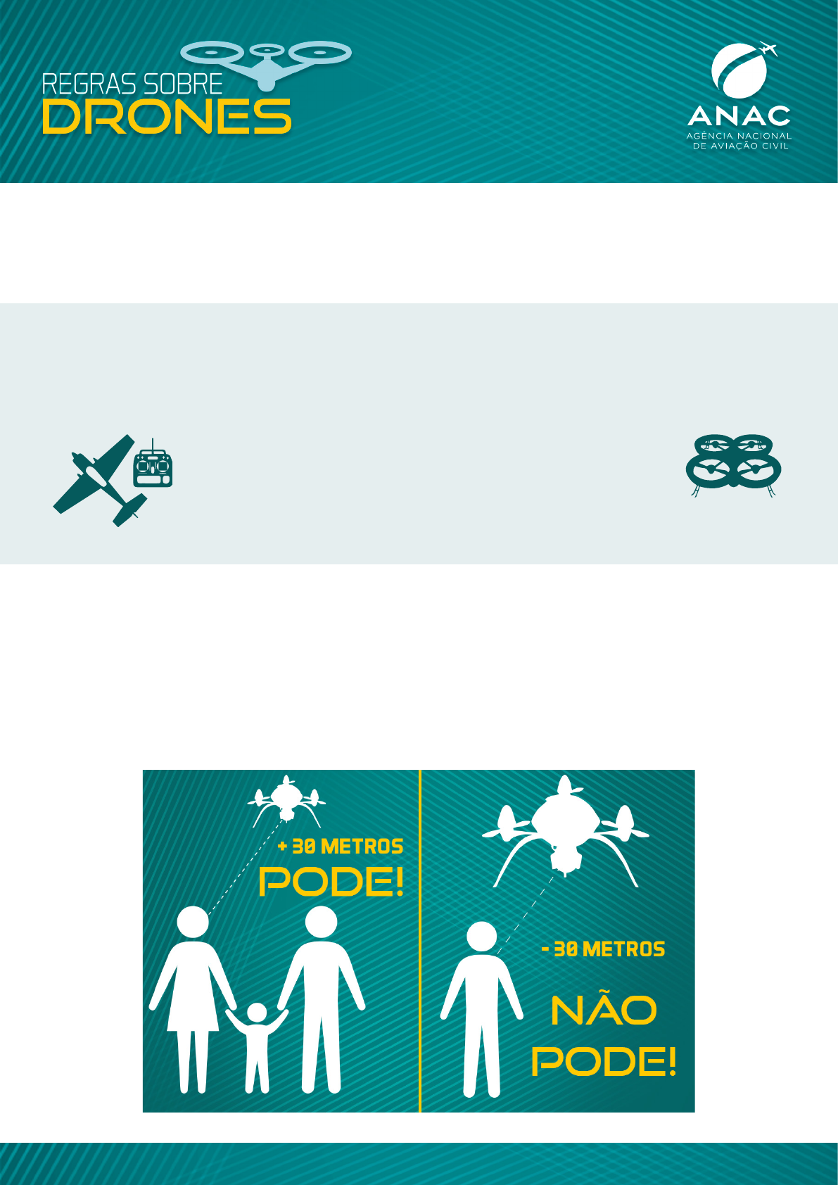 <p>O novo regulamento da ANAC dividiu as aeronaves não tripuladas em aeromodelos, drones usa-</p><p>dos para fins recreativos, e aeronaves remotamente pilotadas (RPA), drones utilizados para operações co-</p><p>merciais, corporativas ou experimentais.</p><p>DRONES</p><p>O termo” drone” é utilizado popularmente para descrever qualquer aeronave (ou mesmo outro tipo de veículo) que</p><p>possua alto grau de automatismo. No entanto, como não há uma definição formal para o termo, a regulamentação</p><p>da Agência não utiliza essa nomenclatura, mas sim “aeromodelos” e “aeronaves remotamente pilotadas” (RPA). O</p><p>que diferencia essas duas categorias de drones é a sua finalidade:</p><p>Aeromodelo</p><p>É toda aeronave não tripulada</p><p>com finalidade de recreação.</p><p>Aeronave Remotamente Pilotada (RPA)</p><p>É uma aeronave não tripulada pilotada</p><p>a partir de uma estação de pilotagem re-</p><p>mota que tenha qualquer outra finalidade</p><p>que não seja recreativa, tais como comer-</p><p>cial, corporativa e experimental.</p><p>Pela regra geral, os drones com mais de 250g só poderão voar em áreas distantes de terceiros (no míni-</p><p>mo 30 metros horizontais), sob total responsabilidade do piloto operador e conforme regras de utilização</p><p>do espaço aéreo do DECEA. Caso exista uma barreira de proteção entre o equipamento e as pessoas a</p><p>distância especificada não precisa ser observada.</p><p>Para voar com drones com mais de 250g perto de pessoas é necessário que elas concordem previa-</p><p>mente com a operação, ou seja, a pessoa precisa saber e concordar com o voo daquele equipamento nas</p><p>proximidades onde se encontra.</p><p>IMPORTANTE!</p><p>As operações totalmente autônomas desses equipamentos, ou seja, naquelas onde o piloto remoto</p><p>não é capaz de intervir, continuam proibidas no país. Essas operações diferem-se das automatizadas, nas</p><p>quais o piloto remoto pode interferir em qualquer ponto.</p><p>Classificação de drones</p><p>Os drones de uso comercial, corporativo ou experimental (RPA) foram categorizadas em três classes, de</p><p>acordo com o peso máximo de decolagem do equipamento.</p><p>Classe 3 Abaixo ou</p><p>igual a 25 kg</p><p>A norma determina que as RPA Classe 3 que operem</p><p>além da linha de visada visual (BVLOS) ou acima de</p><p>400 pés (120m) deverão ser de um projeto autoriza-</p><p>do pela ANAC e precisam ser registradas e identi�ca-</p><p>das com suas marcas de nacionalidade e matrícula.</p><p>Drones dessa classe que operarem em até 400 pés</p><p>(120m) acima da linha do solo e em linha de visada</p><p>visual (operação VLOS) não precisarão ser de projeto</p><p>autorizado, mas deverão ser cadastradas na ANAC</p><p>por meio do sistema SISANT, apresentando informa-</p><p>ções sobre o operador e sobre o equipamento.</p><p>Os drones com até 250g não precisam ser cadastra-</p><p>dos ou registrados, independentemente de sua</p><p>�nalidade (uso recreativo ou não).</p><p>Classe 2</p><p>Acima de 25 kg</p><p>e abaixo ou</p><p>igual a150 kg</p><p>O regulamento estabelece os requisitos técnicos que</p><p>devem ser observados pelos fabricantes e determina</p><p>que a aprovação de projeto ocorrerá apenas uma vez.</p><p>Além disso, esses drones também devem ser regis-</p><p>trados no Registro Aeronáutico Brasileiro e identi�ca-</p><p>dos com suas marcas de nacionalidade e matrícula.</p><p>Classe 1</p><p>Classe</p><p>Peso Máximo</p><p>de Decolagem Exigências de Aeronavegabilidade</p><p>Acima de 150kg</p><p>A regulamentação prevê que equipamentos desse</p><p>porte sejam submetidos a processo de certi�cação</p><p>similar ao existente para as aeronaves tripuladas,</p><p>promovendo ajustes dos requisitos de certi�cação ao</p><p>caso concreto. Esses drones devem ser registrados no</p><p>Registro Aeronáutico Brasileiro e identi�cados com</p><p>suas marcas de nacionalidade e matrícula.</p><p>Idade mínima para pilotagem</p><p>Para pilotar aeronaves não tripuladas RPA, os pilotos remotos e observadores (que auxiliam o piloto</p><p>remoto sem operar o equipamento) devem ter no mínimo 18 anos. Para pilotar aeromodelos não há limite</p><p>mínimo de idade.</p><p>Cadastro</p><p>O cadastro dos drones (aeromodelos ou RPA Classe 3) com peso</p><p>máximo de decolagem superior a 250g é obrigatório e deve ser feito</p><p>pelo Sistema de Aeronaves Não Tripuladas (SISANT) da ANAC pelo en-</p><p>dereço sistemas.anac.gov.br/sisant. O número de identificação gerado</p><p>na certidão de cadastro deve estar acessível na aeronave ou em local</p><p>que possa ser facilmente acessado, de forma legível e produzido em</p><p>material não inflamável.</p><p>Registro de voos</p><p>Os voos com aeromodelo e RPA Classe 3 não precisam ser registrados. O voos com as demais aeronaves</p><p>não tripuladas devem ser registrados.</p><p>Licença, Habilitação e Certificado Médico Aeronáutico</p><p>Operadores de aeromodelos e de aeronaves RPA de até 250g são considerados licenciados, sem neces-</p><p>sidade de possuir documento emitido pela ANAC desde que não pretendam usar equipamento para voos</p><p>acima de 400 pés.</p><p>Serão obrigatórias licença e habilitação emitidas pela ANAC apenas para pilotos de operações com</p><p>aeronaves não tripuladas RPA das classes 1 (peso máximo de decolagem de mais de 150 kg) ou 2 (mais de</p><p>25 kg e até 150 kg) ou da classe 3 (até 25 Kg) que pretendam voar acima de 400 pés.</p><p>Pilotos remotos de aeronaves não tripuladas RPA das classes 1 (mais de 150 kg) e 2 (mais de 25 kg e até</p><p>150 kg) deverão possuir ainda o Certificado Médico Aeronáutico (CMA) emitido pela ANAC ou o CMA de</p><p>terceira classe do DECEA.</p><p>Saiba mais</p><p>Operação BVLOS – Operação na qual o piloto não consegue manter o drone dentro de seu alcance visual,</p><p>mesmo com a ajuda de um observador.</p><p>Operação VLOS