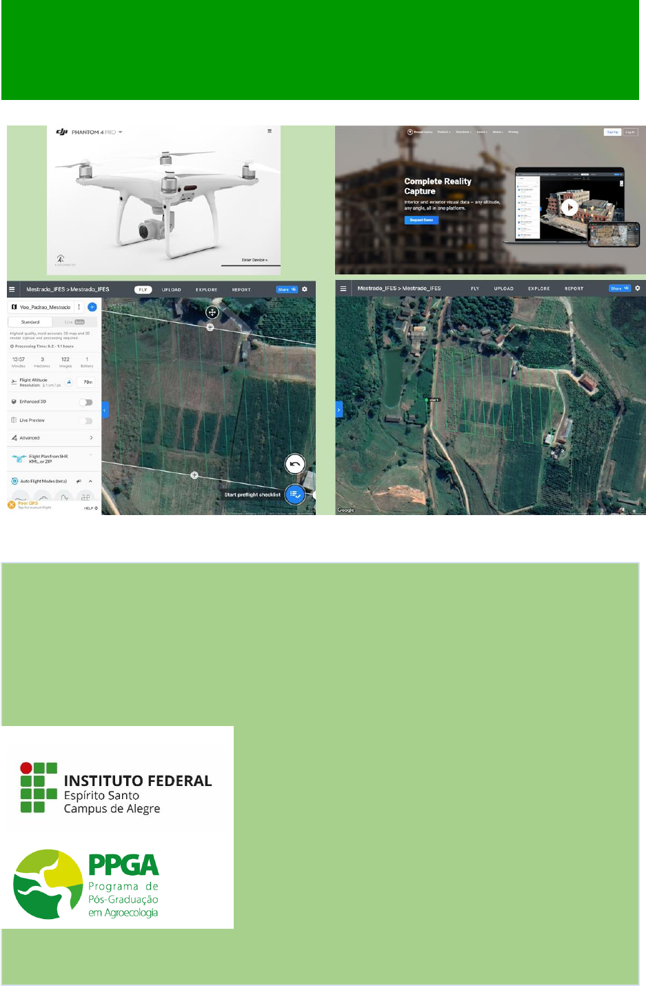 Planejamento de voo utilizando o DroneDeploy: Passo a passo Thiago Blunck Rezende Moreira Jéferson Luiz Ferrari Otacílio José Passos Rangel Alexandre Rosa dos Santos Alegre, ES Setembro/2022 MANUAL TECNOLÓGICO - Nº 12 DOI: 10.36524/9788582635896 Editora do Instituto Federal de Educação, Ciência e Tecnologia do Espírito Santo R. Barão de Mauá, nº 30 – Jucutuquara 29040-689 – Vitória – ES www.edifes.ifes.edu.br | editora@ifes.edu.br Reitor: Jadir José Pela Pró-Reitor de Administração e Orçamento: Lezi José Ferreira Pró-Reitor de Desenvolvimento Institucional: Luciano de Oliveira Toledo Pró-Reitora de Ensino: Adriana Pionttkovsky Barcellos Pró-Reitor de Extensão: Renato Tannure Rotta de Almeida Pró-Reitor de Pesquisa e Pós-Graduação: André Romero da Silva Coordenador da Edifes: Adonai José Lacruz Conselho Editorial Aldo Rezende * Ediu Carlos Lopes Lemos * Felipe Zamborlini Saiter * Francisco de Assis Boldt * Glória Maria de F. Viegas Aquije * Karine Silveira * Maria das Graças Ferreira Lobino * Marize Lyra Silva Passos * Nelson Martinelli Filho * Pedro Vitor Morbach Dixini * Rossanna dos Santos Santana Rubim * Viviane Bessa Lopes Alvarenga Revisão de texto: Projeto gráfico: Diagramação: Capa: Imagem de capa: Jéferson Luiz Ferrari Thiago Blunck Rezende Moreira Jéferson Luiz Ferrari Thiago Blunck Rezende Moreira Thiago Blunck Rezende Moreira DOI: 10.36524/9788582635896 Esta obra está licenciada com uma Licença Atribuição-NãoComercial-SemDerivações 4.0 Brasil. 3 Manual Tecnológico Nº 12 Planejamento de voo utilizando o DroneDeploy: Passo a passo Thiago Blunck Rezende Moreira, Engenheiro Agrimensor e de Segurança do Trabalho, Mestrando no Programa de Pós-Graduação em Agroecologia do Instituto Federal do Espírito Santo – Campus de Alegre, Alegre, ES. E-mail: tbrmoreira@hotmail.com. Jéferson Luiz Ferrari, Dr. em Produção Vegetal, Professor no Instituto Federal do Espírito Santo – Campus de Alegre, Alegre, ES. E-mail: ferrarijl@ifes.edu.br. Otacílio José Passos Rangel, Dr. em Solos, Professor no Instituto Federal do Espírito Santo – Campus de Alegre, Alegre. E-mail: ojprangel@ifes.edu.br. Alexandre Rosa dos Santos. Dr. em Engenharia Agrícola. Professor da Universidade Federal do Espírito Santo, Alegre, ES. E-mail: mundogeomatica@yahoo.com.br. Introdução Um dos princípios fundamentais da Agroecologia é a sustentabilidade. As geotecnologias podem ser aplicadas no meio rural, no estudo e monitoramento de animais, em políticas públicas, na pecuária, em zoneamentos agroecológicos determinando as limitações e potencialidades do meio físico para diferentes atividades, apontando as necessidades de preservação e conservação ambiental, identificando e delimitando áreas de conflitos entre uso atual, legislação, potencial de uso e necessidades de preservação e conservação ambiental (ROSA, 2005). Assim estimular o uso de softwares livres, para planejamento de voos com fotos capturadas por sensores embarcados em Aeronaves Remotamente Pilotadas (ARP), de baixo custo relativo, corrobora para a sustentabilidade. Com uma elevada quantidade de algoritmos computacionais capazes de processar, analisar, quantificar e gerar índices de vegetação, é possível extrair informações agroecológicas, como o uso da terra e a identificação de áreas que necessitam de conservação e preservação ambiental por meio da aquisição e atualização de dados espaciais, contribuindo no meio científico para uma agricultura sustentável. A utilização de ARP, popularmente conhecidas por Vants (Veículos aéreos não tripulados) ou por drones tem ganhado um espaço notável, em nível global, seja pelo seu uso recreativo ou pelo uso profissional. Na área de ciências agrárias, o uso dessas tecnologias tem possibilitado o monitoramento das culturas e a detecção de problemas fitossanitários da plantação, por meio de sensores acoplados nas aeronaves (VIANA et al., 2018; RESENDE et al., 2020), e contribuído para cortar custos e aumentar a produtividade das culturas (DE OLIVEIRA et al., 2020). Vale destacar que para comandar uma ARP é necessário observar e seguir as regras da Agência Nacional de Aviação Civil (ANAC) e do Departamento do Controle do Espaço Aéreo mailto:tbrmoreira@hotmail.com mailto:ferrarijl@ifes.edu.br mailto:ojprangel@ifes.edu.br mailto:mundogeomatica@yahoo.com.br 4 Manual Tecnológico Nº 12 Brasileiro (DCEA) e demais agências reguladoras (ANATEL, ANTAQ, ANEEL) (DE PAULA; ROVER; DE SOUZA, 2021). Os voos, quando autorizados, podem ser feitos em tempo real a partir da superfície terrestre ou de forma planejada, a partir de um plano de voo realizado com o auxílio de softwares de controle e processamento (VAN REES, 2015; DRONEDEPLOY, 2020; DAMBROSKI et al., 2021). O presente Manual tem como objetivo demonstrar o passo a passo do planejamento de voo por drones utilizando o programa computacional “DroneDeploy”. Trata-se de um aplicativo de voo automatizado que disponibiliza aos seus usuários duas formas para realizar seus projetos. A primeira é por aplicativo, disponíveis para os sistemas Android e iOS, e a segunda é no próprio site da empresa. Os projetos que forem realizados podem ser acessados tanto na plataforma quanto em um dispositivo móvel, uma vez que a atualização é feita automaticamente quando estiver conectado à internet. É um aplicativo de voo gratuito para a realização do planejamento e execução dos voos. Os Vants suportados pelo DroneDeploy são: “Inspire 2”, “Mavic Air”, “Mavic Air 2”, “Mavic Pro”, “Mavic Pro Platinum”, “Mavic 2 Pro”, “Mavic 2 Enterprise Zoom”, “Mavic 2 Enterprise Dual”, “Matrice 100”, “Matrice 200”, “Matrice 210”, “Matrice 210 RTK”, “Matrice 200 V2”, “Matrice 210 V2”, “Matrice 210 RTK V2”, “Matrice 300 RTK”, “Phantom 4”, “Phantom 4 Advanced”, “Phantom 4 Pro”, “Phantom 4 Pro V2.0”