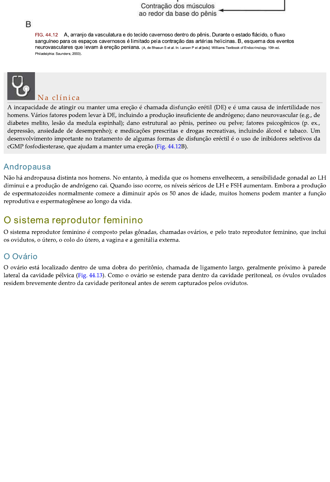 Contração dos músculos ao redor da base do pênis FIG. A, arranjo da vasculatura e do tecido cavernoso dentro do pênis. Durante o estado flácido, o fluxo sanguíneo para espaços cavernosos é limitado pela contração das artérias helicinas. B, esquema dos eventos neurovasculares que levam à ereção peniana. (A, de Bhasun S et al. In: Larsen P et al [eds]. Williams Textbook of Endocrinology. 10th ed. Philadelphia: Saunders; 2003). Na clínica A incapacidade de atingir ou manter uma ereção é chamada disfunção erétil (DE) e é uma causa de infertilidade nos homens. Vários fatores podem levar à DE, incluindo a produção insuficiente de andrógeno; dano neurovascular (e.g., de diabetes melito, lesão da medula espinhal); dano estrutural ao pênis, períneo ou pelve; fatores psicogênicos (p. ex., depressão, ansiedade de desempenho); e medicações prescritas e drogas recreativas, incluindo álcool e tabaco. Um desenvolvimento importante no tratamento de algumas formas de disfunção eréctil é o uso de inibidores seletivos da cGMP fosfodiesterase, que ajudam a manter uma ereção (Fig. 44.12B). Andropausa Não há andropausa distinta nos homens. No entanto, à medida que os homens envelhecem, a sensibilidade gonadal ao LH diminui e a produção de andrógeno cai. Quando isso ocorre, os níveis séricos de LH e FSH aumentam. Embora a produção de espermatozoides normalmente comece a diminuir após os 50 anos de idade, muitos homens podem manter a função reprodutiva e espermatogênese ao longo da vida. sistema reprodutor feminino sistema reprodutor feminino é composto pelas gônadas, chamadas ovários, e pelo trato reprodutor feminino, que inclui os ovidutos, o útero, o colo do útero, a vagina e a genitália externa. Ovário ovário está localizado dentro de uma dobra do peritônio, chamada de ligamento largo, geralmente próximo à parede lateral da cavidade pélvica (Fig. 44.13). Como o ovário se estende para dentro da cavidade peritoneal, os óvulos ovulados residem brevemente dentro da cavidade peritoneal antes de serem capturados pelos ovidutos.Tuba uterina Bolsa retouterina Ovário de Douglas Útero Vagina Bexiga Reto Uretra Ânus Clitóris Grandes lábios Pequenos lábios FIG. 44.13 Anatomia do sistema reprodutor feminino. (Modificado de Drake RL et al., Grey's Anatomy for Students, Philadelphia: Churchill Livingstone, 2005). ovário é dividido em um córtex externo e uma medula interna (Fig. Os elementos neurovasculares inervam a medula do ovário. córtex do ovário é composto por um estroma densamente celular. Dentro desse estroma residem os folículos ovarianos (Fig. 44.14, F), que contêm um ovócito primário circundado por células foliculares. córtex é coberto por uma cápsula de tecido conjuntivo, a túnica albugínea, e uma camada de epitélio simples constituído por células epiteliais da superfície do ovário. Não há ductos surgindo do ovário para transportar seus gametas para o trato reprodutor. Assim, o processo de ovulação envolve um evento inflamatório que rompe a parede do ovário. Após a ovulação, as células epiteliais da superfície do ovário se dividem rapidamente para reparar a parede. A maioria dos cânceres de ovário se origina deste epitélio altamente proliferativo.Córtex F F Medula CL F FIG. 44.14 Histologia do ovário. CL, corpo lúteo; F, folículo. (Modificado de Young et al. Wheater's Functional Histology. A Text and Colour Atlas. 5th ed. London: Churchill Livingstone; 2006). Crescimento, Desenvolvimento e Função do Folículo Ovariano folículo ovariano é a unidade funcional do ovário e desempenha funções gametogênicas e endócrinas. Uma secção histológica do ovário de uma mulher em ciclo pré-menopausa contém estruturas foliculares em vários diferentes estágios de desenvolvimento. A história de vida de um folículo pode ser dividida nas seguintes etapas: 1. folículo primordial em repouso 2. folículo pré-antral (primário e secundário) em crescimento 3. folículo antral (terciário) em crescimento 4. folículo dominante (pré-ovulatório, graafiano) 5. folículo dominante no período periovulatório 6. corpo lúteo (da menstruação ou da gestação) 7. folículos atrésicos Folículo Primordial em Repouso Crescimento e Estrutura Os folículos primordiais em repouso (Fig. 44.15) representam a estrutura folicular mais antiga e mais simples do ovário. Os folículos primordiais aparecem durante a metade da gestação através da interação dos gametas e das células somáticas. As células germinativas primordiais que migraram para a gônada continuam a se dividir mitoticamente como ovogônia até o quinto mês de gestação em humanos. Nesse ponto, os aproximadamente sete milhões de ovogônias entram no processo de meiose e se tornam ovócitos primários. Durante esse tempo, os ovócitos primários ficam circundados por um epitélio simples de células foliculares somáticas, criando, assim, os folículos primordiais (Fig. 44.15). As células foliculares estabelecem junções comunicantes entre si e o ovócito. As próprias células foliculares representam um verdadeiro epitélio avascular circundado por uma lâmina basal. Semelhante às interações célula de Sertoli-espermatozoide, uma subpopulação de células da granulosa permanece intimamente ligada aos ovócitos ao longo de seu desenvolvimento. As células da granulosa fornecem nutrientes tais como aminoácidos, ácidos nucleicos e piruvato para suportar a maturação do ovócito.Lâmina Ovócito basal primário Folículo primordial Células da Vesícula germinal pré-granulosa com nucléolo Zona pelúcida Folículo primário Células cuboides da granulosa Teca Folículo pré-antral secundárioCélulas estratificadas da granulosa FIG. 44.15 Desenvolvimento de um folículo primordial até um folículo pré-antral secundário. (Modificado de White BA, Porterfield SP, Endocrine Physiology, 4th ed., Philadelphia: Mosby, 2013). Os folícu