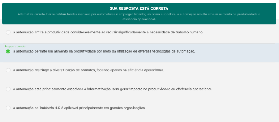 1 - A automação na Indústria 4.0 engloba uma série de pilares nos quais as funções humana e da máquina são redefinidas. A automação, associada à informatização, é um processo que converte trabalhos manuais em automáticos. Com os avanços tecnológicos recentes, mesmo as organizações de menor porte conseguem automatizar seus sistemas de manufatura, aprimorando a eficiência operacional, dentre outros aspectos. Considerando a importância e o papel da automação na Indústria 4.0, um dos principais benefícios da automação em sistemas de manufatura é que: qual a unica resposta correta? R: a automação permite um aumento na produtividade por meio da utilização de diversas tecnologias de automação. ---------------------------------------------------------------------------------------------------------------------- 2 - A Indústria 4.0 é um conceito que engloba a integração de sistemas cyber-físicos, onde máquinas, sensores e dispositivos eletrônicos estão conectados e trocam informações em tempo real. Essa integração possibilita o avanço da automação e da eficiência nos processos industriais. Nesse contexto, a Indústria 4.0 é sustentada por diversos pilares que fornecem as bases tecnológicas para essa transformação. Considerando as informações do texto, o pilar que envolve a conexão entre rede de objetos físicos, ambientes, veículos e máquinas por meio de dispositivos eletrônicos embarcados qual é a unica resposta correta? R: Resposta corretaInternet das Coisas (IoT), possibilitando a coleta, transmissão e análise de dados em tempo real. ---------------------------------------------------------------------------------------------------------------------- 3 - A gestão e o planejamento de produção são aspectos cruciais para o sucesso de uma empresa. Atualmente, essas atividades contam com o auxílio de sistemas computacionais específicos que facilitam o controle e a integração das informações. Nesse contexto, é fundamental compreender a funcionalidade e o papel de cada um desses sistemas, como Manufacturing Resource Planning (MRP), Enterprise Resource Planning (ERP), Product Data Management (PDM) e Product Lifecycle Management (PLM), no processo produtivo. Considerando o texto apresentado, avalie as afirmações a seguir: I. O sistema MRP é responsável pelo gerenciamento de todas as áreas da empresa. II. O sistema ERP integra as informações gerenciais dos diferentes departamentos de uma empresa, permitindo a visualização da situação geral da empresa e gerando relatórios de controle e gestão. III. O sistema PDM é responsável pela análise e otimização de processos de produção. IV. O sistema PLM abrange todas as etapas de manufatura de um produto, desde as definições iniciais até o final de vida do produto e seu descarte. É correto o que se afirma em: R: II e IV, apenas. ---------------------------------------------------------------------------------------------------------------------- 4 - O mundo da indústria 4.0 é repleto de avanços tecnológicos que buscam otimizar e tornar mais eficientes os processos de produção. Entre esses avanços, destaca-se a utilização de dispositivos de medição, tais como os encoders. Os encoders são dispositivos eletromecânicos que convertem a posição angular de um eixo em um código digital ou analógico. Em ambientes industriais, esses dispositivos desempenham um papel crucial ao fornecer feedback preciso sobre a posição, o que é essencial para a integração e controle precisos de máquinas e sistemas cyber-físicos. BRITO, Fábio. Sensores e atuadores. 1ª edição. Editora Saraiva, 2019. E-book. ISBN 9788536531953. Disponível em: Minha Biblioteca. Acesso em: 11 ago. 2023. Com base no texto apresentado, analise as asserções a seguir e a relação proposta entre elas. I. O encoder absoluto precisa ser recalibrado para assegurar a precisão da posição, pois sua memória interna perde a última posição registrada. PORQUE II. O encoder absoluto fornece informações sobre a mudança na posição de um eixo em relação a um ponto de referência. A respeito dessas asserções, assinale a opção correta: R: Resposta correta As asserções I e II são proposições falsas. ------------------------- 5 - Leia o trecho a seguir: "Robô é uma máquina que se parece com um ser humano e executa várias ações complexas (caminhar, falar) de seres humanos ou um meio (ou máquina) que automaticamente executa tarefas complicadas e repetitivas ou ainda um mecanismo guiado por controle automático". ROMERO, Roseli Aparecida F.; PRESTES, Edson; OSÓRIO, Fernando; et al. Robótica Móvel. Grupo GEN, 2014. p. 6. E- book. ISBN 978-85-216-2642-8. Disponível em: Minha Biblioteca. Acesso em: 02 ago. 2023. Considerando o texto apresentado, avalie as asserções a seguir e a relação proposta entre elas. I. Um robô pode auxiliar em tarefas educativas e de desenvolvimento cognitivo, como o auxílio a pessoas autistas. PORQUE II. Um robô é um mecanismo guiado por controle automático capaz de executar ações complexas de seres humanos e realizar cirurgias minimamente invasivas. A respeito dessas asserções, assinale a opção correta. R: ---------------------- 6 - A Indústria 4.0 se destaca pela capacidade de integração e comunicação entre diferentes estações de trabalho. Por meio da interconexão de sistemas, as máquinas trocam informações em tempo real, permitindo uma produção eficiente e flexível. Além disso, a Indústria 4.0 possibilita a personalização em larga escala, atendendo às demandas específicas dos clientes. Portanto, a Indústria 4.0 vai além da automatização, englobando conectividade, personalização e interação entre os atores envolvidos na produção. Gonçalves R; Souza; EÂ de. Somos todes youtubers? Indústria 4.0 e precarização do trabalho docente em tempos de pandemia. Serv Soc Soc, nº 144, p. 33–51. Disponível em https