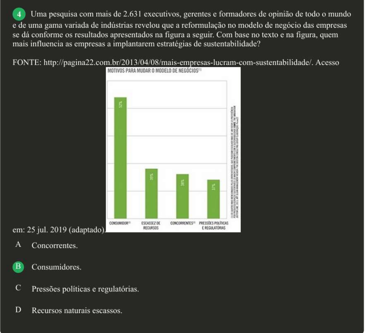 4 Uma pesquisa com mais de 2.631 executivos, gerentes e formadores de opinião de todo o mundo e de uma gama variada de indústrias revelou que a reformulação no modelo de negócio das empresas se dá conforme os resultados apresentados na figura a seguir. Com base no texto e na figura, quem mais influencia as empresas a implantarem estratégias de sustentabilidade? FONTE: :http://pagina22.com.br/2013/04/08/mais-empresas-lucram-com-sustentabilidade/ Acesso MOTIVOS PARA MUDAR 0 MODELO DE 52% 38% ESCASSEZ DE CONCORRENTES PRESSÕES em: 25 jul. 2019 (adaptado) RECURSOS A Concorrentes. Consumidores. C Pressões políticas e regulatórias. D Recursos naturais escassos.