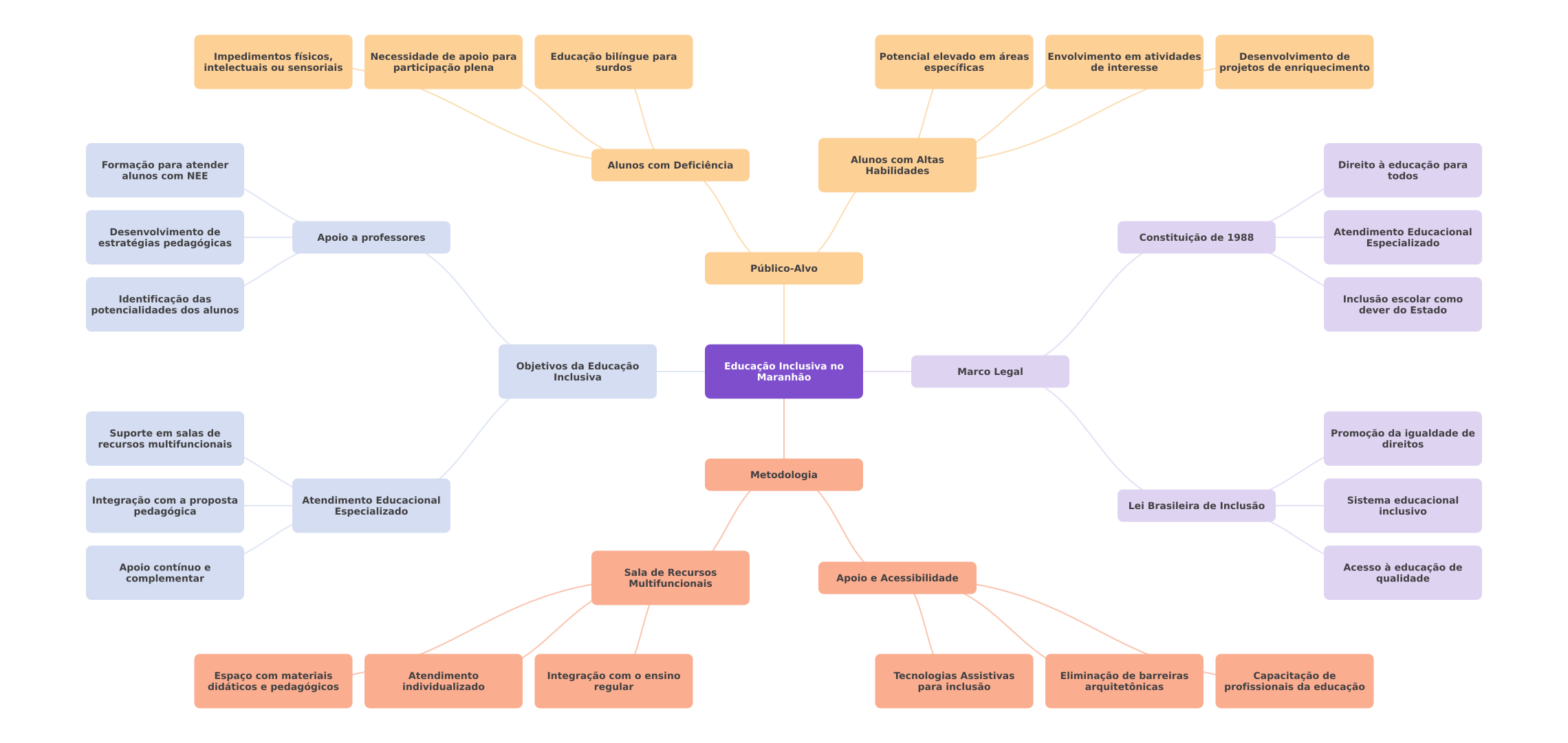Impedimentos físicos, Necessidade de apoio para Educação bilíngue para Potencial elevado em áreas Envolvimento em atividades Desenvolvimento de intelectuais ou sensoriais participação plena surdos específicas de interesse projetos de enriquecimento Alunos com Altas Formação para atender Alunos com Deficiência Habilidades Direito à educação para alunos com NEE todos Desenvolvimento de Atendimento Educacional estratégias pedagógicas Apoio a professores Constituição de 1988 Especializado Público-Alvo Identificação das Inclusão escolar como potencialidades dos alunos dever do Estado Objetivos da Educação Educação Inclusiva no Inclusiva Maranhão Marco Legal Suporte em salas de Promoção da igualdade de recursos multifuncionais direitos Metodologia Integração com a proposta Atendimento Educacional Sistema educacional Lei Brasileira de Inclusão pedagógica Especializado inclusivo Apoio contínuo e Sala de Recursos Acesso à educação de complementar Multifuncionais Apoio e Acessibilidade qualidade Espaço com materiais Atendimento Integração com ensino Tecnologias Assistivas Eliminação de barreiras Capacitação de didáticos e pedagógicos individualizado regular para inclusão arquitetônicas profissionais da educação