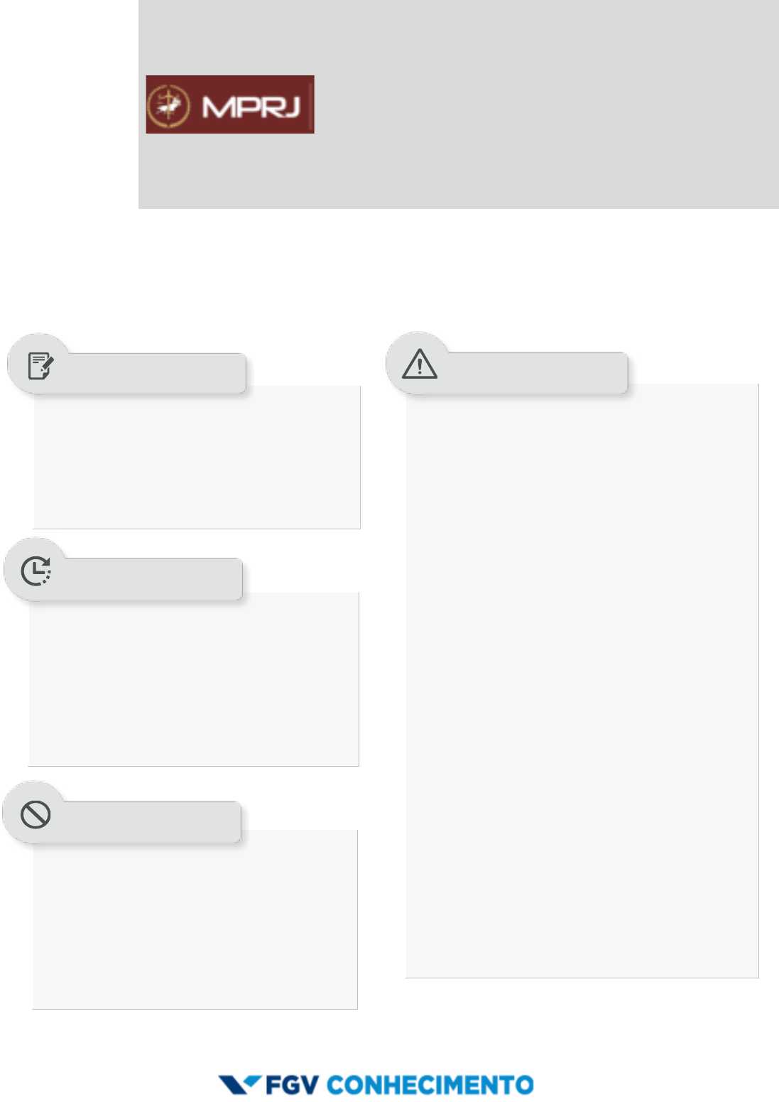 MINISTÉRIO PÚBLICO DO ESTADO DO RIO DE JANEIRO CONCURSO PÚBLICO – EDITAL 01/2025 TARDE TÉCNICO DO MINISTÉRIO PÚBLICO - ÁREA ADMINISTRATIVA NÍVEL MÉDIO TIPO 1 – BRANCA • Além deste caderno contendo 80 (oitenta) questões objetivas e 1 (uma) questão discursiva, você receberá do fiscal de prova o cartão de respostas; • As questões objetivas têm 5 (cinco) opções de resposta (A, B, C, D e E) e somente uma delas está correta. • • Verifique se seu caderno de questões está completo, sem repetição de questões ou falhas. Caso contrário, notifique imediatamente o fiscal da sala, para que sejam tomadas as devidas providências; • Confira seus dados pessoais, especialmente nome, número de inscrição e documento de identidade e leia atentamente as instruções para preencher a folha de texto definitivo; • Para o preenchimento das folhas de textos definitivos, use somente caneta esferográfica, fabricada em material transparente, com tinta preta ou azul; • Assine seu nome apenas nos espaços reservados nas folhas de textos definitivos; • Confira seu cargo, cor e tipo do caderno de questões. Caso tenha recebido caderno de cargo ou cor ou tipo diferente do impresso em suas folhas de textos definitivos, o fiscal de sala deve ser obrigatoriamente informado para o devido registro na ata da sala; • Reserve tempo suficiente para o preenchimento das suas folhas de textos definitivos. O preenchimento é de sua responsabilidade e não será permitida a troca das folhas de textos definitivos em caso de erro cometido pelo candidato; • Para fins de avaliação, serão levadas em consideração apenas as marcações realizadas nas folhas de textos definitivos; • A FGV coletará as impressões digitais dos candidatos na lista de presença; • Os candidatos serão submetidos ao sistema de detecção de metais quando do ingresso e da saída de sanitários durante a realização das provas. • Boa prova! • Você dispõe de 5 (cinco) horas para a realização da prova, já incluído o tempo para o preenchimento das folhas de textos definitivos; • 1 (uma) hora após o início da prova, é possível retirar-se da sala, sem levar o caderno de questões; • A partir dos 30 (trinta) minutos anteriores ao término da prova é possível retirar-se da sala levando o caderno de questões. • Qualquer tipo de comunicação entre os candidatos durante a aplicação da prova; • Anotar informações relativas às respostas em qualquer outro meio que não seja o caderno de questões; • Levantar da cadeira sem autorização do fiscal de sala; • Usar o sanitário ao término da prova, após deixar a sala. SUA PROVA TEMPO NÃO SERÁ PERMITIDO INFORMAÇÕES GERAIS MINISTÉRIO PÚBLICO DO ESTADO DO RIO DE JANEIRO FGV CONHECIMENTO TÉCNICO DO MINISTÉRIO PÚBLICO - ÁREA ADMINISTRATIVA – TARDE TIPO BRANCA – PÁGINA 3 Conhecimentos Gerais Língua Portuguesa 1 Uma das marcas do texto argumentativo é a presença de certas estratégias que pretendem modificar as ideias do receptor sobre uma tese. A seguir aparecem algumas dessas estratégias. Assinale a opção em que a definição da estratégia apresentada está corretamente aplicada ao seguinte texto: “Segundo o Greenpeace, a perfuração do Ártico causará um dano irreversível para o planeta”. (A) Apresentação de um caso particular que serve de ilustração do ponto de vista do emissor. (B) Inclusão no texto de palavras de um especialista no tema para apoiar com maior força a opinião do emissor. (C) Presença de uma pergunta cujo objetivo não é a resposta por parte do receptor, mas a provocação de sua reflexão. (D) Citação de uma informação numérica real que ilustra uma ideia que se está defendendo. (E) Comparação de elementos que se relacionam por sua semelhança. 2 Todos os pensamentos abaixo mostram conectores sublinhados. Assinale a frase que mostra o significado textual desse conector de forma correta. (A) Um marido não deve nunca dormir primeiro nem se levantar por último / relação adversativa. (B) Ele e eu tínhamos um escritório tão pequeno, que um centímetro a menos seria uma tragédia / relação de consequência. (C) Trabalhar dia e noite é como habitar o inferno sem poder de lá sair. (D) Se não puder abraçar as crianças, guarde-as em seu coração / relação de finalidade. (E) Nunca ajude uma criança a fazer a sua tarefa enquanto ela sentir que pode ser bem-sucedida sozinha. / relação de comparação. 3 As orações adjetivas podem ter valor restritivo ou explicativo em relação ao termo anterior. Assinale a opção em que a oração sublinhada tem valor explicativo. (A) Casamento é um romance em que o herói cresce com o passar do tempo. (B) Um casamento bem-sucedido é um edifício que deve ser reconstruído cada dia. (C) Chama-se família a um grupo de indivíduos unidos pelo sangue, que sempre se dão bem uns com os outros. (D) Um casamento feliz é uma longa conversa que sempre parece curta demais. (E) Aquele que pula a cerca está sujeito a aterrissar em qualquer lugar. 4 Assinale a frase que não mostra qualquer traço de subjetividade. (A) As sociedades modernas devem orgulhar-se da abolição da escravatura. (B) O Planeta Terra gira em torno do Sol. (C) Nada mais lindo do que as feiurinhas da pessoa amada. (D) Creio que a vida poderia ser melhor para todos. (E) É melhor ter amado e ter perdido, do que nunca ter perdido nada. 5 Assinale a frase em que o termo sublinhado não mostra valor geral, mas específico. (A) Mulheres nem sempre são frágeis. (B) Toda mulher pretende trabalhar e ser independente. (C) Livros são companheiros inseparáveis. (D) A mulher é um enigma que não se consegue decifrar. (E) A mulher amada não sai da cabeça do apaixonado. 6 Observe a seguinte frase do escritor latino Ovídio: “O homem, algumas vezes pode ser convencido. Essa é a primeira regra do jogo”. A maneira de reescrever essa frase que modifica o seu sentido orig
