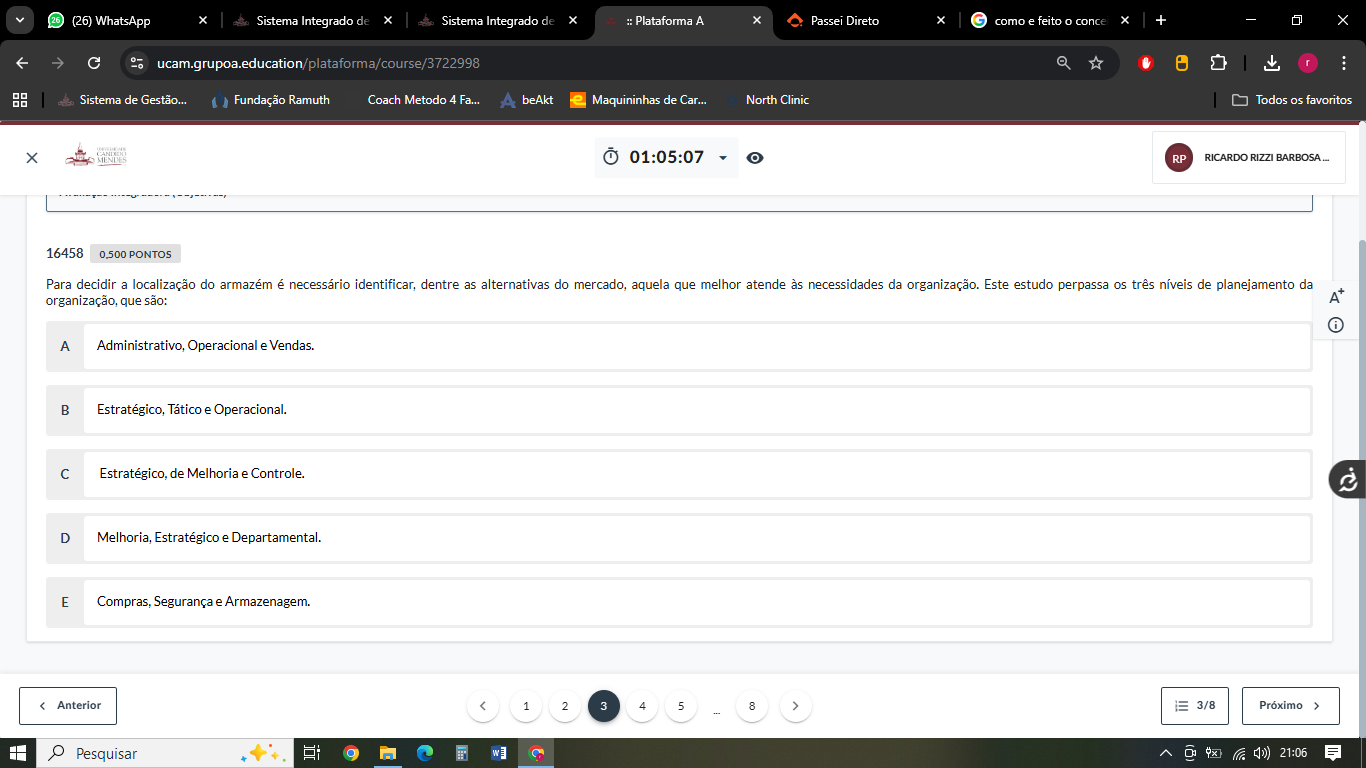 (26) WhatsApp Sistema Integrado de Sistema Integrado de Plataforma A Passei Direto G como e feito conce + X ucam.grupoa.education/plataforma/course/3722998 Γ : Sistema de Gestão... Fundação Ramuth Coach Metodo 4 Fa... beAkt Maquininhas de Car... North Clinic Todos os favoritos X MENDES 01:05:07 RP RICARDO RIZZI BARBOSA 16458 0,500 PONTOS Para decidir a localização do armazém é necessário identificar, dentre as alternativas do mercado, aquela que melhor atende às necessidades da organização. Este estudo perpassa os três níveis de planejamento da organização, que são: i A Administrativo, Operacional e Vendas. B Estratégico, Tático e Operacional. C Estratégico, de Melhoria e Controle. D Melhoria, Estratégico e Departamental. E Compras, Segurança e Armazenagem. 3/8 > Pesquisar 21:06