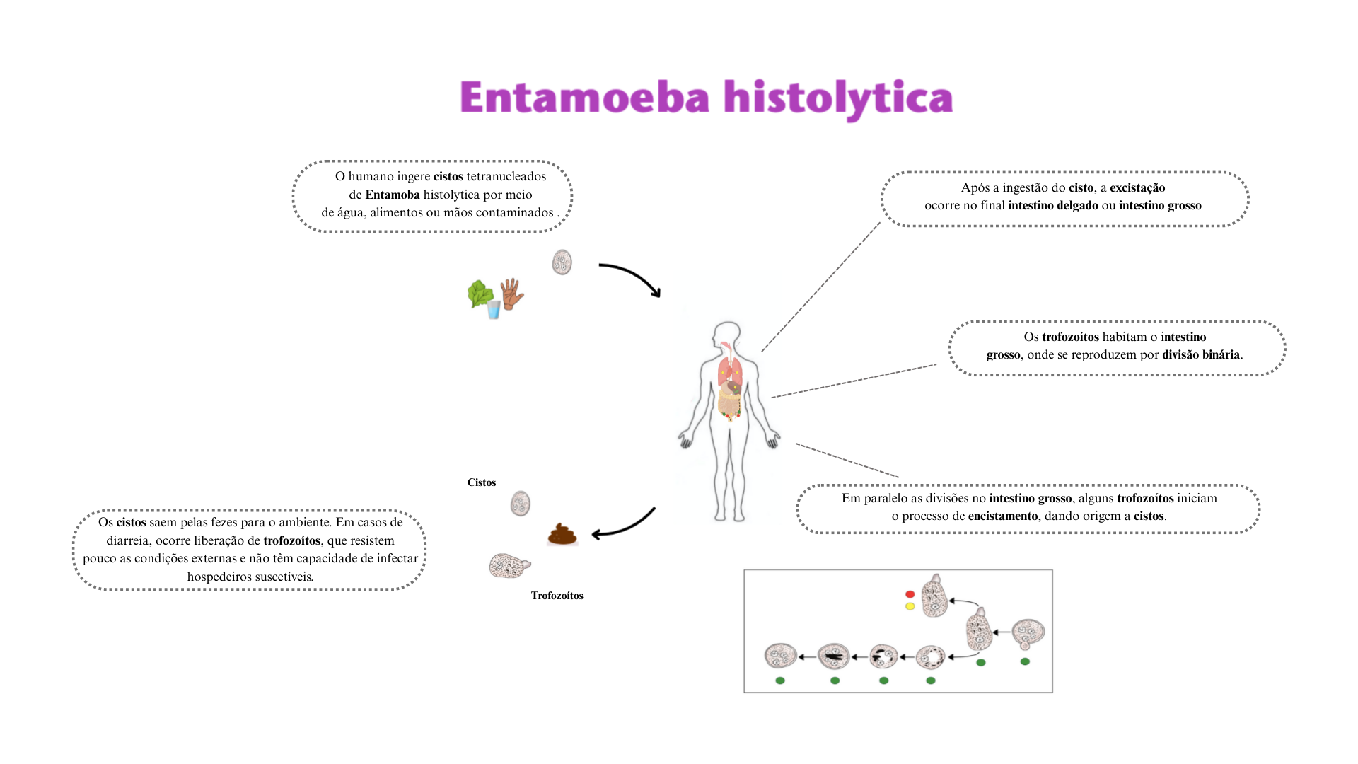Entamoeba histolytica humano ingere cistos tetranucleados de Entamoba histolytica por meio Após a ingestão do cisto, a excistação de água, alimentos ou mãos contaminados ocorre no final intestino delgado ou intestino grosso Os habitam intestino grosso, onde se reproduzem por divisão binária. Cistos Em paralelo as divisões no intestino grosso, alguns iniciam Os cistos saem pelas fezes para o ambiente. Em casos de o processo de encistamento, dando origem a cistos. diarreia, ocorre liberação de que resistem pouco as condições externas e não têm capacidade de infectar hospedeiros suscetíveis.