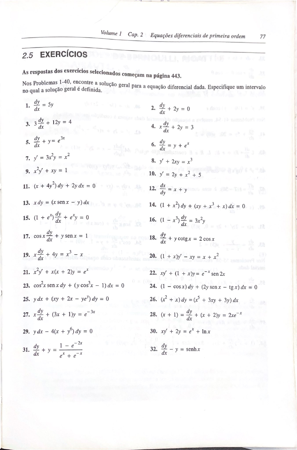 Volume 1 Cap. 2 Equações diferenciais de primeira ordem 77 2.5 EXERCÍCIOS As respostas dos exercícios selecionados começam na página 443. Nos Problemas 1-40, encontre a solução geral para a equação diferencial dada. Especifique um intervalo no qual a solução geral é definida. 2. dy + 2y = 0 3. 3 dx + 12y = 4 4. x + 2y = 3 5. + y = 6. dy dx = y + 7. y' = 3x²y = x² 8. y' + 2xy = x³ 9. + xy = 1 10. y' = 2y + x² + 5 11. (x + 4y²) dy + 2y dx = 0 12. dx dy = x + y 13. x dy = (x sen y) dx 14. (1 + dy + (xy + + x) dx = 0 15. (1 + dy dx + = 0 17. cosx + ysenx = 1 18. dy dx + y cotgx = 2 19. x dx + 4y = - x 20. (1 + x)y' - xy = x + x² 21. x 2 + x(x + 2)y = 22. xy' + (1 + x)y = x sen 2x 23. sen x dy + (y cos³x 1) dx = 0 24. (1 cosx) dy + (2y sen tgx) tg dx = 0 25. y dx + (xy + 2x dy = 0 26. (x² + x) dy = (x⁵ + + 3y) dx 27. x dy + (3x + 1)y = 3x 28. (x + 1) = dy + (x + 2)y = 2xe 29. y dx 4(x + y dy = 0 30. xy' + 2y = + In x 31. dy + y = 1 + 2x 32. y = senhx