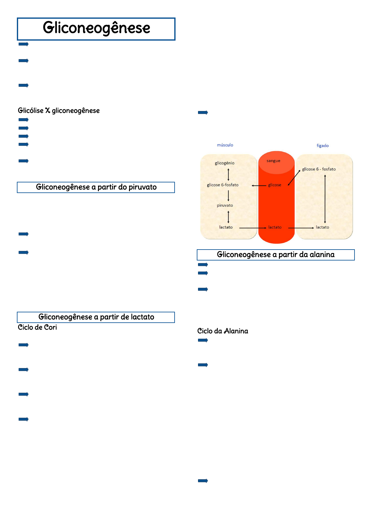 Gliconeogênese Síntese de glicose a partir de determinadas cadeias carbônicas que não são o glicogênio Tem o objetivo de não desperdiçar energia (cadeias carbônicas), além de realizar a manutenção da glicose no sangue Cérebro, eritrócitos, medula renal, cristalino, córneas e testículos Glicólise X gliconeogênese A glicólise é antagônica à gliconeogênese Glicólise: glicose → piruvato Gliconeogênese: piruvato → glicose Estado alimentado: indução da glicólise e inibição da gliconeogênese Estado jejum: indução da gliconeogênese e inibição da glicólise Gliconeogênese a partir do piruvato Piruvato carboxilase: conversão do piruvato em oxalacetato (ATP → ADP) PEP carboxiquinase: conversão do oxalacetato em fosfoenolpiruvato (GTP → GDP) O fosfoenolpiruvato pode ser formado na mitocôndria ou no citosol A síntese de fosfoenolpiruvato utiliza as enzimas da glicólise até a frutose-1,6-bifosfato Frutose - 1,6 - bifosfatase: conversão da frutose - 1,6 - bifosfato em frutose - 6 - fosfato Glicose - 6 - fosfatase: conversão da glicose - 6 - fosfato em glicose Gliconeogênese a partir de lactato Ciclo de Cori Lactato: fonte de piruvato para a gliconeogênese O lactato presente no sangue é coletado pelo fígado, e é oxidado pela lactato desidrogenase, formando o piruvato O piruvato entra na gliconeogênese para formar a glicose e voltar para o sangue ou para outros tecidos, a fim de formar ATP No eritrócito e no músculo esquelético é produzido o lactato a partir da glicose, esse lactato é encaminhado para o fígado onde se inicia o ciclo novamente O Ciclo de Cori dá 2 ATP, porém a gliconeogênese gasta 6 ATP para formar a glicose, obtendo um saldo negativo de 4 ATP, mas a glicose pode gerar, posteriormente, mais de 30 ATP, compensando esse gasto energético O oxaloacetato pode formar fosfoenolpiruvato por meio de 2 vias 1. O oxaloacetato é convertido em aspartato, o qual é enviado para o citosol. O grupo amino do aspartato vai para o αcetoglutarato que se transforma em glutamato, voltando para o interior da mitocôndria por meio de uma lançadeira. O aspartato sem esse grupo amino se torna o oxaloacetato, o qual vai formar o fosfoenolpiruvato no citosol para ser utilizado na gliconeogênese 2. O oxalacetato é convertido diretamente em fosfoenolpiruvato, o qual é bombeado para o citosol e encaminhado para a gliconeogênese (sem intermediários) Existem duas vias, pois se alguma delas estiver sobrecarregada, a outra via consegue enviar o fosfoenolpiruvato para dar continuidade ao processo de gliconeogênese Gliconeogênese a partir da alanina Intermediário: alanina Conversão de aminoácidos em piruvato ou oxaloacetato para formação da glicose Todos os aminoácidos podem ser convertidos em glicose, exceto a leucina e a lisina, uma vez que esses aminoácidos são cetogênicos e suas cadeias carbônicas formarão ácidos graxos Ciclo da Alanina Quebra da proteína em aminoácidos, os quais serão convertidos em um único aminoácido (alanina), para ser capturado pelo fígado para formar glicose Desloca a cadeia carbônica do piruvato e o hidrogênio decorrente da quebra de proteína em forma de grupo amino, formando a alanina As proteínas musculares são quebradas, liberando o grupo amino, o qual não pode ficar “solto” na célula, pois pode formar amônia ou íons amônio (tóxicos), de modo que ele tenha que se ligar ao piruvato para formar a alanina. A alanina vai para a corrente sanguínea e é capturada pelo fígado. No fígado, a alanina perde o grupo amino se tornando piruvato novamente. O piruvato é encaminhado para a gliconeogênese e o grupo amino participa da conversão em uréia A alanina pode ter dois destinos: (1) preencher a necessidade básica de energia do Krebs e (2) formação de uréia a partir do nitrogênio Lívia Francisco T28 Alanina = piruvato + grupo amino (1) No citosol, a alanina é deaminada em piruvato + grupo amino. O grupo amino se liga ao αcetoglutarato se tornando o glutamato que vai para dentro da mitocôndria. O piruvato é deslocado para dentro da mitocôndria, se tornando oxalacetato (quando o Krebs não tem necessidade da cadeia carbônica do piruvato). O oxalacetato recebe o grupo amino do glutamato, se tornando aspartato. O aspartato é lançado para o citoplasma e é encaminhado para o ciclo da uréia É preciso que essas moléculas adentrem a mitocôndria, pois é necessário verificar se essa organela não está precisando de moléculas para produção de energia. Caso não seja preciso, essas moléculas são encaminhadas para outras vias (2) No citoplasma, a alanina é deaminada em piruvato. O grupo amino se liga ao αcetoglutarato, formando o glutamato que vai para dentro da mitocôndria. O piruvato forma oxalacetato, o qual vai ser reduzido a malato e o malato vai para o citoplasma. O grupo amino do glutamato vira íon amônio e o glutamato vira αcetoglutarato. O íon amônio se liga a molécula ornitina formando a citrulina. A citrulina tem um transportador que joga ela para o ciclo da ureia Tanto o aspartato da primeira via, quanto a citrulina da segunda via vão ser encaminhadas para o ciclo da ureia São utilizados 10 ATP no total, sendo que 6 ATP são para fazer a glicose e 4 ATP são para fazer ureia Gasto total: 2 alaninas + 10 ATP + CO2 = glicose + uréia + 10 ADP + Pi O consumo excessivo de proteína, gera muita alanina e consequentemente muita uréia, o que ao longo do tempo pode sobrecarregar o rim Gliconeogênese a partir de ácidos graxos Ácidos graxos de cadeia ímpar: ao ser degradado, forma propionil CoA que forma oxaloacetato e essse forma glicose Pouca quantidade de ácido graxos pode virar glicose Glicerol - glicerol-3-fosfato - di-hidroxiacetona fosfato que pode virar glicose ou lactato Pouca quantidade de ácidos graxos de cadeia ímpar Ácidos graxos pares → Acetil CoA Ácidos graxos ímpares → glicose Gliconeogênese a partir da frutose A frutose é converti