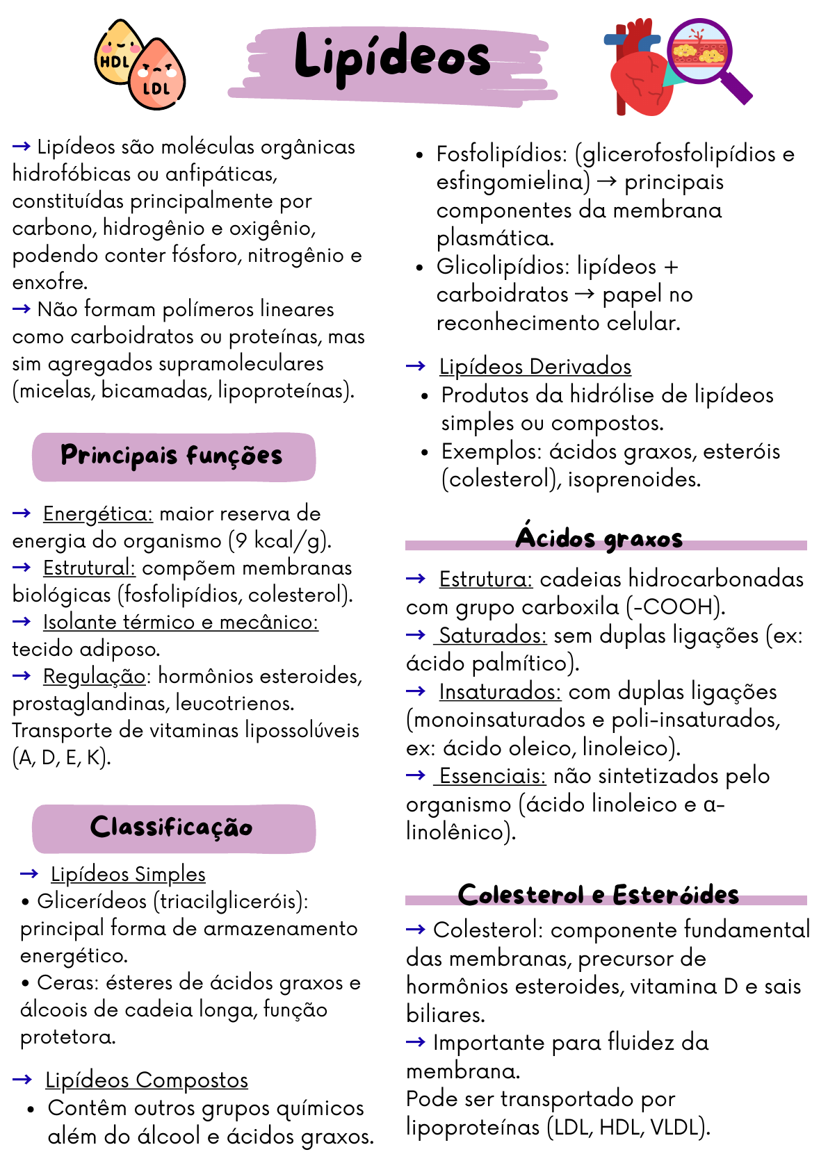 Principais funções Classificação Lipídeos → Lipídeos são moléculas orgânicas hidrofóbicas ou anfipáticas, constituídas principalmente por carbono, hidrogênio e oxigênio, podendo conter fósforo, nitrogênio e enxofre. → Não formam polímeros lineares como carboidratos ou proteínas, mas sim agregados supramoleculares (micelas, bicamadas, lipoproteínas). → Energética: maior reserva de energia do organismo (9 kcal/g). → Estrutural: compõem membranas biológicas (fosfolipídios, colesterol). → Isolante térmico e mecânico: tecido adiposo. → Regulação: hormônios esteroides, prostaglandinas, leucotrienos. Transporte de vitaminas lipossolúveis (A, D, E, K). → Lipídeos Simples • Glicerídeos (triacilgliceróis): principal forma de armazenamento energético. • Ceras: ésteres de ácidos graxos e álcoois de cadeia longa, função protetora. → Lipídeos Compostos Contêm outros grupos químicos além do álcool e ácidos graxos. Fosfolipídios: (glicerofosfolipídios e esfingomielina) → principais componentes da membrana plasmática. Glicolipídios: lipídeos + carboidratos → papel no reconhecimento celular. → Lipídeos Derivados Produtos da hidrólise de lipídeos simples ou compostos. Exemplos: ácidos graxos, esteróis (colesterol), isoprenoides. Ácidos graxos → Estrutura: cadeias hidrocarbonadas com grupo carboxila (-COOH). → Saturados: sem duplas ligações (ex: ácido palmítico). → Insaturados: com duplas ligações (monoinsaturados e poli-insaturados, ex: ácido oleico, linoleico). → Essenciais: não sintetizados pelo organismo (ácido linoleico e α- linolênico). Colesterol e Esteróides → Colesterol: componente fundamental das membranas, precursor de hormônios esteroides, vitamina D e sais biliares. → Importante para fluidez da membrana. Pode ser transportado por lipoproteínas (LDL, HDL, VLDL). Lipídeos → Complexos de lipídeos e proteínas responsáveis pelo transporte lipídico no plasma. → Classificação principal: Quilomícrons: transportam triglicerídeos da dieta. VLDL: transporta triglicerídeos endógenos. LDL: transporte de colesterol para tecidos (colesterol “ruim”). HDL: remove excesso de colesterol dos tecidos (colesterol “bom”). Metabolismo Metabolismo dos ácidos graxos Lipoproteínas Local principal: intestino delgado. Etapas: Emulsificação: sais biliares quebram grandes gotículas de gordura em partículas menores. Atuação das lipases pancreáticas: hidrolisam triglicerídeos → ácidos graxos + monoglicerídeos. Formação de micelas: facilitam o transporte dos lipídeos até a borda em escova dos enterócitos. Absorção e reesterificação: dentro do enterócito, triglicerídeos são reconstituídos. Formação dos quilomícrons: lipoproteínas que transportam os lipídeos pela linfa → circulação sistêmica. Catabolismo (β-oxidação) → Local: matriz mitocondrial. → Processo: degradação dos ácidos graxos em acetil-CoA (ciclo de 4 etapas repetitivas: oxidação, hidratação, oxidação, clivagem). → Produtos: Acetil-CoA → entra no Ciclo de Krebs. NADH e FADH₂ → cadeia respiratória (ATP). → Energia: extremamente eficiente Cetogênese → Quando: jejum prolongado, diabetes não controlado, dieta cetogênica. → Local: fígado. → Processo: excesso de acetil-CoA → corpos cetônicos (acetoacetato, β- hidroxibutirato, acetona). → Uso: tecidos extra-hepáticos (coração, cérebro em jejum prolongado). Lipídeos Anabolismo (Síntese de ácidos graxos) → Local: citosol (principalmente fígado e tecido adiposo). → Matéria-prima: acetil-CoA + NADPH. → Enzima-chave: ácido graxo sintase. → Controle hormonal: ↑ Insulina → estimula síntese (lipogênese). ↑ Glucagon/adrenalina → inibem. Metabolismo dos triglicerídeos → Lipogênese: síntese de triglicerídeos no fígado/tecido adiposo. → Lipólise: degradação dos triglicerídeos no tecido adiposo em ácidos graxos livres + glicerol (via lipase hormônio-sensível, ativada por adrenalina/glucagon). → Destino: Ácidos graxos → oxidação. Glicerol → gliconeogênese ou glicólise. → Insulina: favorece síntese e armazenamento (lipogênese, inibe lipólise). → Glucagon e adrenalina: favorecem quebra e mobilização (lipólise, β- oxidação, cetogênese). Metabolismo do colesterol → Síntese endógena: ocorre no fígado a partir do acetil-CoA. → Enzima reguladora: HMG-CoA redutase (inibida por estatinas). → Destino: membranas celulares, hormônios esteroides, vitamina D, sais biliares. → Excreção: única via de eliminação do colesterol → sais biliares pelas fezes. Regulação Hormonal