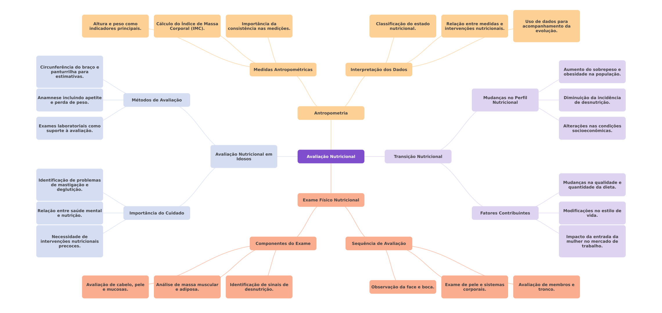 Altura e peso como Cálculo do Índice de Massa Importância da Classificação do estado Relação entre medidas e Uso de dados para indicadores principais. Corporal (IMC). consistência nas medições. nutricional. intervenções nutricionais. acompanhamento da evolução. Circunferência do braço e panturrilha para Medidas Antropométricas Interpretação dos Dados Aumento do sobrepeso e estimativas. obesidade na população. Anamnese incluindo apetite Métodos de Avaliação Mudanças no Perfil Diminuição da incidência e perda de peso. Nutricional de desnutrição. Antropometria Exames laboratoriais como Alterações nas condições suporte à avaliação. socioeconômicas. Avaliação Nutricional em Idosos Avaliação Nutricional Transição Nutricional Identificação de problemas Mudanças na qualidade e de mastigação e deglutição. quantidade da dieta. Exame Físico Nutricional Relação entre saúde mental Importância do Cuidado Fatores Contribuintes Modificações no estilo de e nutrição. vida. Necessidade de Impacto da entrada da intervenções nutricionais mulher no mercado de Componentes do Exame Sequência de Avaliação precoces. trabalho. Avaliação de cabelo, pele Análise de massa muscular Identificação de sinais de e adiposa. Observação da face e boca. Exame de pele e sistemas Avaliação de membros e e mucosas. desnutrição. corporais. tronco.