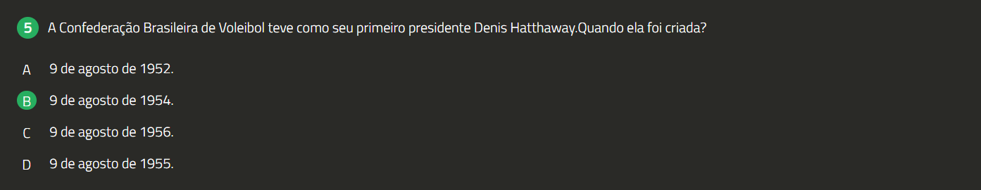 5 A Confederação Brasileira de Voleibol teve como seu primeiro presidente Denis Hatthaway.Quando ela foi criada? A 9 de agosto de 1952. 9 de agosto de 1954. 9 de agosto de 1956. D 9 de agosto de 1955.