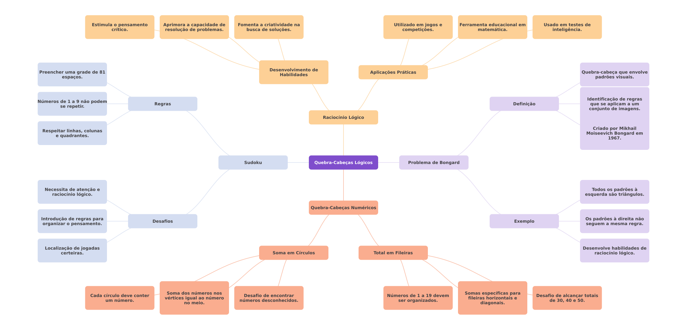 Estimula pensamento Aprimora a capacidade de Fomenta a criatividade na Utilizado em jogos e Ferramenta educacional em Usado em testes de crítico. resolução de problemas. busca de soluções. competições. matemática. inteligência. de Preencher uma grade de 81 Habilidades Aplicações Práticas Quebra-cabeça que envolve espaços. padrões visuais. Identificação de regras Números de 1 a 9 não podem se repetir. Regras Definição que se aplicam a um conjunto de imagens. Raciocínio Lógico Respeitar linhas, colunas Criado por Mikhail Moiseevich Bongard em e quadrantes. 1967. Sudoku Quebra-Cabeças Lógicos Problema de Bongard Necessita de atenção e Todos os padrões à raciocínio lógico. esquerda são triângulos. Quebra-Cabeças Numéricos Introdução de regras para Desafios Exemplo Os padrões à direita não organizar pensamento. seguem a mesma regra. Localização de jogadas Desenvolve habilidades de certeiras. Soma em Círculos Total em Fileiras raciocínio lógico. Soma dos números nos Cada círculo deve conter Desafio de encontrar Números de 1 a 19 devem Somas específicas para fileiras horizontais e Desafio de alcançar totais um número. vértices igual ao número números desconhecidos. ser organizados. de 30, 40 e 50. no meio. diagonais.