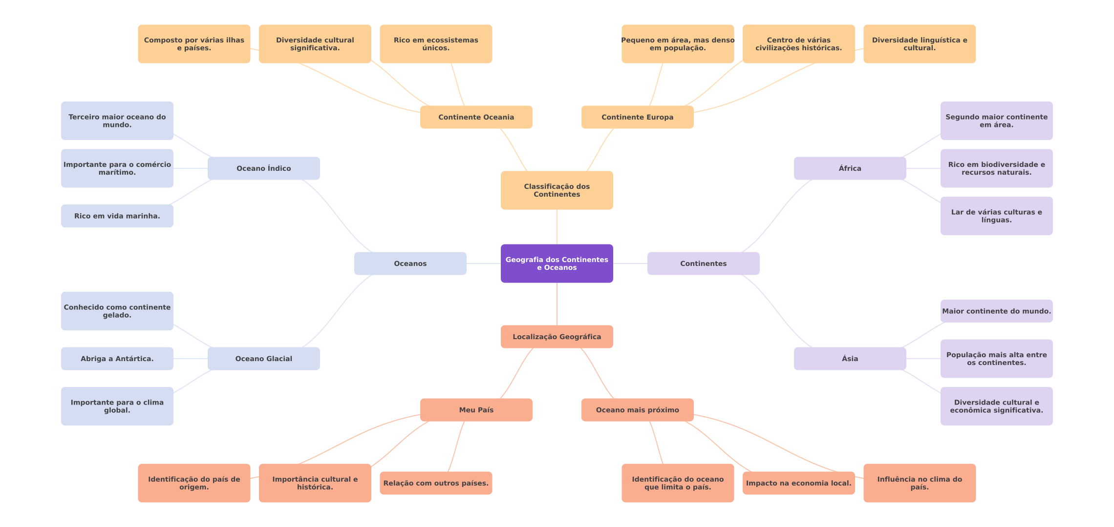 Composto por várias ilhas Diversidade cultural Rico em ecossistemas Pequeno em área, mas denso Centro de várias Diversidade linguística e e países. significativa. únicos. em população. civilizações históricas. cultural. Terceiro maior oceano do Continente Oceania Continente Europa Segundo maior continente mundo. em área. Importante para comércio Rico em biodiversidade e Oceano Índico marítimo. recursos naturais. Classificação dos Continentes Lar de várias culturas e Rico em vida marinha. línguas. Oceanos Geografia dos Continentes Continentes e Oceanos Conhecido como continente Maior continente do mundo. gelado. Localização Geográfica Abriga a Antártica. Oceano Glacial Ásia População mais alta entre os continentes. Importante para clima Diversidade cultural e global. Meu País Oceano mais próximo econômica significativa. Identificação do país de Importância cultural e Identificação do oceano Influência no clima do origem. histórica. Relação com outros países. que limita país. Impacto na economia local. país.
