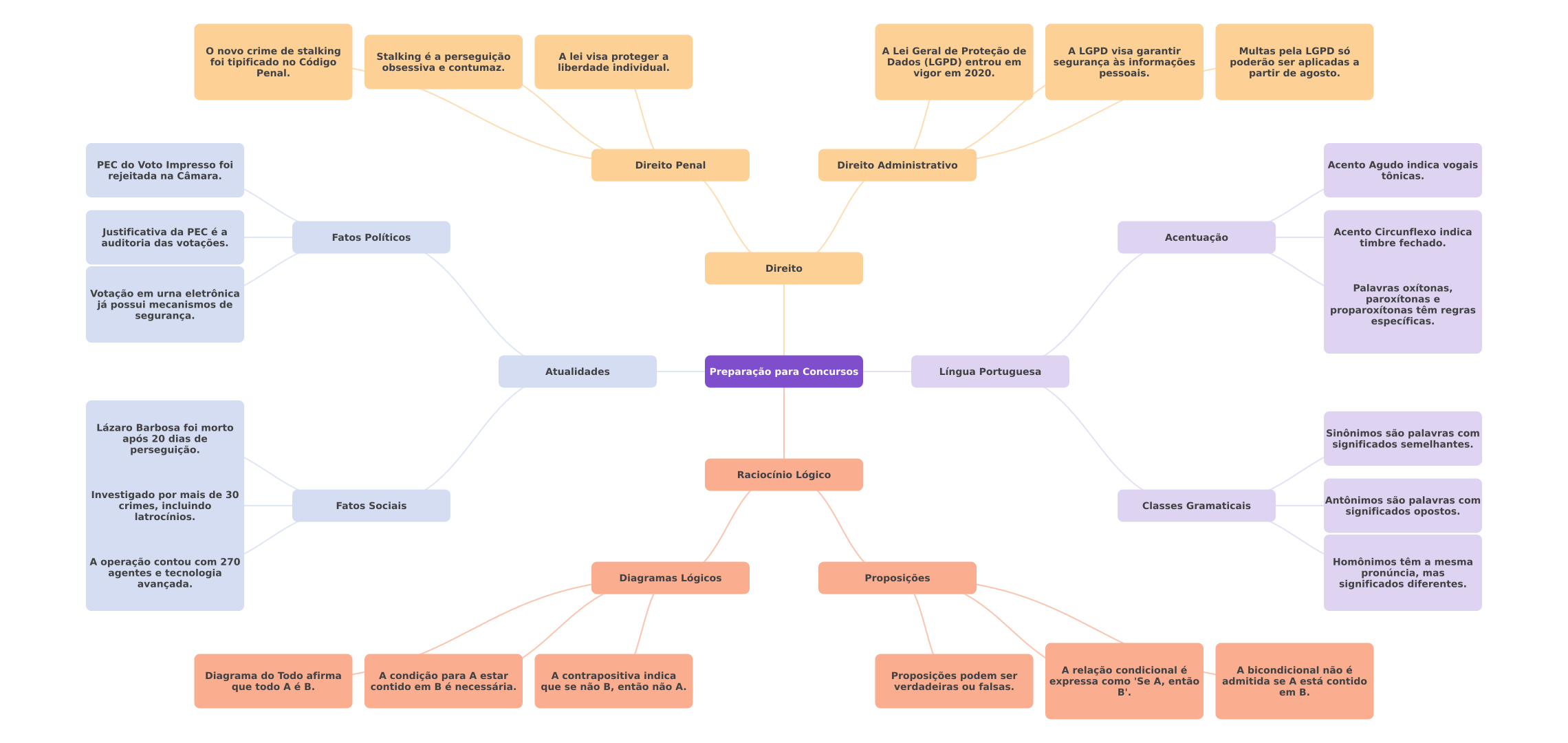 novo crime de stalking Stalking é a perseguição A lei visa proteger a A Lei Geral de Proteção de A LGPD visa garantir Multas pela LGPD só foi tipificado no Código liberdade individual. Dados (LGPD) entrou em obsessiva e contumaz. segurança às informações poderão ser aplicadas a Penal. vigor em 2020. pessoais. partir de agosto. do Voto Impresso foi Direito Penal Direito Administrativo Acento Agudo indica vogais rejeitada na Câmara. tônicas. Justificativa da PEC é a Acento Circunflexo indica Fatos Políticos auditoria das votações. Acentuação timbre fechado. Direito Palavras oxítonas, Votação em urna eletrônica já possui mecanismos de e têm regras segurança. específicas. Atualidades Preparação para Concursos Língua Portuguesa Lázaro Barbosa foi morto após 20 dias de Sinônimos são palavras com significados semelhantes. perseguição. Raciocínio Lógico Investigado por mais de 30 crimes, incluindo Fatos Sociais Classes Gramaticais Antônimos são palavras com latrocínios. significados opostos. A operação contou com 270 Homônimos têm a mesma agentes e tecnologia Diagramas Lógicos Proposições pronúncia, mas avançada. significados diferentes. Diagrama do Todo afirma A condição para A estar A contrapositiva indica A relação condicional é A bicondicional não é Proposições podem ser que todo A é B. contido em é necessária. que se não então não verdadeiras ou falsas. expressa como 'Se então admitida se A está contido B'. em B.