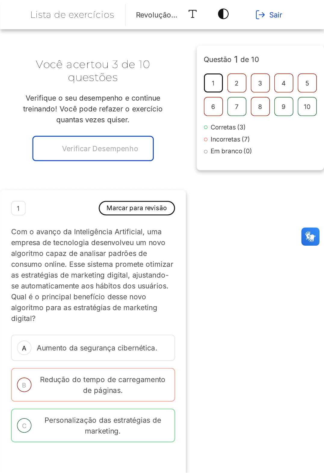 25/08/2025 17:42 https://estacio.saladeavaliacoes.com.br/exercicio/68acca9c7c9b235dfbabaeec/gabarito/ https://estacio.saladeavaliacoes.com.br/exercicio/68acca9c7c9b235dfbabaeec/gabarito/ 1/14 Você acertou 3 de 10 questões Verifique o seu desempenho e continue treinando! Você pode refazer o exercício quantas vezes quiser. Verificar Desempenho A B C 1 Marcar para revisão Com o avanço da Inteligência Artificial, uma empresa de tecnologia desenvolveu um novo algoritmo capaz de analisar padrões de consumo online. Esse sistema promete otimizar as estratégias de marketing digital, ajustando- se automaticamente aos hábitos dos usuários. Qual é o principal benefício desse novo algoritmo para as estratégias de marketing digital? Aumento da segurança cibernética. Redução do tempo de carregamento de páginas. Personalização das estratégias de marketing. Questão 1 de 10 Corretas �3� Incorretas �7� Em branco �0� 1 2 3 4 5 6 7 8 9 10 Lista de exercícios Revolução… Sair 25/08/2025 17:42 https://estacio.saladeavaliacoes.com.br/exercicio/68acca9c7c9b235dfbabaeec/gabarito/ https://estacio.saladeavaliacoes.com.br/exercicio/68acca9c7c9b235dfbabaeec/gabarito/ 2/14 D E Diminuição dos custos de infraestrutura de TI. Expansão do alcance geográfico da empresa. Resposta incorreta Opa! A alternativa correta é a letra C. Confira o gabarito comentado! Gabarito Comentado O novo algoritmo de Inteligência Artificial, ao analisar padrões de consumo online, possibilita a personalização das estratégias de marketing digital. Esta personalização é fundamental para aumentar a eficácia das campanhas, ao se adaptarem aos interesses específicos dos usuários. 2 Marcar para revisão A empresa "GeoTracer" é especializada em sistemas de geolocalização. Recentemente, ela percebeu a necessidade de se adaptar às novas tendências de mercado e está considerando investir em tecnologias como Big Data para melhorar seu serviço de mapeamento e fornecer informações de tráfego em tempo real aos usuários. Considerando o texto, analise as afirmativas abaixo: I��O Big Data surgiu como consequência do crescimento da internet e dos dispositivos 25/08/2025 17:42 https://estacio.saladeavaliacoes.com.br/exercicio/68acca9c7c9b235dfbabaeec/gabarito/ https://estacio.saladeavaliacoes.com.br/exercicio/68acca9c7c9b235dfbabaeec/gabarito/ 3/14 A B C D E móveis. II��A aplicação prática do Big Data pode ser vista em aplicativos de geolocalização que fornecem condições de tráfego em tempo real. III��A maioria das empresas não vê o Big Data como um ativo estratégico, mas apenas como uma ferramenta técnica. Marque a alternativa correta. Apenas a Afirmativa I está correta. Apenas a Afirmativa II está correta. Apenas as Afirmativas I e II estão corretas. Apenas as Afirmativas I e III estão corretas. Apenas a Afirmativa III está correta. Resposta incorreta Opa! A alternativa correta é a letra B. Confira o gabarito comentado! Gabarito Comentado O Big Data já era utilizado por empresas antes do surgimento da internet. Portanto, a Afirmativa I está incorreta. A Afirmativa II está correta, pois aplicativos de geolocalização, como o Waze, utilizam o Big Data para fornecer condições de tráfego em tempo real. Já a Afirmativa III está incorreta, pois as empresas estão 25/08/2025 17:42 https://estacio.saladeavaliacoes.com.br/exercicio/68acca9c7c9b235dfbabaeec/gabarito/ https://estacio.saladeavaliacoes.com.br/exercicio/68acca9c7c9b235dfbabaeec/gabarito/ 4/14 A B C D E começando a entender o valor estratégico do Big Data. 3 Marcar para revisão A "TechNovo" busca adaptar-se às novas tendências e deseja implementar soluções de Inteligência Artificial �IA�. Considerando o texto, analise as afirmativas abaixo: I�� A Inteligência Artificial �IA) não possui relevância no cenário de transformação digital atual. II��A IA pode influenciar significativamente as rotinas de consumidores e organizações. III��O conceito de Internet das Coisas �IoT) é idêntico ao de Inteligência Artificial �IA�. Marque a alternativa correta. Apenas a Afirmativa I está correta. Apenas a Afirmativa II está correta. Apenas as Afirmativas I e II estão corretas. Apenas as Afirmativas I e III estão corretas. Apenas a Afirmativa III está correta. 25/08/2025 17:42 https://estacio.saladeavaliacoes.com.br/exercicio/68acca9c7c9b235dfbabaeec/gabarito/ https://estacio.saladeavaliacoes.com.br/exercicio/68acca9c7c9b235dfbabaeec/gabarito/ 5/14 A B Resposta incorreta Opa! A alternativa correta é a letra B. Confira o gabarito comentado! Gabarito Comentado A Inteligência Artificial �IA) desempenha um papel crucial na transformação digital, tornando a afirmativa I incorreta. De fato, a IA tem um impacto significativo nas rotinas e operações. A afirmativa III também está incorreta, pois IA e IoT são conceitos distintos. 4 Marcar para revisão As ferramentas de IA disponíveis para aplicação em estratégias de negócios estão cada vez mais eficientes e ajudam a transformar a jornada de compras de cada cliente em uma experiência praticamente única e exclusiva. Nesse sentido, os chatbots podem ser entendidos como: Um robô virtual que tenta simular um ser humano ao conversar com pessoas para dar informações, tirar dúvidas e automatizar algumas etapas do atendimento ao cliente. Um robô virtual que otimiza estoques, capturando dados do consumo real das lojas e propondo o reabastecimento de acordo com a demanda. 25/08/2025 17:42 https://estacio.saladeavaliacoes.com.br/exercicio/68acca9c7c9b235dfbabaeec/gabarito/ https://estacio.saladeavaliacoes.com.br/exercicio/68acca9c7c9b235dfbabaeec/gabarito/ 6/14 C D E Um robô virtual que calcula os preços flutuantes das passagens de avião ou a tarifa dinâmica do Uber, que varia de acordo com horário e dia de utilização do serviço. Um robô do Google que consegue entender melhor o que os usuários estão tentando loc