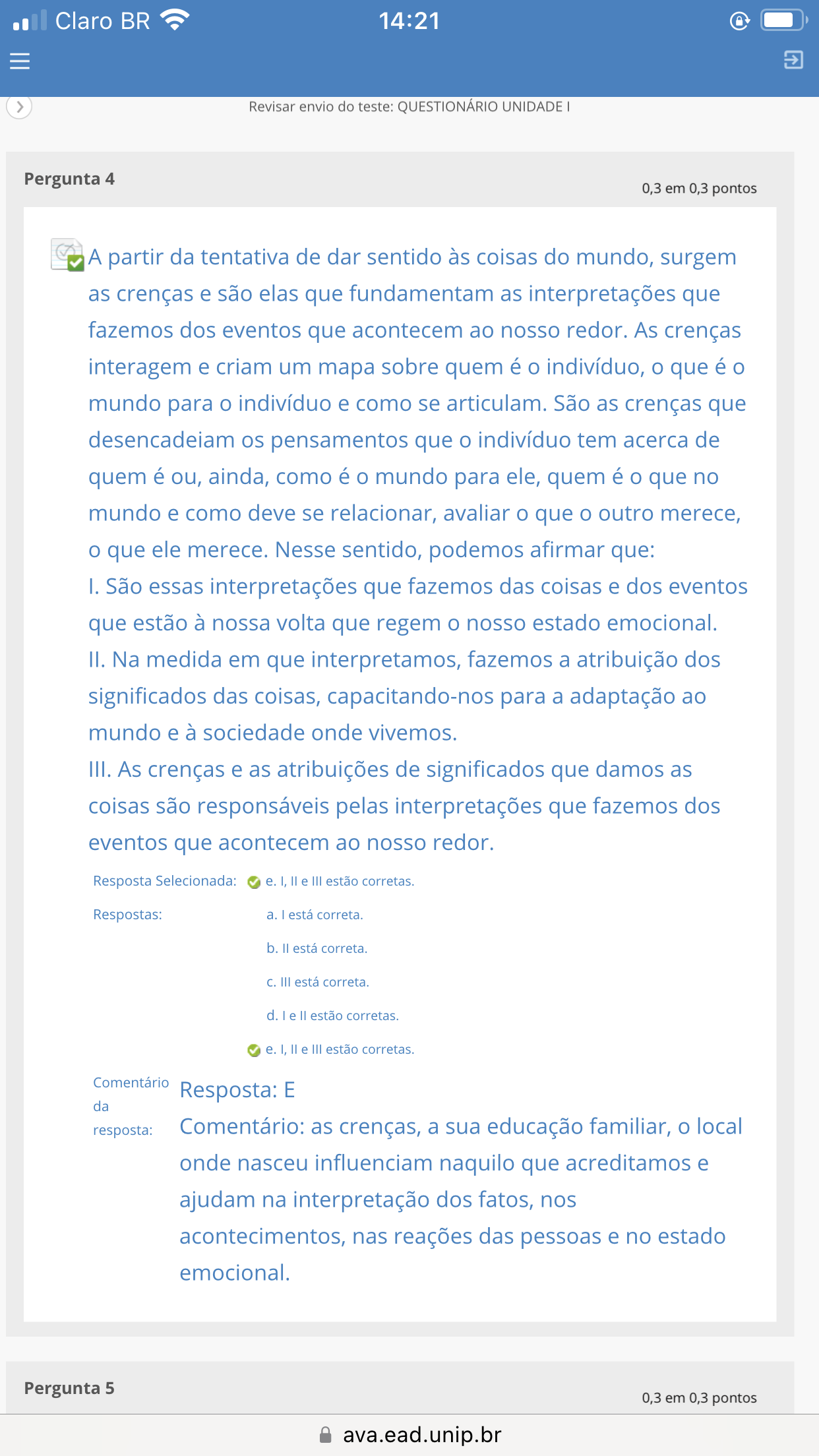 Claro BR 14:21 Revisar envio do teste: QUESTIONÁRIO UNIDADE I Pergunta 4 0,3 em 0,3 pontos A partir da tentativa de dar sentido às coisas do mundo, surgem as crenças e são elas que fundamentam as interpretações que fazemos dos eventos que acontecem ao nosso redor. As crenças interagem e criam um mapa sobre quem é indivíduo, que é mundo para indivíduo e como se articulam. São as crenças que desencadeiam os pensamentos que indivíduo tem acerca de quem é ou, ainda, como é mundo para ele, quem é que no mundo e como deve se relacionar, avaliar que outro merece, o que ele merece. Nesse sentido, podemos afirmar que: I. São essas interpretações que fazemos das coisas e dos eventos que estão à nossa volta que regem nosso estado emocional. II. Na medida em que interpretamos, fazemos a atribuição dos significados das coisas, capacitando-nos para a adaptação ao mundo e à sociedade onde vivemos. III. As crenças e as atribuições de significados que damos as coisas são responsáveis pelas interpretações que fazemos dos eventos que acontecem ao nosso redor. Resposta Selecionada: e. I, e III estão corretas. Respostas: a. I está correta. b. II está correta. C. III está correta. d. le II estão corretas. e. I, II e III estão corretas. Comentário Resposta: E da resposta: Comentário: as crenças, a sua educação familiar, local onde nasceu influenciam naquilo que acreditamos e ajudam na interpretação dos fatos, nos acontecimentos, nas reações das pessoas e no estado emocional. Pergunta 5 0,3 em 0,3 pontos 8 ava.ead.unip.br