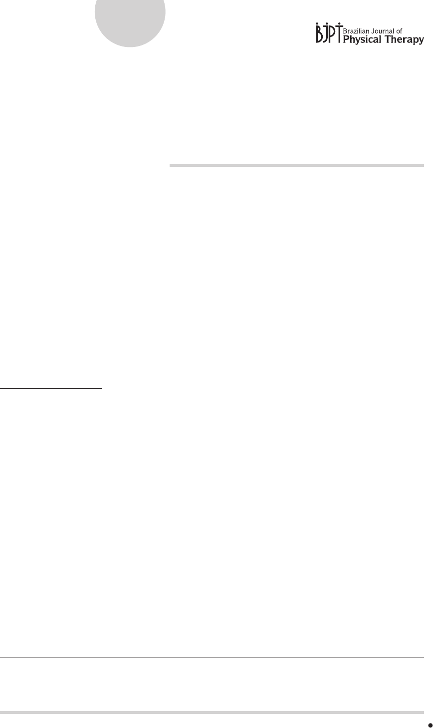 1 Departamento de Fisioterapia, Universidade Federal de São Carlos (UFSCar), São Carlos, SP, Brasil 2 Departamento de Fisioterapia, Centro Universitário Central Paulista (UNICEP), São Carlos, SP, Brasil 3 Departamento de Estatística, UFSCar, São Carlos, SP, Brasil Received: 02/28/2013 Revised: 07/21/2013 Accepted: 09/19/2013 o r i g i n a l a r t i c l e Determination of exacerbation predictors in patients with COPD in physical therapy – a longitudinal study Determinação dos preditores de exacerbação nos pacientes com DPOC em tratamento fisioterapêutico – estudo longitudinal Diego M. Marino1, Kamilla T. Marrara1,2, Juliano F. Arcuri1, Cecília Candolo3, Maurício Jamami1, Valéria A. Pires Di Lorenzo1 ABSTRACT | Background: Chronic obstructive pulmonary disease (COPD) typically presents the characteristic clinical condition of exacerbation, with more intense symptoms associated with greater functional loss and consequently lower chances of patient survival. Objectives: This study sought to determine the predictors of exacerbation, alone or in combination, in patients with chronic obstructive pulmonary disease (COPD) who received physical therapeutic treatment over 6 months. Method: This was an observational, longitudinal and prospective study in which 63 COPD patients residing within the municipality of São Carlos, SP, Brazil were evaluated. These patients had COPD stages II and III and were entered into a physical therapy program, consisting of 3 periods of assessment over 6 months. We evaluated the occurrence of acute exacerbation as well as the patients’ body mass index (BMI), fat-free mass (FFM), fat-free mass index, forced expiratory volume in 1 second (FEV 1 ), dyspnea, distance walked (DW) in the 6-minute walk test (6MWT) and handgrip strength. Results: When applying Cox settings with each covariate separately, the results revealed 5% significance only for the DW in the 6MWT, which demonstrated an interaction between BMI and FFM. Comparison of the 3 periods of assessment across the covariates measured showed a significant difference only for the DW between evaluations in the 3rd and 6th months. Conclusion: Upon analyzing the predictors of risk over 6 months of follow-up in patients with COPD, we found that the DW in the 6MWT was associated with the risk of exacerbation, although this risk also depended on the covariates BMI and FFM. Keywords: COPD; physical exertion; physical therapy; survival; rehabilitation. Clinical Trials.gov Identifier: NCT01464736 HOW TO CITE THIS ARTICLE Marino DM, Marrara KT, Arcuri JF, Candolo C, Jamami M, Pires Di Lorenzo VA. Determination of exacerbation predictors in patients with COPD in physical therapy – a longitudinal study. Braz J Phys Ther. 2014 Mar-Apr; 18(2):127-136. http://dx.doi. org/10.1590/S1413-35552012005000146 RESUMO | Contextualização: A doença pulmonar obstrutiva crônica (DPOC) normalmente cursa com condições clínicas características de exacerbação e, quanto maior o número delas, maior é a ocorrência de perda funcional e, consequentemente, menores são as chances de sobrevida dos pacientes. Objetivos: Determinar os preditores de exacerbação, isoladamente ou em interação, em pacientes com DPOC em tratamento fisioterapêutico ao longo de seis meses. Método: Trata-se de um estudo observacional, longitudinal e prospectivo, no qual foram avaliados 63 pacientes com DPOC estágios II e III, do município de São Carlos, SP, Brasil, inseridos em um programa fisioterapêutico, por meio de três períodos de avaliação ao longo de seis meses, quanto à ocorrência de exacerbação, bem como quanto ao índice de massa corpórea (IMC), massa magra (MM), índice de massa magra (IMM), volume expiratório forçado no primeiro segundo (VEF 1 ), dispneia, distância percorrida (DP) no teste de caminhada de seis minutos (TC6) e força de preensão palmar. Resultados: Ao aplicar os ajustes de Cox com cada uma das covariáveis separadamente, observou- se significância de 5% apenas para a DP no TC6, a qual demonstrou interação com o IMC e também com a MM. Na comparação dos três períodos de avaliação quanto às covariáveis avaliadas, observou-se diferença significativa apenas para a DP entre as avaliações do 3º e 6º mês. Conclusão: Ao longo de seis meses de acompanhamento dos pacientes com DPOC quanto aos preditores de risco, pode-se observar que a DP no TC6 é um determinante no risco de exacerbação, no entanto depende das covariáveis IMC e MM. Palavras-chave: DPOC; esforço físico; fisioterapia; sobrevivência; reabilitação. Clinical Trials.gov Identifier: NCT01464736 127 Braz J Phys Ther. 2014 Mar-Apr; 18(2):127-136http://dx.doi.org/10.1590/S1413-35552012005000146 Marino DM, Marrara KT, Arcuri JF, Candolo C, Jamami M, Pires Di Lorenzo VA Introdução A doença pulmonar obstrutiva crônica (DPOC) normalmente evolui com algumas condições clínicas características de exacerbação, manifestando diferentes formas clínicas e gravidade1,2. A exacerbação é definida como aumentos agudos nos sintomas respiratórios que excedam a variação diária normal e que levem à necessidade de mudanças nas medicações regularmente em uso pelo paciente, caracterizando a exacerbação da DPOC3 e/ou uso de recursos de saúde4. A característica mais frequente da exacerbação é o aumento da dispneia, o que obriga o paciente a procurar os cuidados de saúde1,2. No entanto, há também evidências de redução da tolerância aos esforços físicos, sendo que, em pacientes com exacerbações frequentes, a inatividade física é ainda mais acentuada, tornando-os mais susceptíveis a novas exacerbações5. De acordo com Donaldson et al.6, quanto maior o número de exacerbações, maior é a ocorrência de perda funcional e, consequentemente, segundo Cardoso1, menores são as chances de sobrevida dos pacientes com DPOC. Segundo Beghé et al.7, a exacerbação da DPOC refere-se a uma exacerbação dos sintomas 