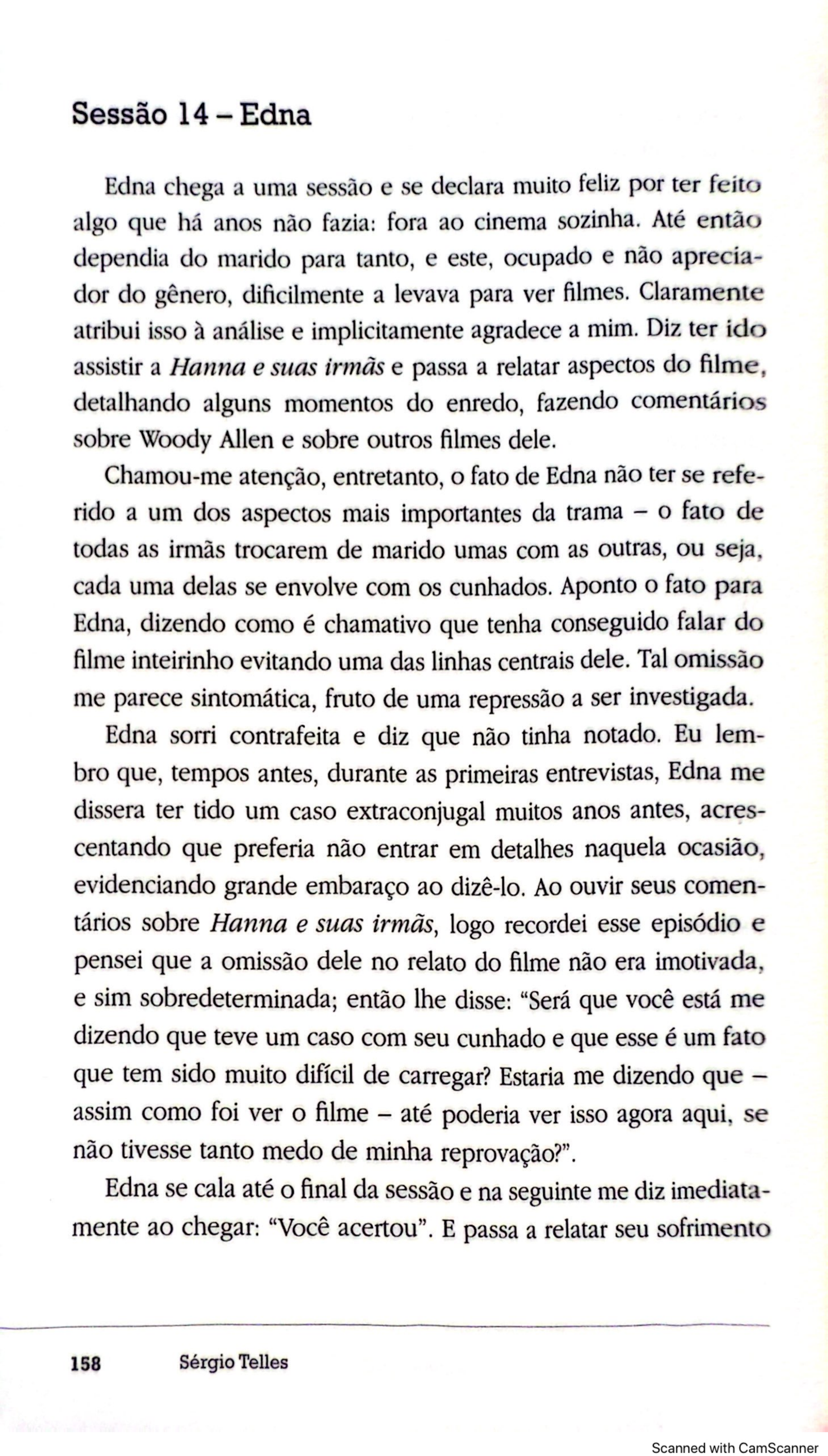 Sesséo 14 - Edna Edna chega a um sessiio e se declarer muto feliz por ter feito ago que he anus neo fazia- fora ao cinema sozinha. Até entéo dependia do marido para tanto, e Este, ocupado e no aprecia- dor do género, dificilmente a levava para ver files. Claramente atribui isso a analise e implicitamente agradece a mm. Diz ter do assistir a Hanna e seas irmds e passer a relater aspectos do ftlme, detalhando alguns rnomentos do erred, fazendo comentarios sobre Woody Allen e sobre outros Ftlrnes dele. Chamou-me atengao, entretanto, o fate de Edna no ter se refe- rido a urn dos aspectos mais importantes da trams - o fate de todas as irma trocarem de marido mas com as outras, on sea, ada um deles se evolve com os cunhados. Aponto o fate para Edna, dizendo Como é chamativo we ten ha conseguido alar do frlme inteirinho evitando um das linhas centrals dele. Tal omissao me parece sintomatica, fruto de uma repressao a ser investigada. Edna sorri contrafeita e diz que no tinha notado. Eu lem- bro que, tempos antes, durante as primeiras entrevistas, Edna me dissert ter tide um case extraconjugal muitos anus antes, acres- centando que preferia no entrar em detalhes raquela ocasiao, evidenciando grande embargo ao dizzy-lo. Ao ouvir sens comen- t8rios sobre Hanna e sues irma"s, logo recorder esse episOdic e pensei que a omiss8o dele no relate do Hlme no era imotivada. e Sim sobredeterminada; ent8o the disse: "Sera que voce esta me dizendo que teve um case com seu cunhado e que esse é um fate que tem side muto dificil de carregar? Estaria me dizendo que - assisi Como for ver o Hlme - ate poderia ver isso agora qui, se no tivesse tanto redo de minha reprovac8o?" . Edna se cola ate o final da sessao e na seguinte me diz imediata- mente ao chegar: "Voce acertou". E passer a relater seu sofrimento 158 Sérgio Telles Scanned with Car Scanner https://v3.camscanner.com/user/download raquela ocasiio, pois seu case com O cunhado tinha side desco- berto por um prima we passara a desprezé-»la acintosamente. Comentérios Edna conscientemente me agradece, apresentando Como um conquista do anélise O fate de ester Indo ao cinema. Poderiarnos interpretor a gratidio e alegria do analisanda com OS progresses da anélise e neo teriamos entendido we ludo min passava de um aplacamento frente a urn analise vivid persecutoriamente, we poderia censure-la e castigé-la, Como logo se view. A partir de um escuta descentrada, que privilege O esque- cido, a dfwida, aquilo que aparentemente no tem import§ncia, chegou-se a um pequena constmgao que trouxe inu'meros escla- recimentos no $6 sobre O period mais recente da Vida da ana- lisanda, no case a culpa em relagao 8 irina e a angUstia por ter um prima tornado conhecimento do fate, Hgura que atualizava no analise, Como também tornou possivel entender varies outros elements do passado mais remote de Edna e Como ludo isso se refletia em sens sintomas atuais. Dessa forma, por no apresentar as mesas represses que a analisanda - para mencionar a con- txatransferéncia -, for possivel completer as alfas do discurso, preacher claros, com elements que la mesa me tinha forne- cido, "esrnigalhados", "trimrados" ao passarem pelo "desfiladeiro do consciéncia", e pude recompé-los "Como se fosse um quebra- -cabega chinas", para user algumas images do préprio Freud. I _ Fragmentos Clinicos de Psicanélise 159 Scanned with Car Scanner https://v3.camscanner.com/user/download