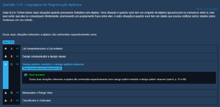 Questão 7/10 - Linguagem de Programação Aplicada Ler em voz alta [Aula 4] Em Python existe uma maneira de criar listas de forma rápida e fácil. É...