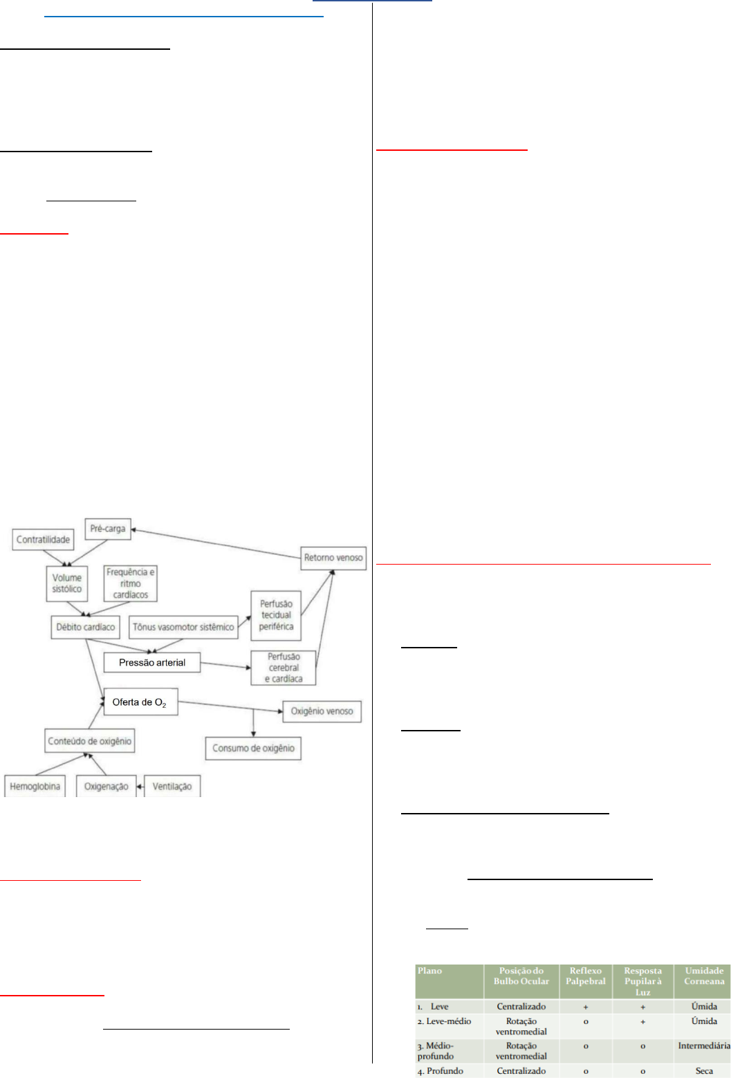 ANESTESIOLOGIA MONITORAÇÃO DO PACIENTE ANESTESIADO: Os propósitos da anestesia? • Inconsciência. • Amnesia. • Analgesia. • Imobilidade. Emergências anestésicas => são imprevisíveis, tem início muito rápido e são devastadoras (se não entrar com tratamento rápido). Para evitar isso: MONITORAÇÃO ANESTÉSICA. Introdução: • Focos primários da monitoração de pacientes anestesiados: ➢ Profundidade da anestesia. ➢ Consequências cardiovasculares e pulmonares. ➢ Temperatura. • Plano muito leve de anestesia: ➢ Não atinge os objetivos básicos da anestesia. • Plano muito profundo: ➢ Alterações cardiopulmonares adversas. • Monitoração – vários parâmetros. • Cada medida define somente ela mesma: ➢ Não pode ser usada para definir o estado geral. ➢ Avaliar o máximo de parâmetros individuais possíveis. ➢ Análise de todos – estimar o funcionamento do organismo como um todo. Com base na frequência cardíaca se avalia o DC e consequentemente a pressão arterial. Observar volume, se precisar, fazer fluido para elevar os parâmetros. Mortalidade anestésica: ➢ Complicações, são muito comuns durante a anestesia. Se a taxa de monitoração for alta, a taxa de complicação é baixa. ➢ Mortalidade. ➢ Reconhecimento precoce. Como monitorar? • Registro: criterioso e registrado em planilha. • Plano anestésico / Analgesia / Sinais Vitais. • Quando iniciar a monitoração e quando parar? = a partir que injetei o primeiro fármaco, não precisa anotar, mas já monitorar e parar quando o paciente tive recuperação total do paciente na anestesia. • Intervalos? = 5 em 5 minutos, pois é um tempo favorável ainda que pode intervir em alguma complicação, como uma parada por exemplo. Profundidade anestésica: • Propósitos da profundidade anestésica correta: ➢ Evitar a consciência. ➢ Evitar a nocicepção. ➢ Evitar a movimentação do animal. • Evitar nível de anestesia excessivo: ➢ Hipoventilação. ➢ Hipoxemia. ➢ Hipotensão. ➢ Perfusão tecidual inadequada. ➢ Recuperação prolongada. • Fatores determinantes da profundidade anestésica: ➢ Quantidade de fármacos anestésicos no cérebro = quanto mais fármacos utilizados, maior a concentração no cérebro. Por isso se utiliza uma anestesia balanceada, para diminuir a quantidade de anestésicos ao paciente, com usos analgésicos por exemplo. ➢ Magnitude da estimulação cirúrgica (ou ambiental) = fazer o máximo de silêncio possível para não acordar o paciente. ➢ Condições subjacentes: P. ex., hipotermia. Profundidade anestésica: avaliação dos SINAIS FÍSICOS Profundidade anestésica: tradicionalmente dividida em estágios e planos. • Estágio I: acordado até a perda de consciência. ➢ Estado de consciência. ➢ Alteração do estado de consciência. ➢ Perda de consciência – fim do estágio I. • Estágio II: Estágio de excitação inconsciente = muitas vezes a depender do fármaco e o animal pode rosnar ou até morder. ➢ Movimentos musculares espontâneos. • Estágio III: DESEJADO (1 para o 3). ➢ Estágio de anestesia cirúrgica. ➢ Perda progressiva de reflexos. Planos anestésicos do estágio III: ➢ Plano 1 – normalmente o animal está muito responsivo – pode acordar facilmente e com reflexos. ➢ Plano 2 – plano de anestesia ideal - PROVA. ➢ Plano 3 – aceitável para alguns procedimentos. ➢ Plano 4 – muito profundo. ANESTESIOLOGIA Importante avaliar: posição do bulbo ocular e reflexo palpebral. Plano 4 com posição centralizado, animal muito deprimido e pode ir a óbito, por isso verificar o reflexo para confirmar qual plano está. = Para prova: citar os parâmetros do estagio 3 e plano 2. Respostas fisiológicas à nocicepção incluem aumentos abruptos na frequência cardíaca, pressão arterial ou frequência respiratória em resposta ao estímulo cirúrgico. • Estágio IV: ➢ Depressão extrema do SNC. ➢ Parada respiratória. ➢ Necessidade de reversão imediata deste estágio. Animais raramente se comportam segundo os livros: = Sinais consistentes simultâneos de dois ou mais planos. = Dúvida? = escolher plano mais leve. • Tônus mandibular – cães e gatos: ➢ Total – leve. ➢ Parcial – médio. ➢ Ausente – profundo = movimento muito fácil. ➢ Filhotes = não tem tônus mandibular ainda, será fácil abrir a boca mesmo que até acordado. • Tônus mandibular: ➢ Grandes animais – tônus muito maior. ➢ Ruminantes e suínos – reflexo de mastigação, mesmo que anestesiado, isso é comum. • Respiração abdominal = quando aprofundam na anestesia esse é o tipo de anestesia. • Reflexo pupilar: parassimpatolíticos (fármacos que dilatam pupila -se atentar). • Bulbo ocular – o que observar? ➢ Cetamina não rotaciona bulbo ocular. ➢ Equinos: = Não há tanta rotação. = Nistagmo lento – nível médio de anestesia. = Nistagmo rápido. = Lacrimejamento. ➢ Ruminantes e suínos. = Pode ocorrer nistagmo. = Rotação ventral. Sempre é possível monitorar os sinais físicos? = não é possível, como por exemplo uma cirurgia cervical, uma vez que os sinais físicos em sua maioria são na cabeça. SISTEMA CARDIOVASCULAR: • Frequência e ritmo cardíaco: ➢ Estetoscopia (cardíaco e esofágico) – mais básico. • Frequência cardíaca: ➢ Altamente variável em animais normais: ➢ Cães de grande porte: 60-120 bpm. ➢ Cães de pequeno porte: 80-160 bpm. ➢ Gatos: 120-220 bpm. ➢ Cavalos: 35-45 bpm. ➢ Pequenos ruminantes: 70-90 bpm. Problema da bradicardia ou taquicardia excessiva? = redução de DC = não chega oxigênio no cérebro e coração. Causas mais comuns de BRADICARDIA: Saber umas 3 causas para a prova. Causas mais comuns de TAQUICARDIA: Saber umas 3 causas para prova. Quando tratar uma Bradicardia? • Não existe um consenso. • Tratamento conservativo: quando 20-30% abaixo do normal. • Situações nas quais deve ser tratada? = quand