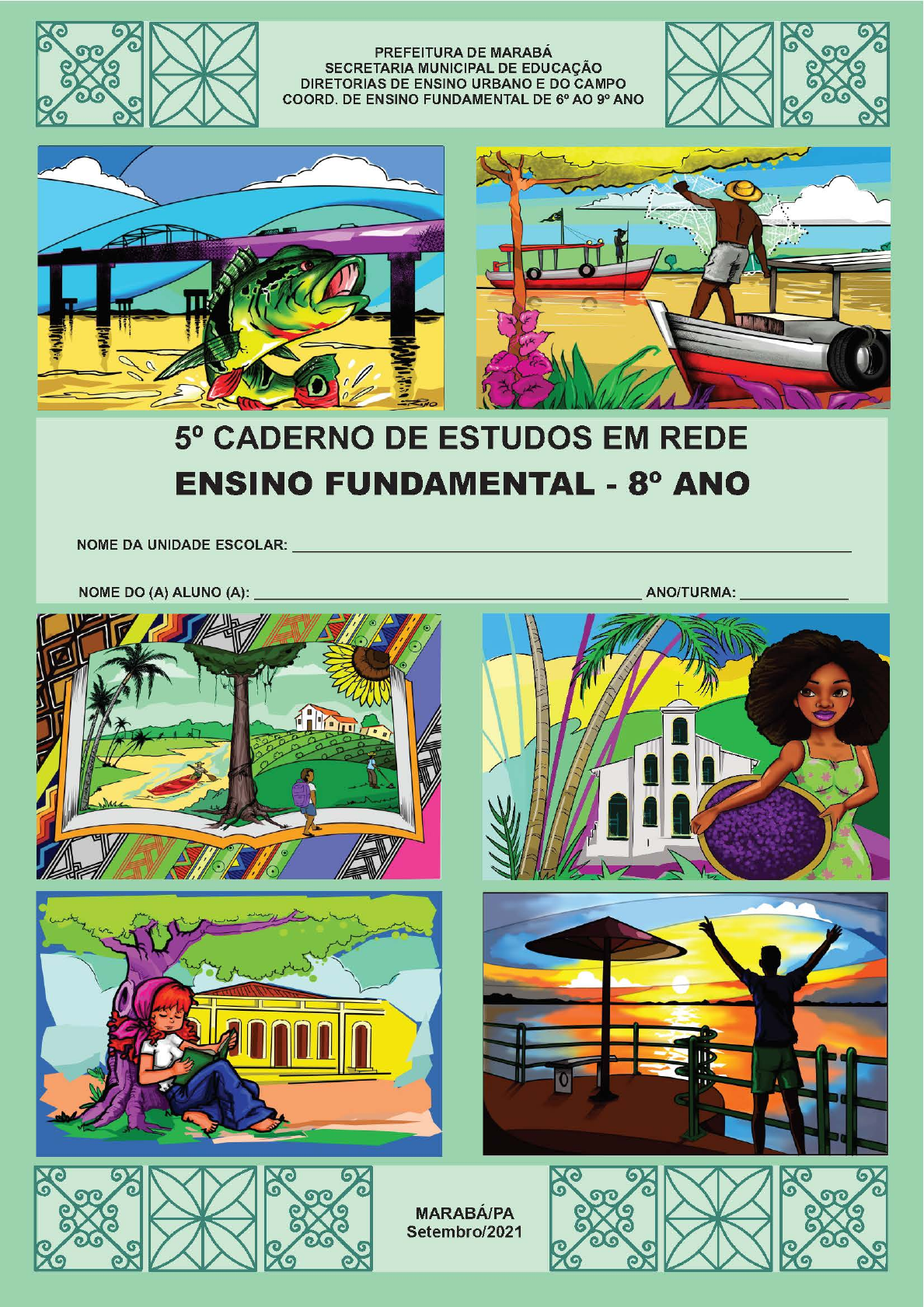 PREFEITO MUNICIPAL Sebastião Miranda Filho SECRETÁRIA MUNICIPAL DE EDUCAÇÃO Marilza De Oliveira Leite SECRETÁRIO MUNICIPAL ADJUNTO DE EDUCAÇÃO José Orlando Lima de Moraes DIRETOR DE ENSINO URBANO Fábio Rogério Rodrigues Gomes DIRETOR DE ENSINO DO CAMPO Ademar da Luz Filho COORDENADOR DO 6º AO 9º ANO - URBANO Manoel Izaque Amorim COORDENADOR DO 6º AO 9º ANO - CAMPO Jonas Souza Barreira ELABORAÇÃO DO CADERNO DE ESTUDO Língua Portuguesa Maria Edna de Brito Santos Arte Sandriana Rodrigues da Silva Educação Física Shirley Lima Calandrini Língua Inglesa Eva Maria Bueno de Oliveira Matemática Maria José Lopes de Araújo Ciências Maiana Maia Sousa Geografia Francilete Souza de Almeida História Aldair José Dias Carneiro Estudos Amazônicos Aldair José Dias Carneiro Ensino Religioso Roselli Scheidegger Oliveira Página | 2 CARTA AO ESTUDANTE Olá, querido(a) aluno(a) Sabemos que você está com saudade da escola, no entanto, esse retorno não será possível ainda. Portanto, diante desse cenário incerto, a Secretaria Municipal de Educação – SEMED produziu este material didático que possibilita a você, aluno da rede de ensino público do Município de Marabá/Pa, o aprofundamento de seus conhecimentos. Explore cada espaço deste caderno, ele é seu! Este 5º caderno de estudo foi elaborado para contribuir com a sua aprendizagem. Nele, você encontrará uma diversidade de atividades de Língua Portuguesa, Artes, Educação Física, Língua Inglesa, Matemática, Ciências da Natureza, História, Geografia, Estudos Amazônicos e Ensino Religioso que o(a) ajudará a ampliar os conhecimentos necessários ao bom desempenho escolar. Por meio deste, serão vivenciadas situações de aprendizagem e oportunidades de compartilhar novos saberes com sua família. Essa proposta de atividades não presenciais contempla e dá continuidade ao processo educativo e, com orientação de seu professor(a) e de sua família, você terá autonomia para desenvolvê-las. Lembrando que o erro faz parte do processo de aprendizagem e, por isso, se sentir dificuldade em realiza-las, não desista! Tenha paciência e peça ajuda sempre que necessário. Para realização dessas atividades, sugerimos que você organize um cronograma/rotina, separando um momento do dia só para estudar. Evite distrações e concentre-se nas atividades! Anote tudo, inclusive as dúvidas para saná-las com seu/sua professor(a). Esperamos que você utilize este caderno de estudo de forma responsável e prazerosa, pois, somente assim, ele atingirá os objetivos aos quais se propõe. Desejamos que passem ótimos momentos com sua família e que aproveitem as atividades que estão aqui! Bons estudos e sucesso! Página | 3 Página | 4 1) (EF89LP01MB) Leia o texto e responda: Meu primeiro nome é José, assim me chamava Don’Ana, a mãe. O segundo é Ademir, como preferia Waldemar, o Braz e pai. Por economia e preguiça, prefiro Ademir Braz. Nasci no Canto Verde, ali entre o Granito e a oficina/estaleiro do Mestre Leobaldo, à margem do Itacayunas. Foi em 1947, meados do século XX, logo depois da 2ª. Guerra Mundial e de uma das maiores enchentes da nossa história. Na cidadezinha isolada por terra e ilhada pelas enchentes, com luz elétrica precária, muito verde, água, e espaço para divertir-se, minha infância foi uma felicidade constante entre a escola pública, os campos de pelada, o Pirucaba e a praia do Tucunaré. Sou Jornalista desde 1972. Advogado, a partir de 2000. Poeta desde a eternidade. Membro efetivo e perpétuo da Academia de Letras do Sul e Sudeste Paraense, fundada em 26.09.2008. Publiquei os seguintes livros: “Esta Terra” (dez/1980 jan/1981) “Antologia Tocantina” (1997) “Rebanho de pedras” (2003) Estão prontos para revisão e lançamento (quando Deus e o Diabo permitirem): “O verde e ácido cacho de murici” (crônicas); “A terra mesopotâmica do sol” (poesia) “Lua de Jade” (poesia); “A bela dos moinhos azuis” (contos) Há um romance em andamento. - Onde já trabalhei em todos esses anos? Xiii! É tanto lugar!... Jornais: “A Província do Pará”, “O Estado de S. Paulo”, “Gazeta Mercantil Pará”, “O Marabá”, “Jornal de Vanguarda”, “Opinião”, “Correio do Tocantins”, “Convergência”. TV Liberal Marabá. Prefeituras de Marabá e de São João do Araguaia. Assembléia Legislativa do Estado do Pará. Alguns quereres Músicas: Todas as de Louis Armstrong, James Brown, Renato Russo, Ney Matogrosso, Phil Collins, Michael Jackson, Chico Buarque, meus parceiros Nilson Chaves, Néviton Ferreira, Dauro Remor, Javier, Ricardo Smith e Wada Paz Livros de cabeceira: Por autores e influência – Fernando Pessoa, Paes Loureiro, William Faulkner, Graciliano Ramos, Machado de Assis, Rubem Braga, James Joyce, Albert Camus, Rajneeshi, Carlos Castañeda, John dos Passos, Jean-Paul Sartre, Florbela Espanca. Filmes marcantes: O homem de Kiev; O poderoso chefão; De repente, no último verão; O predador; Alien, o 8º passageiro; Drácula, de Bran Stoker; Tropa de Elite; Vidas Secas, Easy Rider. Cantoras Preferidas: Gal, Betânia, Tânia Alves, Nilva Burjack, Ângela Maria. Atores: Anthony Hopkins, Samuel L. Jackson, Jean Reno Atriz: Dominique Sanda (por onde andará?) Hobby: cultivar orquídeas, juntar livros, escrever, ver filmes na televisão. Comida: unha de caranguejo, camarão de Mosqueiro, churrasco com cerveja, maniçoba, pato no tucupi. Chocolate branco. Pupunha, uxi, cupuaçu. Sorvetes, idem. Vícios: cerveja boa, literatura, papo cabeça, churrasco ao ponto, uma aguardente mineira. Por favor, não me ofereçam brega, música sertaneja ou religiosa. Página | 5 Sonho de consumo: um jarrinho solitário, de cristal, para colocar uma rosa vermelha sobre a escrivaninha. Nunca tive um! Mulher bonita: A moça que está comigo, minha amada e namorada. Ídolos: meus raros amigos. Uma definição pessoal: Vivo assim, ao acaso. Um desejo, uma rosa murcha sobre o vaso