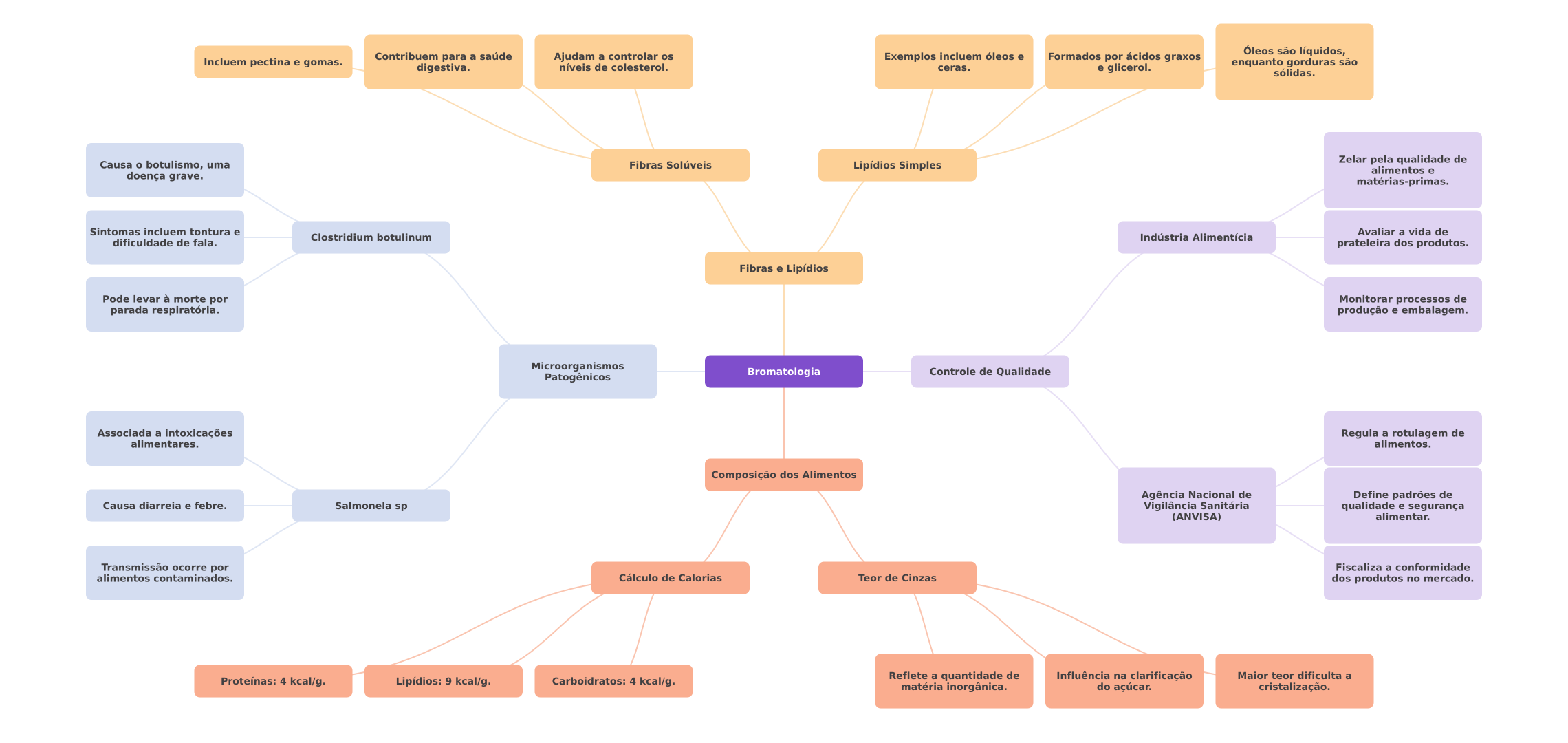 Contribuem para a saúde Ajudam a controlar os Exemplos incluem óleos e Formados por ácidos graxos Óleos são líquidos, Incluem pectina e gomas. digestiva. níveis de colesterol. ceras. e glicerol. enquanto gorduras são sólidas. Fibras Solúveis Zelar pela qualidade de Causa botulismo, uma Lipídios Simples alimentos e doença grave. matérias-primas. Sintomas incluem tontura e Avaliar a vida de Clostridium botulinum Indústria Alimentícia dificuldade de fala. prateleira dos produtos. Fibras e Lipídios Pode levar à morte por Monitorar processos de parada respiratória. produção e embalagem. Microorganismos Patogênicos Bromatologia Controle de Qualidade Associada a intoxicações Regula a rotulagem de alimentares. alimentos. Composição dos Alimentos Agência Nacional de Define padrões de Causa diarreia e febre. Salmonela sp Vigilância Sanitária qualidade e segurança (ANVISA) alimentar. Transmissão ocorre por Fiscaliza a conformidade alimentos contaminados. Cálculo de Calorias Teor de Cinzas dos produtos no mercado. Carboidratos: 4 kcal/g. Reflete a quantidade de Influência na clarificação Maior teor dificulta a Proteínas: 4 kcal/g. Lipídios: 9 kcal/g. matéria inorgânica. do açúcar. cristalização.