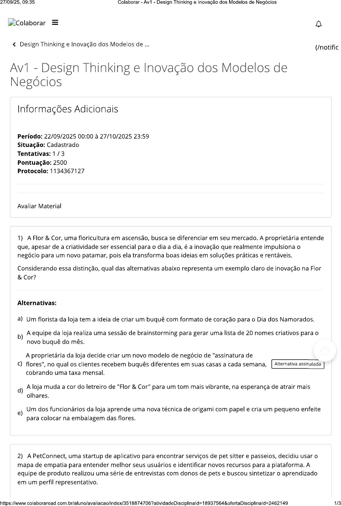 27/09/25, 09:35 Colaborar Av1 Design Thinking e Inovação dos Modelos de Negócios Colaborar III27/09/25, 09:35 Colaborar Av1 Design Thinking e Inovação dos Modelos de Negócios Com base neste contexto, analise as afirmativas a seguir: I. A equipe deve garantir que mapa de empatia reflita os principais pontos em comum das entrevistas, evitando que perfil criado seja uma descrição isolada de um único cliente. II. Para construir mapa, a equipe pode usar informações de entrevistas, mas também observações diretas, como que cliente faz ou diz ao interagir com o aplicativo. III. O mapa de empatia, por ser baseado em histórias reais, dispensa a necessidade de validação posterior, garantindo que a solução desenvolvida atenderá 100% das necessidades do usuário. Assinale a alternativa correta: Alternativas: a) Somente a afirmativa está correta. b) Apenas as afirmativas e estão corretas. Alternativa assinalada c) Apenas as afirmativas I e III estão corretas. d) Apenas as afirmativas e III estão corretas. e) Todas as afirmativas estão corretas. 3) A Pet Feliz, uma loja de produtos e serviços para animais de estimação, busca inovar em seu modelo de negócio para se destacar no mercado. Para isso, a equipe de gestão decidiu aplicar a metodologia do Design Thinking, que se baseia nos pilares de empatia, cocriação e experimentação. Com base nesse cenário, analise as afirmativas a seguir: I. A empatia é utilizada para entender os hábitos, as necessidades e os desafios dos donos de pets, por meio de observações e entrevistas. II. A cocriação se manifesta ao convidar clientes, veterinários e adestradores para uma oficina de ideias, onde todos colaboram na criação de novos serviços, como um spa para animais ou um serviço de delivery personalizado de ração. III. A experimentação é a prática de testar uma nova linha de brinquedos interativos em pequena escala, coletando feedback rápido de um grupo de clientes antes de iniciar a produção em larga escala. Assinale a alternativa correta: Alternativas: a) Somente a alternativa está correta. b) Somente a alternativa está correta. c) Apenas as alternativas e estão corretas. d) Apenas alternativas e III estão corretas. e) Todas as alternativas estão corretas. Alternativa assinalada 4) 2/327/09/25, 09:35 Colaborar Av1 - Design Thinking e Inovação dos Modelos de Negócios A Onda Azul, uma empresa de peixes congelados, busca se diferenciar em um mercado competitivo. A gestão entende que, para inovar, não basta apenas ter produtos de qualidade; é preciso repensar toda a experiência do cliente e o modelo de negócio. Para isso, a equipe decidiu aplicar a metodologia do Design Thinking. Com base nesse cenário, qual etapa do Design Thinking seria fundamental para a Onda Azul entender melhor seus clientes e identificar novas oportunidades de negócio? Alternativas: A etapa de prototipagem, que consiste em criar rapidamente uma embalagem nova e testá-la em um a) grupo de clientes-alvo. b) A etapa de ideação, que se restringe a uma sessão de brainstorming interna com a equipe de marketing para pensar em novos sabores de peixe. c) A etapa de definição, que se resume a listar os problemas da empresa, como a alta concorrência e a dificuldade de logística. A etapa de empatia, onde a empresa realiza entrevistas e observações com os d) consumidores para entender seus hábitos de compra, desafios no preparo de peixe e Alternativa assinalada o que eles valorizam em uma refeição saudável. A etapa de análise, que se limita a estudar os relatórios financeiros de concorrentes para copiar seus e) modelos de sucesso. 5) A Delícias do Frango, uma franquia de frango frito, planeja lançar uma nova linha de sanduíches para o mercado. Para reduzir as incertezas e os riscos do projeto, a equipe de inovação decide utilizar a prototipação, que permite testar as ideias de forma rápida e com baixo custo antes de investir na produção em larga escala. Com base nesse contexto, analise as afirmativas a seguir e classifique-as como (V) verdadeiro ou (F) falso: A equipe pode criar um protótipo com ingredientes mais acessíveis para testar a combinação de sabores com um grupo de clientes, economizando recursos financeiros. () Um protótipo da nova linha de sanduíches precisa ser obrigatoriamente idêntico ao produto final em todos os seus aspectos, incluindo embalagem e ingredientes, para que teste seja válido. A prototipação permite à franquia identificar rapidamente, por meio do feedback dos clientes, se uma ideia de sanduíche não é bem aceita, evitando desperdício de tempo e dinheiro na produção final. Assinale a alternativa correta: Alternativas: a) Alternativa assinalada c) 3/3