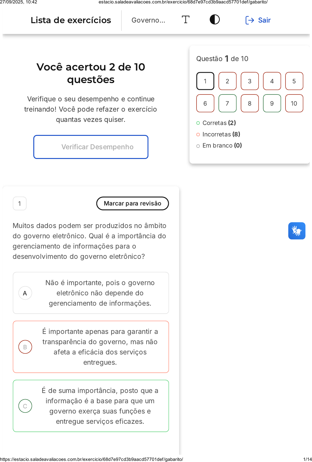 Você acertou 2 de 10 questões Verifique o seu desempenho e continue treinando! Você pode refazer o exercício quantas vezes quiser. Verificar Desempenho A B C 1 Marcar para revisão Muitos dados podem ser produzidos no âmbito do governo eletrônico. Qual é a importância do gerenciamento de informações para o desenvolvimento do governo eletrônico? Não é importante, pois o governo eletrônico não depende do gerenciamento de informações. É importante apenas para garantir a transparência do governo, mas não afeta a eficácia dos serviços entregues. É de suma importância, posto que a informação é a base para que um governo exerça suas funções e entregue serviços eficazes. Questão 1 de 10 Corretas (2) Incorretas (8) Em branco (0) 1 2 3 4 5 6 7 8 9 10 Lista de exercícios Governo… Sair 27/09/2025, 10:42 estacio.saladeavaliacoes.com.br/exercicio/68d7e97cd3b9aacd57701def/gabarito/ https://estacio.saladeavaliacoes.com.br/exercicio/68d7e97cd3b9aacd57701def/gabarito/ 1/14 D E É importante apenas para garantir a segurança dos dados, mas não afeta a eficácia dos serviços entregues. Não é importante, pois o desenvolvimento do governo eletrônico depende apenas da colaboração organizacional. Resposta incorreta Opa! A alternativa correta é a letra C. Confira o gabarito comentado! Gabarito Comentado A informação é a base para que um governo exerça suas funções. Por isso, o gerenciamento de informações se mostra extremamente importante para o desenvolvimento de um governo eletrônico cujo objetivo é a entrega de serviços eficazes e com maior responsabilidade e transparência. 2 Marcar para revisão O governo eletrônico é uma tendência crescente em todo o mundo, que tem como objetivo melhorar a eficiência, a transparência e a acessibilidade dos serviços públicos. Governo eletrônico, consiste, portanto, 27/09/2025, 10:42 estacio.saladeavaliacoes.com.br/exercicio/68d7e97cd3b9aacd57701def/gabarito/ https://estacio.saladeavaliacoes.com.br/exercicio/68d7e97cd3b9aacd57701def/gabarito/ 2/14 A B C D E No uso de aplicativos eletrônicos conectados à rede mundial de computadores para dificultar o acesso a serviços governamentais. Na utilização de aplicativos eletrônicos conectados à internet para simplificar o acesso aos serviços governamentais. Na proibição do uso de tecnologia no governo. No uso de cartas e telegramas para prover serviços governamentais. No uso exclusivo de atendimento presencial para prover serviços governamentais. Resposta incorreta Opa! A alternativa correta é a letra B. Confira o gabarito comentado! Gabarito Comentado Como podemos definir um governo eletrônico? Podemos defini-lo como o uso de aplicativos eletrônicos conectados à rede mundial de computadores para facilitar o acesso a serviços governamentais. Desse modo, ele consegue prover melhores serviços à população. Um governo eletrônico também é chamado de e- governo ou, em inglês, e-government. 27/09/2025, 10:42 estacio.saladeavaliacoes.com.br/exercicio/68d7e97cd3b9aacd57701def/gabarito/ https://estacio.saladeavaliacoes.com.br/exercicio/68d7e97cd3b9aacd57701def/gabarito/ 3/14 A B C D E 3 Marcar para revisão Com o avanço das tecnologias da informação, o governo eletrônico tem sido visto como uma solução para melhorar a eficiência e transparência na prestação de serviços públicos. No entanto, a exclusão digital representa um grande desafio para a implementação dessas políticas. Qual é a principal consequência da exclusão digital para o governo eletrônico? Aumento da eficiência na prestação de serviços governamentais. Aumento da transparência nas políticas públicas. Redução do investimento em tecnologia da informação. Limitação do acesso aos serviços públicos para populações marginalizadas. Aumento do poder de voz dos cidadãos nas políticas governamentais. Resposta incorreta Opa! A alternativa correta é a letra D. Confira o gabarito comentado! Gabarito Comentado 27/09/2025, 10:42 estacio.saladeavaliacoes.com.br/exercicio/68d7e97cd3b9aacd57701def/gabarito/ https://estacio.saladeavaliacoes.com.br/exercicio/68d7e97cd3b9aacd57701def/gabarito/ 4/14 Para muitas populações econômica e politicamente marginalizadas (pobres, idosos, analfabetos e minorias étnicas), o ciberespaço é simplesmente inacessível. Globalmente, o acesso à internet reflete diretamente as geografias de desenvolvimento desigual e as variações de riqueza e poder em diferentes regiões e países. A exclusão digital, portanto, é um grande obstáculo para o sucesso na adoção e implementação do governo eletrônico. Ele, afinal, é inútil para quem não tem acesso à internet; portanto, o governo eletrônico e a exclusão digital são fenômenos que não podem ser dissociados. Estão excluídas de seus benefícios pessoas sem habilidades técnicas necessárias e a renda devida para adquirir um computador pessoal em casa, além de escolas ou empregos que oferecem acesso à internet ou a capacidade de utilizar pontos públicos da internet, como, por exemplo, bibliotecas, cybercafés e lan houses. 4 Marcar para revisão PSI é a sigla para Public Sector Information, o que em português significa informações do setor público. Essas informações podem ser de diversos tipos, como estatísticas, dados geográficos, legislação, entre outros, e são consideradas bens públicos que devem ser disponibilizados para a sociedade. Nesse sentido, o que é PSI (Public Sector Information)? 27/09/2025, 10:42 estacio.saladeavaliacoes.com.br/exercicio/68d7e97cd3b9aacd57701def/gabarito/ https://estacio.saladeavaliacoes.com.br/exercicio/68d7e97cd3b9aacd57701def/gabarito/ 5/14 A B C D E Um sistema de segurança de dados governamentais. Um conjunto de informações confidenciais do setor público. Dados produzidos ou detidos por organismos do setor público disponibilizados para a sociedade. Informações sigilosas do governo que não podem ser compartilhadas. Um conj