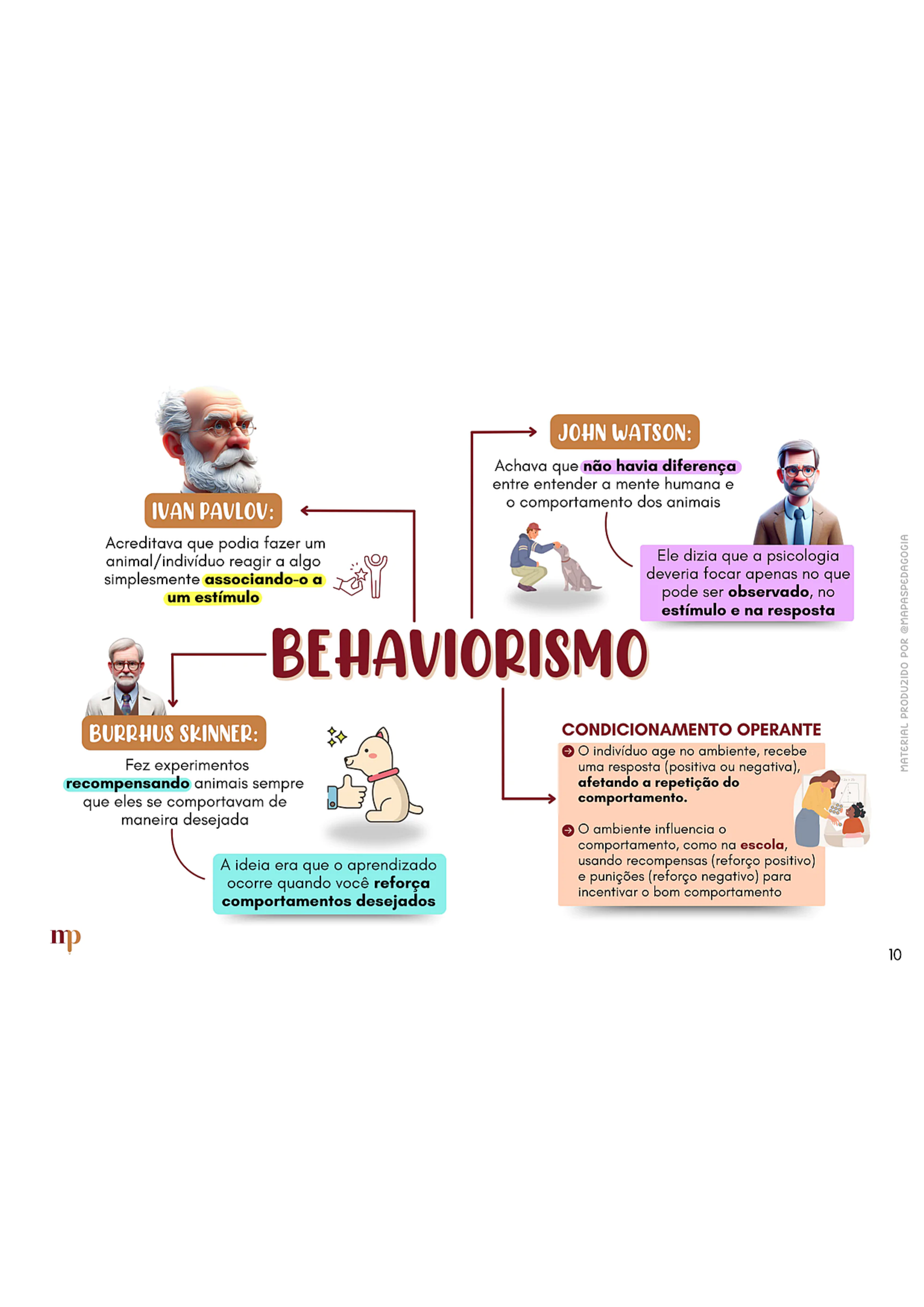 JOHN WATSON: Achava que não havia diferença entre entender a mente humana e IVAN PAVLOV: comportamento dos animais Acreditava que podia fazer um animal/indivíduo reagir a algo Ele dizia que a psicologia simplesmente associando-o a deveria focar apenas no que um estímulo pode ser observado, no estímulo e na resposta BEHAVIORISMO MATERIAL POR @MAPASPEDAGOGIA BURRHUS SKINNER: OPERANTE indivíduo age no ambiente, recebe Fez experimentos uma resposta (positiva ou negativa), recompensando animais sempre afetando a repetição do que eles se comportavam de comportamento. maneira desejada ambiente influencia comportamento, como na escola, A ideia era que aprendizado usando recompensas (reforço positivo) ocorre quando você reforça e punições (reforço negativo) para incentivar bom comportamento comportamentos desejados mp