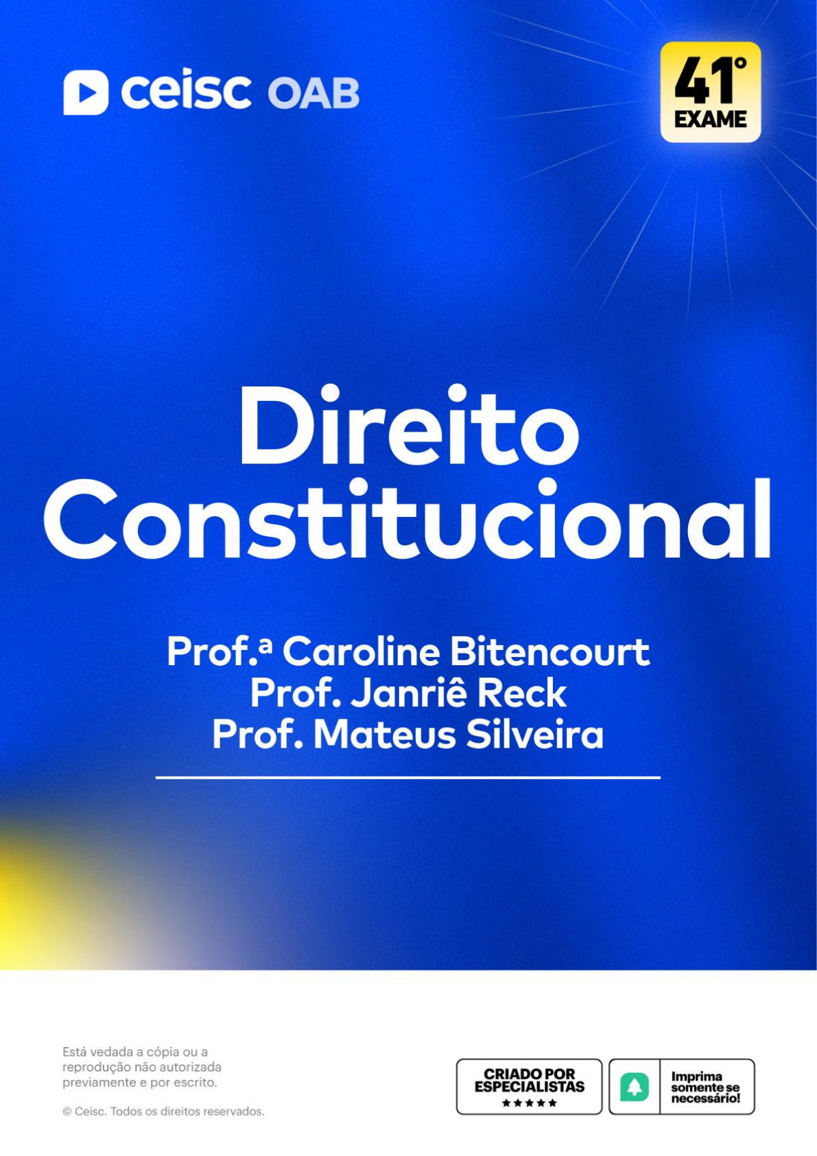 1ª Fase | 41° Exame da OAB Direito Constitucional 1 1ª Fase | 41° Exame da OAB Direito Constitucional 2 1ª Fase | 41° Exame da OAB Direito Constitucional 3 1ª FASE OAB | 41° EXAME Direito Constitucional Prof.ª Caroline Bitencourt | Prof. Janriê Reck | Prof. Mateus Silveira Sumário 1. Teoria da Constituição ............................................................................................................... 4 2. Direitos Fundamentais em Espécie ........................................................................................... 9 3. Direitos de Nacionalidade ........................................................................................................ 29 4. Direitos Políticos e Partidos Políticos ...................................................................................... 33 5. Da Organização do Estado Brasileiro ...................................................................................... 39 6. Estrutura e Função do Poder Legislativo e Imunidades dos Parlamentares .......................... 51 7. Processo Legislativo Federal ................................................................................................... 61 8. Estrutura e Organização do Poder Executivo e Responsabilidade ......................................... 75 9. Estrutura e Organização do Poder Judiciário: Noções Gerais ............................................... 83 10. Controle de Constitucionalidade Difuso e Concentrado: Principais Características e Diferenças .................................................................................................................................... 91 11. Remédios Constitucionais ................................................................................................... 108 12. Da Ordem Econômica e Social ............................................................................................ 123 Olá, aluno(a). Este material de apoio foi organizado com base nas aulas do curso preparatório para a 1ª Fase OAB e deve ser utilizado como um roteiro para as respectivas aulas. Além disso, reco- menda-se que o aluno assista as aulas acompanhado da legislação pertinente. Bons estudos, Equipe Ceisc. Atualizado em março de 2024. 1ª Fase | 41° Exame da OAB Direito Constitucional 4 1. Teoria da Constituição 1.1. Poder constituinte 1.1.1. Conceito Poder constituinte é a máxima expressão da soberania popular – elemento fundamental para a criação de uma Constituição e para poder alterá-la mediante processo formal. 1.1.2. Divisões 1) Poder constituinte originário: é também conhecido como poder inicial, inaugural, cuja função é criar um estado novo, diverso do que vigorava em decorrência da manifestação do poder constituinte que o precedeu. Subdivisão: a) Histórico: o verdadeiro poder constituinte originário, estruturado pela primeira vez. b) Revolucionário: seriam os posteriores ao histórico, rompendo por completo com a antiga ordem e instituindo uma nova. Características: • Inicial: inaugura uma nova ordem. • Autônomo: terá autonomia para a instituição de uma nova ordem. • Ilimitado juridicamente: não tem que se preocupar com o direito anterior. • Incondicionado e soberano: não tem que se submeter a qualquer forma prefixada de manifestação. • Poder de fato e poder político: caracterizado como uma energia, uma força social, tem sua natureza como pré-jurídica. Formas de expressão: • Outorga: caracterizada pela expressão unilateral do agente revolucionário. • Assembleia nacional constituinte: nasce com a deliberação da representação po- pular. 2) Poder constituinte derivado: é denominado como instituído, constituído, secundário 1ª Fase | 41° Exame da OAB Direito Constitucional 5 ou de segundo grau. É criado e instituído pelo poder constituinte originário. É um poder limitado. Sua atuação é condicionada pelo poder constituinte originário. Subdivisão: a) Poder constituinte derivado reformador: tem capacidade de modificar a Constitui- ção, por meio de um procedimento específico. Tem natureza jurídica, delimitado juridicamente. Suas manifestações aparecem em forma de emendas constitucionais (arts. 59, I, e 60). O poder de reforma por meio de emendas pode, em geral, se manifestar a qualquer tempo, sofrendo limites materiais, circunstanciais, formais e, algumas vezes, temporais. Esse poder con- siste em alterar pontualmente determinada matéria constitucional, adicionando, suprimindo, mo- dificando alínea(s), inciso(s), artigo(s) da Constituição. b) Poder constituinte derivado decorrente: também é derivado do originário e por ele limitado, também é jurídico e encontra seus parâmetros estabelecidos pelo originário. Sua missão é a de estruturar as Constituições dos Estados-membros – competência que decorre da capacidade de auto-organização (característica dos sistemas federativos). Intervém para exercer uma tarefa de caráter nitidamente constituinte, tem um caráter de complementaridade com relação à Constituição Federal, com relação ao âmbito de abrangência do território dos Estados-membros. O exercício do poder constituinte derivado decorrente foi concebido às Assembleias legis- lativas, conforme estabelece o art. 11 do ADCT. c) Poder constituinte derivado revisor: também é limitado e condicionado, tem natureza jurídica e foi criado pelo constituinte originário. Não se trata necessariamente de um poder, mas de um processo de revisão que está limitado pelo poder originário. O art. 3º do ADCT determinou que a revisão constitucional aconteceria após cinco anos da promulgação constitucional, pelo voto da maioria absoluta dos membros do Congresso Naci- onal, em sessão unicameral. A revisão poderia se dar numa única vez, não podendo passar por uma segunda produção de efeitos. O limite material do poder de revisão é o mesmo derivado do poder constituinte reforma- d