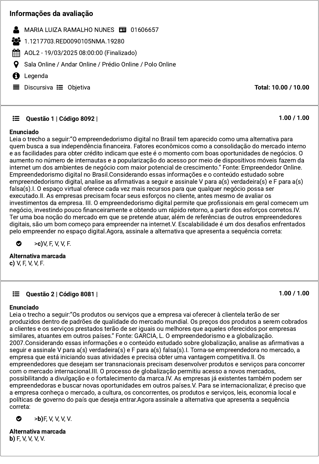 Informações da avaliação MARIA LUIZA RAMALHO NUNES 01606657 1.1217703.RED0090105NMA.19280 AOL2 - 19/03/2025 08:00:00 (Finalizado) Sala Online / Andar Online / Prédio Online / Polo Online Total: 10.00 / 10.00 Legenda Discursiva Objetiva Questão 1 | Código 8092 | 1.00 / 1.00 Enunciado Leia o trecho a seguir:“O empreendedorismo digital no Brasil tem aparecido como uma alternativa para quem busca a sua independência financeira. Fatores econômicos como a consolidação do mercado interno e as facilidades para obter crédito indicam que este é o momento com boas oportunidades de negócios. O aumento no número de internautas e a popularização do acesso por meio de dispositivos móveis fazem da internet um dos ambientes de negócio com maior potencial de crescimento.” Fonte: Empreendedor Online. Empreendedorismo digital no Brasil.Considerando essas informações e o conteúdo estudado sobre empreendedorismo digital, analise as afirmativas a seguir e assinale V para a(s) verdadeira(s) e F para a(s) falsa(s).I. O espaço virtual oferece cada vez mais recursos para que qualquer negócio possa ser executado.II. As empresas precisam focar seus esforços no cliente, antes mesmo de avaliar os investimentos da empresa. III. O empreendedorismo digital permite que profissionais em geral comecem um negócio, investindo pouco financeiramente e obtendo um rápido retorno, a partir dos esforços corretos.IV. Ter uma boa noção do mercado em que se pretende atuar, além de referências de outros empreendedores digitais, são um bom começo para empreender na internet.V. Escalabilidade é um dos desafios enfrentados pelo empreender no espaço digital.Agora, assinale a alternativa que apresenta a sequência correta: >c)V, F, V, V, F. Alternativa marcada c) V, F, V, V, F. Questão 2 | Código 8081 | 1.00 / 1.00 Enunciado Leia o trecho a seguir:“Os produtos ou serviços que a empresa vai oferecer à clientela terão de ser produzidos dentro de padrões de qualidade do mercado mundial. Os preços dos produtos a serem cobrados a clientes e os serviços prestados terão de ser iguais ou melhores que aqueles oferecidos por empresas similares, atuantes em outros países.” Fonte: GARCIA, L. O empreendedorismo e a globalização. 2007.Considerando essas informações e o conteúdo estudado sobre globalização, analise as afirmativas a seguir e assinale V para a(s) verdadeira(s) e F para a(s) falsa(s).I. Torna-se empreendedora no mercado, a empresa que está iniciando suas atividades e precisa obter uma vantagem competitiva.II. Os empreendedores que desejam ser transnacionais precisam desenvolver produtos e serviços para concorrer com o mercado internacional.III. O processo de globalização permitiu acesso a novos mercados, possibilitando a divulgação e o fortalecimento da marca.IV. As empresas já existentes também podem ser empreendedoras e buscar novas oportunidades em outros países.V. Para se internacionalizar, é preciso que a empresa conheça o mercado, a cultura, os concorrentes, os produtos e serviços, leis, economia local e políticas de governo do país que deseja entrar.Agora assinale a alternativa que apresenta a sequência correta: >b)F, V, V, V, V. Alternativa marcada b) F, V, V, V, V. Questão 3 | Código 8082 | 1.00 / 1.00 Enunciado Quando desejamos ser empreendedores, primeiramente é preciso realizar um planejamento do negócio, e a pesquisa com o público-alvo é fundamental. Este tipo de pesquisa visa ajudar o empreendedor a compreender o que o seu público mais deseja e necessita. Assim surgem os novos negócios, novos conceitos e até novos nichos de mercado.Considerando essas informações e o conteúdo estudado sobre o tópico, pode-se afirmar que o primeiro conceito que o empreendedor tem que estruturar em seu planejamento estratégico é o de: >d)Negócio. Alternativa marcada d) Negócio. Questão 4 | Código 8086 | 1.00 / 1.00 Enunciado Leia o trecho a seguir:“O empreendedorismo no Brasil é uma atividade econômica que envolve a criação e a operação de uma empresa. Com o objetivo de criar valor ou riqueza, garantindo a utilização ideal dos recursos. Como essa atividade de criação de valor é realizada continuamente em meio a um ambiente de negócios muitas vezes incerto o empreendedorismo no Brasil, portanto, é considerado uma força dinâmica.”Fonte: MENDES, E. Uma breve análise sobre o empreendedorismo no Brasil.Considerando essas informações e o conteúdo estudado sobre empreendedorismo no Brasil, pode-se afirmar que as duas funções são importantes para a empresa, porque: >b)Por mais que o Brasil seja um dos maiores países voltados para o empreendedorismo, empreender no país é algo desafiador. Alternativa marcada b) Por mais que o Brasil seja um dos maiores países voltados para o empreendedorismo, empreender no país é algo desafiador. Questão 5 | Código 8094 | 1.00 / 1.00 Enunciado Leia o trecho a seguir.“Startup é uma empresa jovem com um modelo de negócios repetível e escalável, em um cenário de incertezas e soluções a serem desenvolvidas. Embora não se limite apenas a negócios digitais, uma startup necessita de inovação para não ser considerada uma empresa de modelo tradicional.”Fonte: BICUDO, L. O que é uma startup? 2016.Considerando essas informações e o conteúdo estudado sobre empreendedorismo digital, pode-se afirmar que: >e)As startups, mesmo dentro de um cenário de incertezas, atraem investidores que acreditam em sua ideia. Alternativa marcada e) As startups, mesmo dentro de um cenário de incertezas, atraem investidores que acreditam em sua ideia. Questão 6 | Código 8084 | 1.00 / 1.00 Enunciado Leia o trecho a seguir:“A contribuição ao desenvolvimento econômico e social é dada pelos empreendedores na medida em que criam empregos, geram impostos, fortalecem a concorrência, inovam e produzem riquezas. Por isto são chamados de agentes de desenvolvimento e de mudança.”Fonte: Portal Educação. Gl