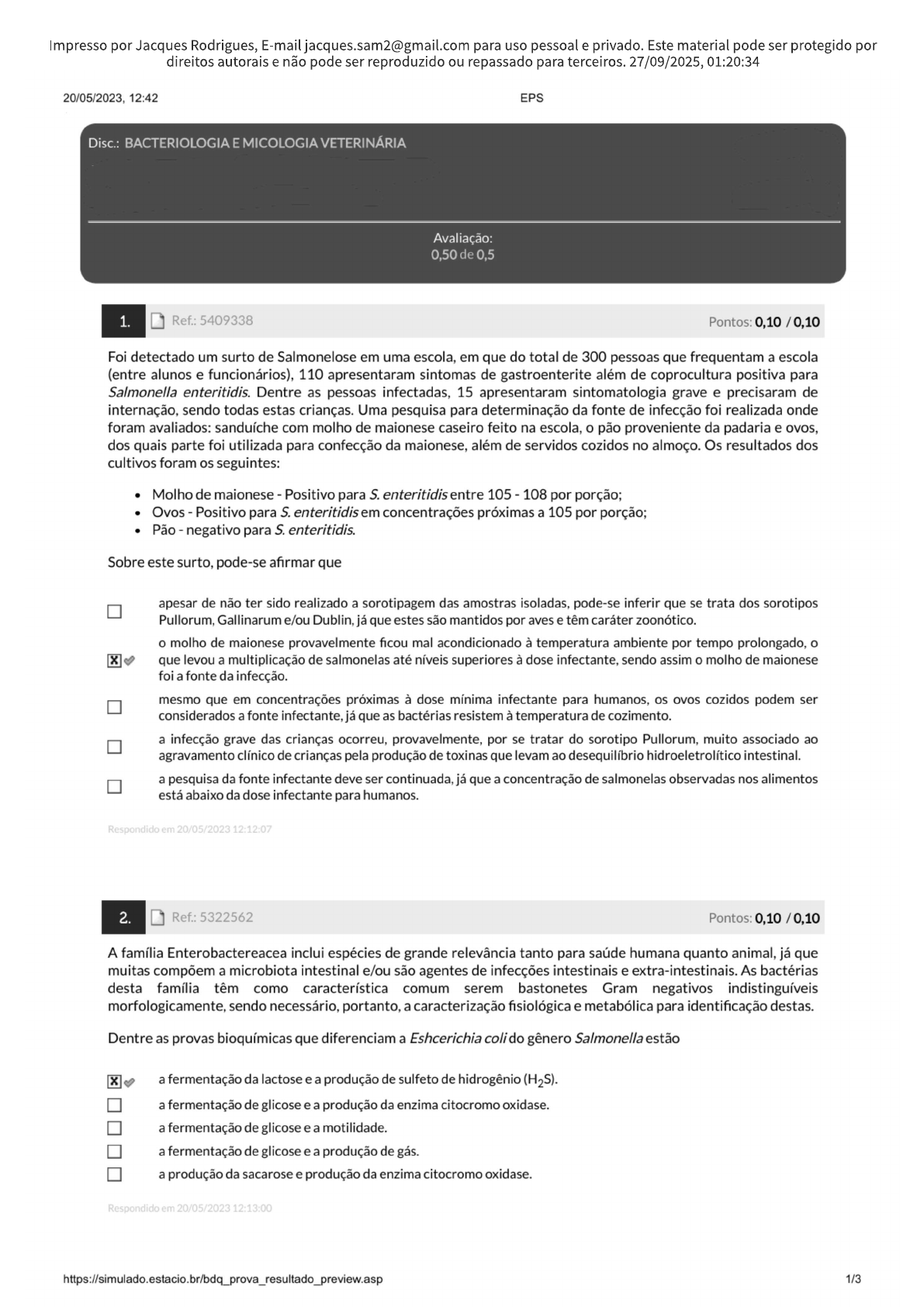 Impresso por Jacques Rodrigues, E-mail jacques.sam2@gmail.com para uso pessoal e privado. Este material pode ser protegido por direitos autorais e não pode ser reproduzido ou repassado para terceiros. 27/09/2025, 01:20:34 20/05/2023, 12:42 EPS Disc.: BACTERIOLOGIA E MICOLOGIA VETERINÁRIA Avaliação: 0,50 de 0,5 1. Ref.: 5409338 Pontos: Foi detectado um surto de Salmonelose em uma escola, em que do total de 300 pessoas que frequentam a escola (entre alunos e funcionários), 110 apresentaram sintomas de gastroenterite além de coprocultura positiva para Salmonella enteritidis. Dentre as pessoas infectadas, 15 apresentaram sintomatologia grave e precisaram de internação, sendo todas estas crianças. Uma pesquisa para determinação da fonte de infecção foi realizada onde foram avaliados: sanduíche com molho de maionese caseiro feito na escola, o pão proveniente da padaria e ovos, dos quais parte foi utilizada para confecção da maionese, além de servidos cozidos no almoço. Os resultados dos cultivos foram os seguintes: Molho de maionese Positivo para S. enteritidis entre 105 108 por porção; Ovos Positivo para S. enteritidis em concentrações próximas a 105 por porção; Pão negativo para S. enteritidis. Sobre este surto, pode-se afirmar que apesar de não ter sido realizado a sorotipagem das amostras isoladas, pode-se inferir que se trata dos sorotipos Pullorum, Gallinarum e/ou Dublin, já que estes são mantidos por aves e têm caráter zoonótico. o molho de maionese provavelmente ficou mal acondicionado à temperatura ambiente por tempo prolongado, o que levou a multiplicação de salmonelas até níveis superiores à dose infectante, sendo assim o molho de maionese foi a fonte da infecção. mesmo que em concentrações próximas à dose mínima infectante para humanos, os ovos cozidos podem ser considerados a fonte infectante, já que as bactérias resistem à temperatura de cozimento. a infecção grave das crianças ocorreu, provavelmente, por se tratar do sorotipo Pullorum, muito associado ao agravamento clínico de crianças pela produção de toxinas que levam ao desequilíbrio hidroeletrolítico intestinal. a pesquisa da fonte infectante deve ser continuada, já que a concentração de salmonelas observadas nos alimentos está abaixo da dose infectante para humanos. Respondido em 20/05/2023 12:12:07 2. Ref.: 5322562 Pontos: 0,10 0,10 A família Enterobactereacea inclui espécies de grande relevância tanto para saúde humana quanto animal, já que muitas compõem a microbiota intestinal e/ou são agentes de infecções intestinais e extra-intestinais. As bactérias desta família têm como característica comum serem bastonetes Gram negativos indistinguíveis morfologicamente, sendo necessário, portanto, a caracterização fisiológica e metabólica para identificação destas. Dentre as provas bioquímicas que diferenciam a Eshcerichia colido gênero Salmonella estão a fermentação da lactose e a produção de sulfeto de hidrogênio (H₂S). a fermentação de glicose e a produção da enzima citocromo oxidase. a fermentação de glicose e a motilidade. a fermentação de glicose e a produção de gás. a produção da sacarose e produção da enzima citocromo oxidase. Respondido em 20/05/2023 12:13:00 https://simulado.estacio.br/bdq_prova_resultado_preview.asp 1/3Impresso por Jacques Rodrigues, E-mail jacques.sam2@gmail.com para uso pessoal e privado. Este material pode ser protegido por direitos autorais e não pode ser reproduzido ou repassado para terceiros. 27/09/2025, 01:20:34 20/05/2023, 12:42 EPS 3. Ref.: 5401301 Pontos: Um surto de Escherichia coli coli) associado à carne moída se disseminou para 10 estados norte-americanos, informou o Centro de Controle e Prevenção de Doenças (CDC, na sigla em inglês) do país. Segundo o órgão federal, 156 pessoas adoeceram em virtude das bactérias E.coliO103. Investigadores ainda tentam determinar a origem da carne bovina contaminada, mas não identificaram um fornecedor, distribuidor ou uma marca. De acordo com o CDC, este é o terceiro maior surto interestadual de E.coli em 20 anos. Apesar de a agência não ter identificado uma origem comum para a disseminação da doença, uma empresa com sede na Geórgia, K2D Foods, recolheu da rede varejista 113 toneladas de carne moída in naturapor possível contaminação com a bactéria. FONTE: Estadão Conteúdo, Surto de coliligado à carne moída se propaga para 10 Estados nos EUA. Portal Isto É, 2019. Disponível nos-eua/ Acesso em: 25/05/2021. Dentro desse contexto, por qual motivo somente a identificação da bactéria coli como contaminante da carne moída apreendida não foi suficiente para associar o consumo da carne ao surto? Porque o isolamento e provas bioquímicas são apenas testes presuntivos de confirmação de espécie bacteriana. Para realmente determinar a espécie envolvida na contaminação da carne seria essencial realizar uma PCR para diagnóstico. Na realidade a reportagem está sendo apenas cautelosa na informação. Isto porque a bactéria coli é um patógeno obrigatório e qualquer estirpe presente na carne moída consumida seria capaz de gerar os agravos observados. Porque para confirmar a relação com o surto, seria necessário determinar se o sorotipo envolvido na contaminação da carne moída é o mesmo encontrado nas infecções associado a uma análise de DNA que confirmaria a relação. Porque a contaminação estaria dentro dos níveis toleráveis de E. coliem amostras de carne moída o que, portanto, não justifica a gravidade das infecções. Porque seria necessário aplicar novos testes bioquímicos de análises de fermentação de açúcares, especialmente a lactose, para confirmar que a estirpe isolada na carne é a mesma envolvida no surto infeccioso. Respondido em 20/05/2023 12:14:41 4. Ref.: 5325369 Pontos: A leptospirose é uma doença infectocontagiosa que acomete diversas espécies animais incluindo o homem. É um