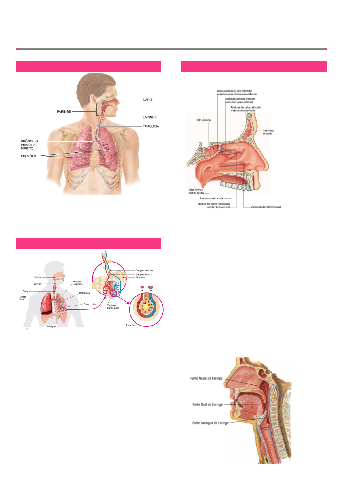 SISTEMA RESPIRATÓRIO DIVISÃO ESTRUTURAL • Vias aéreas superiores: nariz, cavidade nasal, faringe. • Vias aéreas inferiores: laringe, traqueia, brônquios, bronquíolos e pulmões. DIVISÃO FUNCIONAL • Parte condutora: leva o ar até os pulmões (nariz → bronquíolos terminais). • Parte funcional: onde ocorrem as trocas gasosas (bronquíolos respiratórios, ductos e sacos alveolares, alvéolos). HISTOLOGIA - Parte condutora: epitélio ciliado pseudoestratificado + células caliciformes (produtoras de muco) - Faringe: epitélio estratificado pavimentoso. - Alvéolos: epitélio pavimentoso simples + células produtoras de surfactante. PRINCIPAIS ÓRGÃOS FOSSAS NASAIS - PARTE FUNCIONAL Função: filtra, aquece e umidifica o ar. - Pelos: capturam partículas suspensas (como poeira). - Conchas nasais: mucosa com muitos capilares → aquece o ar inspirado. - Células caliciformes: produzem muco → umidificam o ar e retêm poeira. • Na via respiratória superior, eles movem o muco para baixo até a faringe. • Na via respiratória inferior, movem o muco para cima até a faringe. • A velocidade média desse transporte é de 0,5 a 1 cm por minuto. FARINGE (GARGANTA) - Epitélio estratificado pavimentoso não queratinizado - Resistência ao atrito (passagem de ar e alimento). LARINGE - Porções cartilaginosas unidas por tecido conjuntivo fibroelástico. - Epiglote: cartilagem elástica, sua porção superior bloqueia a laringe durante a deglutição - Pregas vocais: formadas por túnica mucosa. O ar empurrado contra as pregas vocais as faz vibrar e produzir ondas sonoras Homens: pregas vocais mais longas e espessas – voz mais grave DIVISÃO FUNCIONA TRAQUEIA - Epitélio respiratório com lâmina própria (tecido conjuntivo frouxo + fibras elásticas). - Anéis cartilaginosos em “C” → mantêm via aérea aberta. BRÔNQUIOS E BRONQUÍOLOS - Ramificações progressivas da traqueia. - Epitélio vai se tornando mais simples nos bronquíolos, até chegar ao epitélio cúbico. - Função: encaminhar o ar para os pulmões ÁRVORE BRÔNQUICA PULMÕES - HISTOLOGIA E ANATOMIA - Epitélio pseudoestratificado colunar ciliado - Diferenças anatômicas: • Pulmão esquerdo com volume menor • Presença de incisura cardíaca no pulmão esquerdo • Três lobos no pulmão direito, dois no esquerdo HILO O hilo é a região pulmonar em que se inserem a traqueia e os vasos sanguíneos. PLEURAS Camadas de revestimento e proteção dos pulmões: • Pleura parietal: lâmina externa, fixada à cavidade torácica e diafragma • Pleura visceral: lâmina interna, adere-se aos pulmões. ALVÉOLOS - PARTE FUNCIONAL - Epitélio pavimentoso simples (células tipo I) → facilita a difusão de gases. - Células tipo II (pneumócitos II) → produzem surfactantes, evitando colapso alveolar. - Membrana respiratória: parede alveolar + parede capilar → muito fina (~0,5 µm). - Sítio de troca gasosa (hematose) HEMATOSE (TROCA DE GASES) - Ocorre nos alvéolos e capilares por difusão. - O₂ vai do ar alveolar → sangue. - CO₂ vai do sangue → ar alveolar. - A membrana respiratória é extremamente fina (~0,5 µm), facilitando a troca. • O princípio da troca gasosa diz que os gases (oxigênio e gás carbônico) se movem de onde estão em maior concentração/pressão parcial para onde estão em menor concentração/pressão parcial. DIAFRAGMA - Músculo estriado liso, separa as cavidades torácica e abdominal - Inspiração: diafragma contrai → aumenta volume da caixa torácica → pressão alveolar pressão atmosférica → ar sai. PATOLOGIAS RECORRENTES • Rinite: inflamação da mucosa nasal. • Sinusite: inflamação dos seios nasais. • Pneumonia: líquidos nos alvéolos dificultam trocas gasosas.