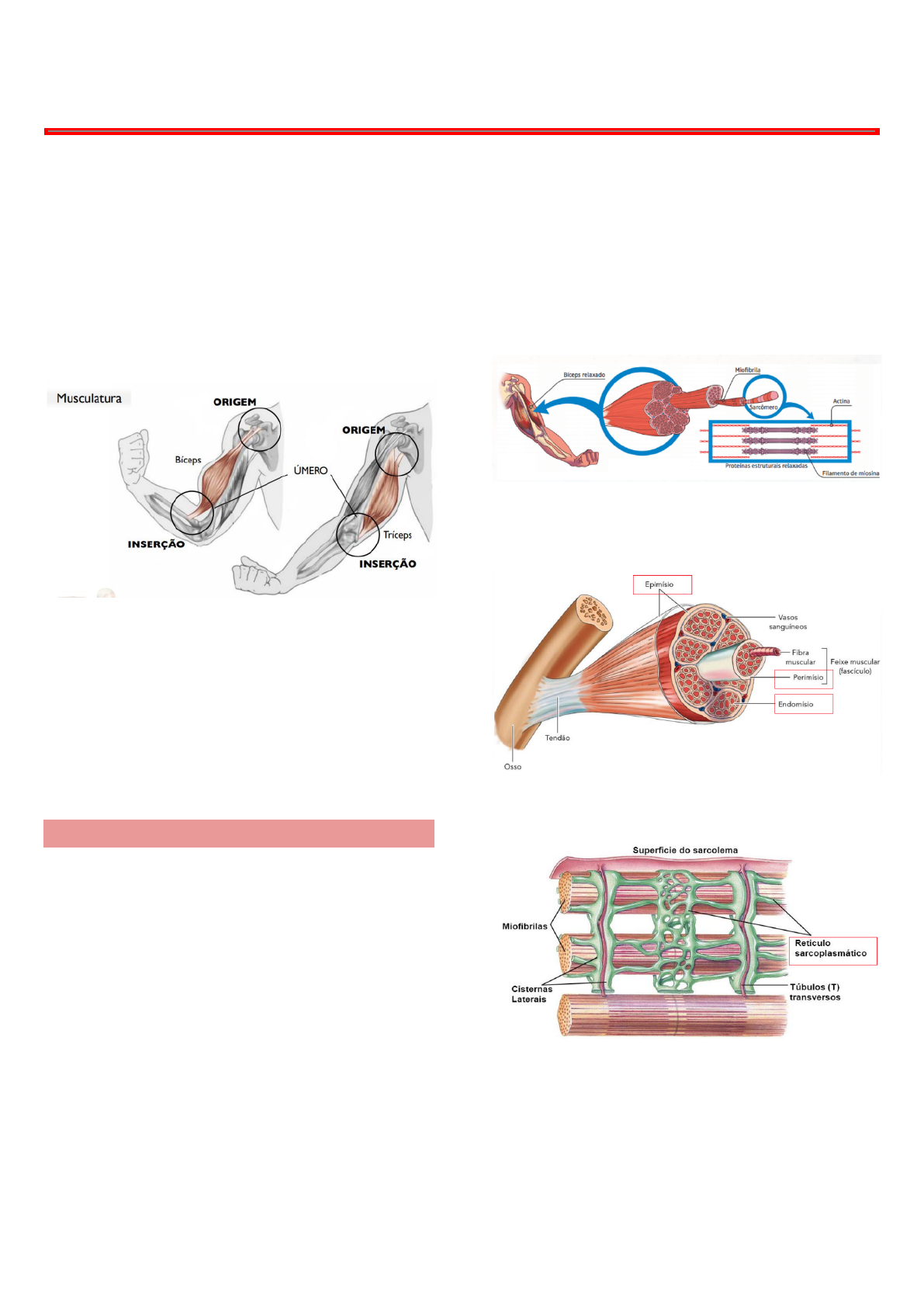 SISTEMA MUSCULAR PROPRIEDADES • Excitabilidade : capacidade de responder a estímulos. • Contratilidade : encurtar e gerar força. • Extensibilidade : alongar sem se romper. • Elasticidade : voltar ao tamanho original após contração/alongamento. TERMINOLOGIA • Origem: ponto fixo (estrutura imóvel) • Inserção: ponto móvel AÇÕES MUSCULARES • Agonistas: realizam o movimento principal (ex.: bíceps) • Antagonistas: realizam movimento oposto (ex.: tríceps) • Sinergistas: auxiliam os agonistas. TIPOS DE TECIDO MUSCULAR • Tecido muscular estriado esquelético: voluntário, estriado, fibras longas multinucleadas; contração rápida e vigorosa. • Tecido muscular estriado cardíaco: involuntário, estriado, células curtas unidas por discos intercalares (impulsos elétricos). • Tecido muscular liso: involuntário, sem estriações, contrações lentas (ex.: vísceras, vasos). FUNÇÕES DOS MÚSCULOS ESQUELÉTICOS - Produção de movimentos. - Manutenção da postura. - Sustentação de órgãos internos. - Controle de aberturas (deglutição, micção, defecação). - Regulação da temperatura corporal (gera calor ao contrair). ESTRUTURA DO MÚSCULO ESQUELÉTICO • Tendão: parte branca. • Ventre muscular: parte vermelha. • Proteínas contráteis: actina (filamentos finos) + miosina (grossos) = miofibrilas. • Sarcômero: unidade da contração. • Está envolvido por tecido conjuntivo: endomísio, perimísio, epimísio. • Retículo sarcoplasmático: libera o cálcio pelos túbulos (T) TIPOS DE FIBRAS MUSCULARES • Fibras Rápidas (brancas): contração rápida, muita glicose, pouca mioglobina, fadiga fácil. • Fibras Lentas (vermelhas): resistentes, muita mioglobina e mitocôndrias, usam O₂, fadigam lentamente. CONTRAÇÃO MUSCULAR 1. Um estímulo nervoso chega ao músculo e libera o neurotransmissor acetilcolina na junção neuromuscular. 2. Isso gera um sinal elétrico que provoca a liberação de cálcio (Ca²⁺) dentro da fibra muscular. 3. O cálcio se liga à actina, permitindo que a miosina se encaixe nela. 4. A miosina “puxa” os filamentos de actina, encurtando o sarcômero (unidade contrátil). 5. Esse processo, repetido várias vezes, faz o músculo encurtar e gerar força. 6. Quando o estímulo para, o cálcio é recolhido, e o músculo relaxa. ALTERAÇÕES NO SISTEMA MUSCULAR • Atrofia: perda de massa muscular por falta de estímulo (reversível com fisioterapia). • Envelhecimento: fibras mais finas, mais tecido conjuntivo (fibrose), menor resistência e recuperação. REGENERAÇÃO MUSCULAR - Depende de células satélites (diminuem com a idade). - Etapas: inflamação → proliferação → remodelagem. - Necessita revascularização, reinervação e reconstrução de fibras. PRINCIPAIS MÚSCULOS