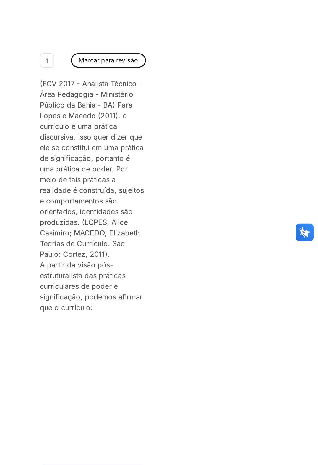 1 Marcar para revisão �FGV 2017 � Analista Técnico - Área Pedagogia - Ministério Público da Bahia - BA� Para Lopes e Macedo �2011�, o currículo é uma prática discursiva. Isso quer dizer que ele se constitui em uma prática de significação, portanto é uma prática de poder. Por meio de tais práticas a realidade é construída, sujeitos e comportamentos são orientados, identidades são produzidas. �LOPES, Alice Casimiro; MACEDO, Elizabeth. Teorias de Currículo. São Paulo: Cortez, 2011�. A partir da visão pós- estruturalista das práticas curriculares de poder e significação, podemos afirmar que o currículo: A B C D E Torna inócuas distinções como currículo formal, oculto, vivido, na medida em que tudo isso é parte inalienável das práticas curriculares. Oculto é a parte intangível do currículo, na medida em que não está colocada nos textos e não é partilhada por todos. Se constrói na dialética, a partir de imposições e resistências, tendo como atores principais os alunos. Possui independência das decisões políticas, na medida em que é construído no interior das escolas. É um recorte implacável, em que há um processo avassalador de imposições por meio do arbitrário cultural dominante. A B C 2 Marcar para revisão �Ano: 2019 Banca: FAU Órgão: IF�PR Prova: FAU � 2019 � IF� PR � Professor - Pedagogia) O currículo escolar abrange as experiências de aprendizagens implementadas pelas instituições escolares e que deverão ser vivenciadas pelos estudantes. Nele estão contidos os conteúdos que deverão ser abordados no processo de ensino- aprendizagem e a metodologia utilizada para os diferentes níveis de ensino. Assinale a alternativa correta sobre as teorias do currículo: Teorias abismais, teorias críticas e teorias pós-críticas. Teorias tradicionais, teorias críticas e teorias pós-críticas. Teorias tradicionais, teorias cínicas e teorias pós-críticas. D E Teorias tradicionais, teorias críticas e teorias pós- tradicionais. Teorias tradicionais, teorias cívicas e teorias pós-críticas. 3 Marcar para revisão No campo do currículo, as perspectivas compreendidas como tradicionais ganharam maior destaque a partir do início do século XX, momento em que, de acordo com Pinar et al �2017�, I - passou-se a buscar maior definição de seu objeto por diferentes visões. II - crescimento de uma preocupação com maior precisão sobre a forma mais adequada de projetar currículos ou guias para redes de ensino, por um lado, e, por outro, a busca por compreender o que ocorria no contexto de cada escola. III - podemos apontar para duas grandes compreensões curriculares que ajudam a reconhecer uma abordagem tradicional em currículo: o comportamentalismo ou eficientismo e o progressivismo. A B C D E IV - progressivismo pode ser caracterizado pela incorporação da razão gerencial da administração científica de Taylor ao currículo, sob a ideia de que a escola pudesse ser gerida como uma empresa, através de mecanismos de controle e testagem rígidos. Estão corretas as afirmativas: I, II e III. I, III e IV. II, III e IV. Somente I e III. Somente II e IV. 4 Marcar para revisão O multiculturalismo crítico, no campo do currículo, também possui influências marxistas, por meio das quais analisa os processos históricos envolvidos na hierarquização cultural. Segundo Silva �2009�, no campo do currículo, o multiculturalismo: A B C Especificamente nos Estados Unidos, a discussão multicultural crítica ganhou força a partir de movimentos organizados por grupos sociais subalternizados. No Brasil, a abordagem renega debates, tais como mulheres, homossexuais e negros, que se opunham à superioridade das referências da cultura branca, heterossexual, masculina e europeia. As críticas aos diferentes tipos de multiculturalismo tendem a estar voltadas às ideias de que, embora busquem valorizar as culturas diversas, o fazem abandonando velhos padrões. D E As concepções de intolerância e desrespeito são questionadas, pois reconhecem a superioridade do tolerante e sua capacidade de permitir a existência do outro. Tendem a dar poder a quem tolera ou respeita, como se as culturas dependessem de uma autorização superior para serem reconhecidas. 5 Marcar para revisão �IF�PA 2019 � Pedagogo - IF� PA � PA� O currículo tem relação direta com o poder e se situa no nível da superestrutura, sendo visto como instrumento de dominação da classe dominante sobre a classe dominada, constituindo-se, deste modo, em um "conhecimento comprometido", ou seja, uma expressão da vontade e dos interesses da classe detentora do poder político. Essa é uma formulação do currículo 00 hora : 39 min : 36 seg Ocultar Questão 10 de 10 Respondidas �10� Em branco �0� Finalizar prova 1 2 3 4 5 6 7 8 9 10 SM1 Curriculo Escolar A B C D E utilizada por teóricos ligados à concepção: Marxista. Liberal. Positivista. Fisiológica. Tecnicista. 6 Marcar para revisão �IFB 2017 Professor - Pedagogia - IFB [adaptado]) O currículo se refere aos programas e conteúdos de cada componente curricular e expressa os princípios e metas do projeto educativo de uma instituição. Considerando uma perspectiva crítica do currículo, podemos compreender que: A B C O currículo deve ser utilizado para a reprodução de uma visão de mundo hegemônica. O currículo é um documento formal e estabelecido pelo sistema educacional que deve ser seguido pelas instituições de ensino, pois visa uma igualdade educacional. O conhecimento estabelecido na organização curricular do currículo é neutro, cabe ao professor dar uma direção a esse conhecimento. D E A organização curricular deve levar em consideração as relações entre os sujeitos e o espaço- tempo em que se situam. É importante evitar, sistematicamente, que situações ocorridas na escola tragam contextos diferentes daqueles que estão devidamente planejados 