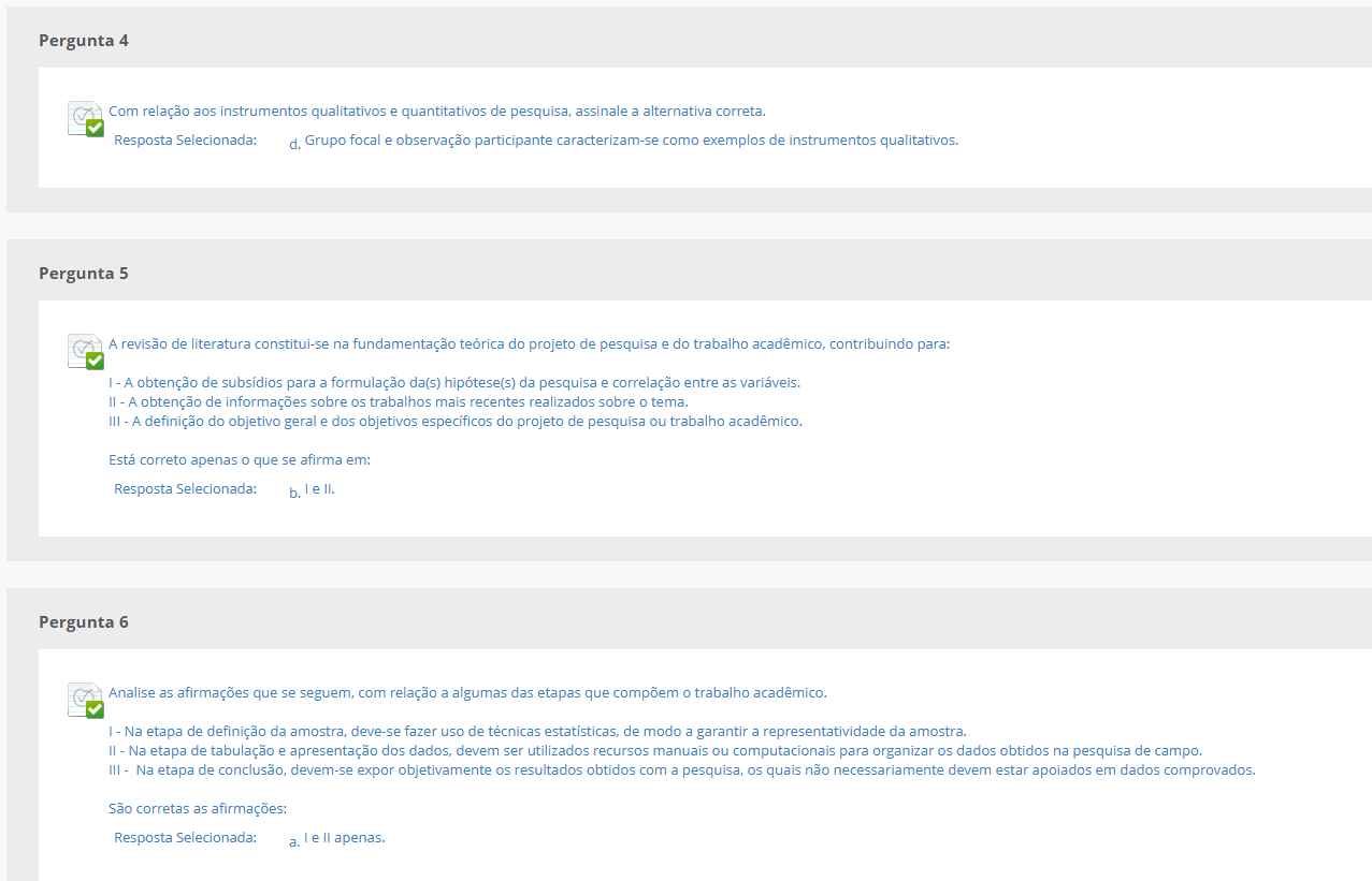 Pergunta 4 Com relação aos instrumentos qualitativos e quantitativos de pesquisa, assinale a alternativa correta. Resposta Selecionada: d. Grupo focal e observação participante caracterizam-se como exemplos de instrumentos qualitativos. Pergunta 5 A revisão de literatura constitui-se na fundamentação teórica do projeto de pesquisa e do trabalho acadêmico, contribuindo para: I A obtenção de subsídios para a formulação da(s) hipótese(s) da pesquisa e correlação entre as variáveis. A obtenção de informações sobre os trabalhos mais recentes realizados sobre tema. III A definição do objetivo geral e dos objetivos específicos do projeto de pesquisa ou trabalho acadêmico. Está correto apenas 0 que se afirma em: Resposta Selecionada: b. e II. Pergunta 6 Analise as afirmações que se seguem, com relação a algumas das etapas que compõem O trabalho acadêmico. I Na etapa de definição da amostra, deve-se fazer uso de técnicas estatísticas, de modo a garantir a representatividade da amostra. Na etapa de tabulação e apresentação dos dados, devem ser utilizados recursos manuais ou computacionais para organizar os dados obtidos na pesquisa de campo. III Na etapa de conclusão, devem-se expor objetivamente os resultados obtidos com a pesquisa, os quais não necessariamente devem estar apoiados em dados comprovados. São corretas as afirmações: Resposta Selecionada: a. e II apenas.
