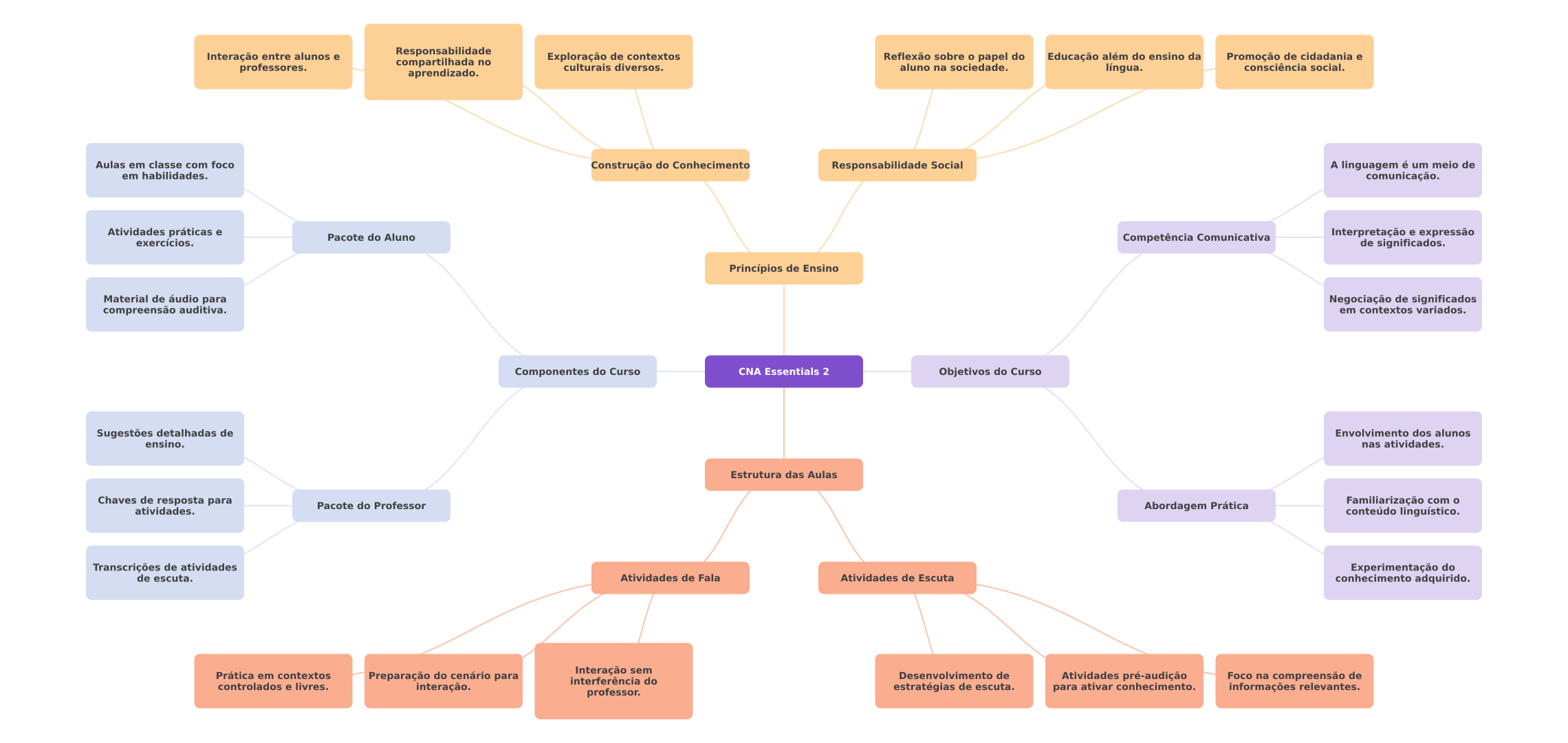 Interação entre alunos e Responsabilidade compartilhada no Exploração de contextos Reflexão sobre papel do Educação além do ensino da Promoção de cidadania e professores. culturais diversos. aluno na sociedade. língua. consciência social. aprendizado. Aulas em classe com foco Construção do Conhecimento Responsabilidade Social A linguagem é um meio de em habilidades. comunicação. Atividades práticas e Pacote do Aluno Competência Comunicativa Interpretação e expressão exercícios. de significados. Princípios de Ensino Material de áudio para Negociação de significados compreensão auditiva. em contextos variados. Componentes do Curso CNA Essentials 2 Objetivos do Curso Sugestões detalhadas de Envolvimento dos alunos ensino. nas atividades. Estrutura das Aulas Chaves de resposta para Pacote do Professor atividades. Abordagem Prática Familiarização com conteúdo linguístico. Transcrições de atividades Experimentação do de escuta. Atividades de Fala Atividades de Escuta conhecimento adquirido. Prática em contextos Interação sem Preparação do cenário para Desenvolvimento de interferência do Atividades pré-audição Foco na compreensão de controlados e livres. interação. professor. estratégias de escuta. para ativar conhecimento. informações relevantes.