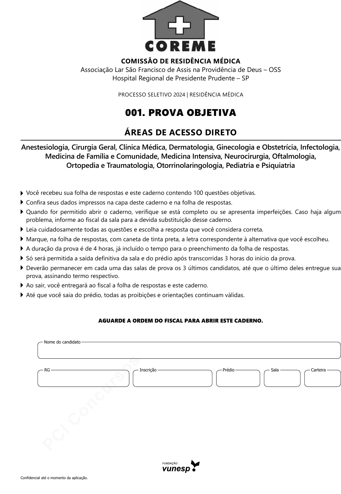 pcimarkpci MjgwNDowMTRjOjAxMDk6OGI0YTo2NDZlOjgyMDI6M2RmZjo5YTFm:U3VuLCAyOCBTZXAgMjAyNSAxODowMTo1NSAtMDMwMA== www.pciconcursos.com.br Confidencial até o momento da aplicação. comissão DE REsiDÊNciA mÉDicA Associação Lar São Francisco de Assis na Providência de Deus – OSS Hospital Regional de Presidente Prudente – SP PROceSSO SeLetivO 2024 | ReSiDênciA méDicA 001. Prova objetiva ÁREAs DE AcEsso DiREto Anestesiologia, Cirurgia Geral, Clínica Médica, Dermatologia, Ginecologia e Obstetrícia, Infectologia, Medicina de Família e Comunidade, Medicina Intensiva, Neurocirurgia, Oftalmologia, Ortopedia e Traumatologia, Otorrinolaringologia, Pediatria e Psiquiatria você recebeu sua folha de respostas e este caderno contendo 100 questões objetivas. Confira seus dados impressos na capa deste caderno e na folha de respostas. Quando for permitido abrir o caderno, verifique se está completo ou se apresenta imperfeições. Caso haja algum problema, informe ao fiscal da sala para a devida substituição desse caderno. Leia cuidadosamente todas as questões e escolha a resposta que você considera correta. Marque, na folha de respostas, com caneta de tinta preta, a letra correspondente à alternativa que você escolheu. A duração da prova é de 4 horas, já incluído o tempo para o preenchimento da folha de respostas. Só será permitida a saída definitiva da sala e do prédio após transcorridas 3 horas do início da prova. Deverão permanecer em cada uma das salas de prova os 3 últimos candidatos, até que o último deles entregue sua prova, assinando termo respectivo. Ao sair, você entregará ao fiscal a folha de respostas e este caderno. Até que você saia do prédio, todas as proibições e orientações continuam válidas. aguarde a ordem do fiscal Para abrir este caderno. Nome do candidato Prédio Sala CarteiraInscriçãoRG pcimarkpci MjgwNDowMTRjOjAxMDk6OGI0YTo2NDZlOjgyMDI6M2RmZjo5YTFm:U3VuLCAyOCBTZXAgMjAyNSAxODowMTo1NSAtMDMwMA== www.pciconcursos.com.br Confidencial até o momento da aplicação. pcimarkpci MjgwNDowMTRjOjAxMDk6OGI0YTo2NDZlOjgyMDI6M2RmZjo5YTFm:U3VuLCAyOCBTZXAgMjAyNSAxODowMTo1NSAtMDMwMA== www.pciconcursos.com.br 3 HRPP2401/001-AcessoDiretoConfidencial até o momento da aplicação. ClíniCa MédiCa 01. Homem de 65 anos, portador de DPOC, queixa-se de dispneia aos moderados esforços há 1 ano. Duran- te avaliação, apresentou VEF 1 de 72%, mMRC de 1 e eosinófilos plasmáticos de 330 células/µL. No último ano, teve dois episódios de exacerbações, sem necessi- dade de internação hospitalar. O tratamento mais adequado para este paciente deve ser (A) β 2-agonista inalatório de longa ação, anticolinérgico inalatório de longa ação e corticoide inalatório. (B) β 2-agonista inalatório de longa ação e corticoide inalatório, apenas. (C) anticolinérgico inalatório de longa ação e corticoide inalatório, apenas. (D) β 2-agonista inalatório de longa ação, apenas. (E) corticoide inalatório, apenas. 02. Homem de 37 anos, trabalhador de uma empresa de ma- nipulação de aves, procura atendimento médico por tosse seca há 1 mês, acompanhada de dispneia progressiva. Ao exame físico, possui ausculta pulmonar com redução do murmúrio vesicular em bases pulmonares bilateral- mente e crepitações finas. A tomografia computadorizada de tórax mostrou presença de vidro fosco esparso, além de áreas de aprisionamento aéreo alternadas com áreas pulmonares sem lesão. Diante dos achados, a principal hipótese diagnóstica é (A) pneumonia de organização criptogênica. (B) fibrose pulmonar idiopática. (C) pneumonite por hipersensibilidade. (D) sarcoidose. (E) pneumonia eosinofílica aguda. 03. Homem de 37 anos queixa-se de dor lombar há 6 meses, com piora progressiva. Refere que a dor é mais frequente durante a noite e que melhora ao se levantar da cama e com a caminhada. Há 8 meses, refere ter apresentado crises ocasionais de dor e edema em dedos de mãos, que melhoram com uso de anti-inflamatórios. Apresenta radiografias de coluna torácica, lombar e bacia normais. Para uma investigação adequada da principal hipótese diagnóstica, deve-se realizar (A) dosagem de HLA DQ2. (B) dosagem de HLA DQ8. (C) tomografia de coluna lombar. (D) ressonância magnética de coluna lombar. (E) ressonância magnética de bacia para sacroilíacas. 04. Mulher de 22 anos apresenta-se com queixa de fadiga há 2 anos e episódios de febre com a máxima temperatura aferida de 38,5 ºC. Refere apresentar úlceras orais com frequência, além de dor, edema e eritema em articulações de mãos. As queixas apresentam resolução espontânea. Não possui outras queixas. Ao exame físico, apresenta eritema malar bilateral, sem demais alterações. Labo- ratorialmente, apresenta FAN positivo, com anticorpos Anti-DNAd, Anti-SSA e Anti-SSB positivos, com exames de hemograma, complemento sérico, creatinina, sumário de urina e proteinúria negativos. Considerando a principal hipótese diagnóstica, o trata- mento mais apropriado para esta paciente é (A) hidroxicloroquina e anti-inflamatórios não esteroidais. (B) hidroxicloroquina e corticoides tópicos. (C) anti-inflamatórios não esteroidais e corticoides sistê- micos. (D) anti-inflamatórios não esteroidais e metotrexato. (E) metotrexato e corticoides sistêmicos. 05. Mulher de 58 anos, portadora de diabete melito tipo 2, apresenta em avaliação de rotina valor de FIB-4 de 2,0. A próxima conduta deve ser (A) repetir o escore FIB-4 em 2 anos. (B) repetir o escore FIB-4 em 1 ano. (C) solicitar RNM hepática. (D) solicitar elastografia hepática. (E) realizar biópsia hepática. 06. Homem de 64 anos apresenta queixa de diarreia há 8 meses. O paciente caracteriza as fezes como volumosas e claras, com aspecto gorduroso. Há 1 ano, foi diagnos- ticado com diabete melito. Em investigação, apresenta pâncreas atrofiado e com calcificações em tomografia de abdome. A principal etiologia para o quadro clíni