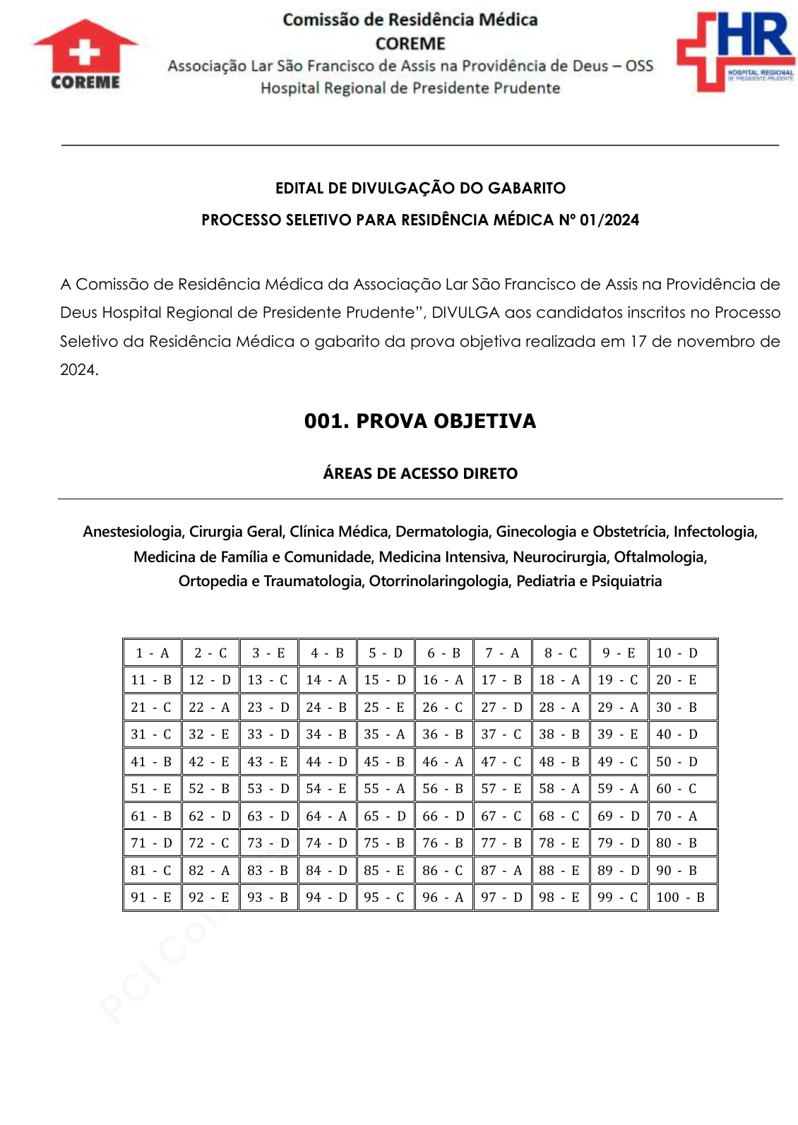 pcimarkpci MjgwNDowMTRjOjAxMDk6OGI0YTo2NDZlOjgyMDI6M2RmZjo5YTFm:U3VuLCAyOCBTZXAgMjAyNSAxODowMjoyMiAtMDMwMA== www.pciconcursos.com.br ___________________________________________________________________________________ EDITAL DE DIVULGAÇÃO DO GABARITO PROCESSO SELETIVO PARA RESIDÊNCIA MÉDICA Nº 01/2024 A Comissão de Residência Médica da Associação Lar São Francisco de Assis na Providência de Deus Hospital Regional de Presidente Prudente”, DIVULGA aos candidatos inscritos no Processo Seletivo da Residência Médica o gabarito da prova objetiva realizada em 17 de novembro de 2024. 001. PROVA OBJETIVA ÁREAS DE ACESSO DIRETO Anestesiologia, Cirurgia Geral, Clínica Médica, Dermatologia, Ginecologia e Obstetrícia, Infectologia, Medicina de Família e Comunidade, Medicina Intensiva, Neurocirurgia, Oftalmologia, Ortopedia e Traumatologia, Otorrinolaringologia, Pediatria e Psiquiatria 1 - A 2 - C 3 - E 4 - B 5 - D 6 - B 7 - A 8 - C 9 - E 10 - D 11 - B 12 - D 13 - C 14 - A 15 - D 16 - A 17 - B 18 - A 19 - C 20 - E 21 - C 22 - A 23 - D 24 - B 25 - E 26 - C 27 - D 28 - A 29 - A 30 - B 31 - C 32 - E 33 - D 34 - B 35 - A 36 - B 37 - C 38 - B 39 - E 40 - D 41 - B 42 - E 43 - E 44 - D 45 - B 46 - A 47 - C 48 - B 49 - C 50 - D 51 - E 52 - B 53 - D 54 - E 55 - A 56 - B 57 - E 58 - A 59 - A 60 - C 61 - B 62 - D 63 - D 64 - A 65 - D 66 - D 67 - C 68 - C 69 - D 70 - A 71 - D 72 - C 73 - D 74 - D 75 - B 76 - B 77 - B 78 - E 79 - D 80 - B 81 - C 82 - A 83 - B 84 - D 85 - E 86 - C 87 - A 88 - E 89 - D 90 - B 91 - E 92 - E 93 - B 94 - D 95 - C 96 - A 97 - D 98 - E 99 - C 100 - B pcimarkpci MjgwNDowMTRjOjAxMDk6OGI0YTo2NDZlOjgyMDI6M2RmZjo5YTFm:U3VuLCAyOCBTZXAgMjAyNSAxODowMjoyMiAtMDMwMA== www.pciconcursos.com.br ___________________________________________________________________________________ 002. PROVA OBJETIVA PRÉ-REQUISITO EM CLÍNICA MÉDICA Cardiologia 1 - D 2 - A 3 - E 4 - A 5 - C 6 - D 7 - E 8 - B 9 - B 10 - A 11 - C 12 - D 13 - E 14 - A 15 - C 16 - B 17 - A 18 - B 19 - E 20 - D 21 - C 22 - C 23 - B 24 - D 25 - B 26 - E 27 - C 28 - A 29 - D 30 - E 31 - C 32 - C 33 - D 34 - B 35 - E 36 - A 37 - D 38 - E 39 - D 40 - B 41 - B 42 - A 43 - C 44 - E 45 - A 46 - C 47 - A 48 - D 49 - B 50 - E 003. PROVA OBJETIVA PRÉ-REQUISITO EM CIRURGIA GERAL Cirurgia Plástica, Cirurgia Vascular e Urologia 1 - D 2 - E 3 - C 4 - D 5 - B 6 - A 7 - C 8 - E 9 - A 10 - B 11 - B 12 - A 13 - E 14 - D 15 - C 16 - A 17 - B 18 - D 19 - C 20 - E 21 - B 22 - A 23 - C 24 - D 25 - E 26 - A 27 - A 28 - B 29 - C 30 - B 31 - C 32 - D 33 - E 34 - D 35 - D 36 - C 37 - A 38 - C 39 - B 40 - E 41 - D 42 - B 43 - A 44 - E 45 - B 46 - D 47 - D 48 - A 49 - E 50 - E 004. PROVA OBJETIVA PRÉ-REQUISITO EM PEDIATRIA Medicina do Adolescente e Neonatologia pcimarkpci MjgwNDowMTRjOjAxMDk6OGI0YTo2NDZlOjgyMDI6M2RmZjo5YTFm:U3VuLCAyOCBTZXAgMjAyNSAxODowMjoyMiAtMDMwMA== www.pciconcursos.com.br ___________________________________________________________________________________ 1 - C 2 - A 3 - B 4 - E 5 - D 6 - B 7 - C 8 - D 9 - D 10 - A 11 - B 12 - C 13 - C 14 - D 15 - E 16 - E 17 - B 18 - C 19 - C 20 - A 21 - C 22 - C 23 - D 24 - C 25 - B 26 - C 27 - D 28 - D 29 - C 30 - C 31 - D 32 - C 33 - C 34 - D 35 - A 36 - A 37 - B 38 - C 39 - D 40 - D 41 - C 42 - E 43 - B 44 - E 45 - C 46 - D 47 - C 48 - A 49 - A 50 - C 005. PROVA OBJETIVA PRÉ-REQUISITO EM CLÍNICA MÉDICA OU CIRURGIA GERAL Endoscopia 1 - D 2 - E 3 - A 4 - C 5 - E 6 - B 7 - B 8 - C 9 - D 10 - C 11 - B 12 - D 13 - C 14 - B 15 - E 16 - C 17 - A 18 - E 19 - C 20 - A 21 - B 22 - B 23 - C 24 - E 25 - D 26 - D 27 - E 28 - C 29 - D 30 - B 31 - A 32 - C 33 - E 34 - A 35 - B 36 - B 37 - A 38 - E 39 - D 40 - C 41 - A 42 - B 43 - D 44 - C 45 - E 46 - B 47 - A 48 - C 49 - D 50 - E 006. PROVA OBJETIVA PRÉ-REQUISITO EM MEDICINA INTENSIVA OU PEDIATRIA Medicina Intensiva Pediátrica 1 - C 2 - E 3 - D 4 - E 5 - A 6 - D 7 - D 8 - E 9 - C 10 - C 11 - A 12 - B 13 - A 14 - D 15 - D 16 - B 17 - A 18 - B 19 - C 20 - C 21 - E 22 - B 23 - A 24 - B 25 - E 26 - C 27 - A 28 - B 29 - E 30 - D 31 - B 32 - B 33 - C 34 - D 35 - E 36 - C 37 - C 38 - D 39 - C 40 - C 41 - D 42 - D 43 - C 44 - C 45 - A 46 - B 47 - D 48 - E 49 - C 50 - D pcimarkpci MjgwNDowMTRjOjAxMDk6OGI0YTo2NDZlOjgyMDI6M2RmZjo5YTFm:U3VuLCAyOCBTZXAgMjAyNSAxODowMjoyMiAtMDMwMA== www.pciconcursos.com.br ___________________________________________________________________________________ 007. PROVA OBJETIVA PRÉ-REQUISITO EM NEUROLOGIA OU PEDIATRIA Neurologia Pediátrica 1 - D 2 - C 3 - A 4 - E 5 - B 6 - B 7 - D 8 - C 9 - E 10 - D 11 - A 12 - B 13 - C 14 - D 15 - C 16 - A 17 - E 18 - B 19 - D 20 - C 21 - A 22 - B 23 - E 24 - D 25 - B 26 - C 27 - A 28 - B 29 - E 30 - D 31 - B 32 - B 33 - C 34 - D 35 - E 36 - C 37 - C 38 - D 39 - C 40 - C 41 - D 42 - D 43 - C 44 - C 45 - A 46 - B 47 - D 48 - E 49 - C 50 - D E, para que chegue ao conhecimento de todos, é expedido o presente edital. Presidente Prudente, 19 de novembro de 2024.