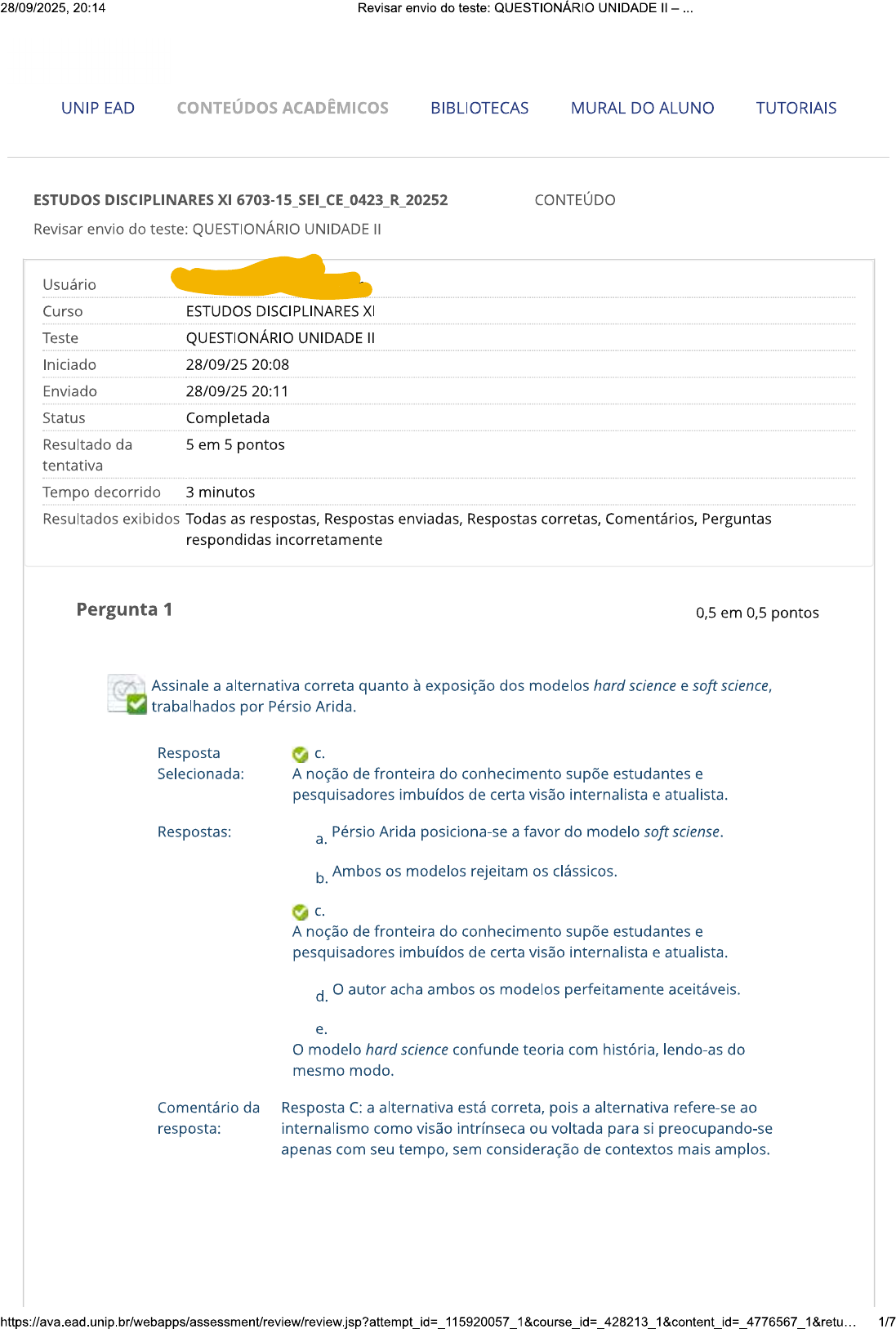 28/09/2025, 20:14 Revisar envio do teste: QUESTIONÁRIO UNIDADE UNIP EAD CONTEÚDOS ACADÊMICOS BIBLIOTECAS MURAL DO ALUNO TUTORIAIS ESTUDOS DISCIPLINARES XI 6703-15_SEI_CE_0423_R_20252 CONTEÚDO Revisar envio do teste: QUESTIONÁRIO UNIDADE Usuário Curso ESTUDOS DISCIPLINARES XI Teste QUESTIONÁRIO UNIDADE Iniciado 28/09/25 20:08 Enviado 28/09/25 20:11 Status Completada Resultado da 5 em 5 pontos tentativa Tempo decorrido 3 minutos Resultados exibidos Todas as respostas, Respostas enviadas, Respostas corretas, Comentários, Perguntas respondidas incorretamente Pergunta 1 0,5 em 0,5 pontos Assinale a alternativa correta quanto à exposição dos modelos hard science e soft science, trabalhados por Pérsio Arida. Resposta Selecionada: A noção de fronteira do conhecimento supõe estudantes e pesquisadores imbuídos de certa visão internalista e atualista. Respostas: Pérsio Arida posiciona-se a favor do modelo soft sciense. a. b. Ambos os modelos rejeitam os clássicos. C. A noção de fronteira do conhecimento supõe estudantes e pesquisadores imbuídos de certa visão internalista e atualista. d. autor acha ambos os modelos perfeitamente aceitáveis. e. modelo hard science confunde teoria com história, lendo-as do mesmo modo. Comentário da Resposta C: a alternativa está correta, pois a alternativa refere-se ao resposta: internalismo como visão intrínseca ou voltada para si preocupando-se apenas com seu tempo, sem consideração de contextos mais amplos. 1/728/09/2025, 20:14 Revisar envio do teste: QUESTIONÁRIO UNIDADE Pergunta 2 0,5 em 0,5 pontos Assinale a alternativa correta quanto ao papel da racionalidade nas análises encaminhadas pelas correntes de pensamento econômico. Resposta Selecionada: A forma, contexto e a retórica interferem diretamente nas ações de investidores na corrente das finanças comportamentais. Respostas: a. A maioria das correntes tratam das relações produtivas, tomando-as como previsíveis. b. As escolas de finanças racionais e comportamentais são muito semelhantes. A forma, contexto e a retórica interferem diretamente nas ações de investidores na corrente das finanças comportamentais. d. mercado financeiro movimenta-se somente de modo racional. e. novo-keynesianismo é contra coordenação dos agentes, deixando a regulação para mercado. Comentário da Resposta: resposta: Comentário: a alternativa está correta, pois trata do papel da retórica na dinâmica econômica. Pergunta 3 0,5 em 0,5 pontos Assinale a alternativa correta. Resposta a. Selecionada: A posição teórica de Imre Lakatos (programas) é de salvaguardar parte fundamental da teoria, aquela das perguntas não respondidas, reservando outros argumentos e hipóteses para refutação. Respostas: a. A posição teórica de Imre Lakatos (programas) é de salvaguardar parte fundamental da teoria, aquela das perguntas não respondidas, reservando outros argumentos e hipóteses para refutação. b. Lakatos submete seu programa (visão teórica) à sucessão de paradigmas de Kuhn, descartando apenas a tenacidade. Lakatos submete integralmente seus programas de investigação científica aos críticos. d. Lakatos descarta pensamento de Popper ao pretender superá-lo. 2/728/09/2025, 20:14 Revisar envio do teste: QUESTIONÁRIO UNIDADE e. Lakatos apoia a evolução de seus programas na heurística negativa. Comentário da Resposta: A resposta: Comentário: está correta, pois trata do núcleo duro a ser protegido em manutenção da teoria em questão. Pergunta 4 0,5 em 0,5 pontos Assinale a alternativa correta. Resposta Selecionada: Há no trabalho de Pérsio Arida um grande passo em direção à retórica dos discursos científicos. Respostas: Arida não acredita nas teorias históricas. a. b. Arida não tem sugestão de superação do impasse entre os dois modelos que estuda tão bem: hard science e soft science. Há no trabalho de Pérsio Arida um grande passo em direção à retórica dos discursos científicos. d. Para Arida basta estudar estado da arte nos temas especializados em economia. e. Arida nega a importância da retórica na prática econômica. Comentário da Resposta: resposta: Comentário: está correta, pois a retórica dos discursos é a base do ensaio de P. Arida. Pergunta 5 0,5 em 0,5 pontos Assinale a alternativa correta. Resposta b. Selecionada: As questões colocadas por Milton Friedman influenciaram sobremaneira a produção econômica nas décadas seguintes. Respostas: a. A autora afirma que poucas são as contribuições de filosofia da ciência no campo da metodologia econômica. 3/728/09/2025, 20:14 Revisar envio do teste: QUESTIONÁRIO UNIDADE b. As questões colocadas por Milton Friedman influenciaram sobremaneira a produção econômica nas décadas seguintes. C. 0 positivismo lógico incorporava muito facilmente os postulados metafísicos. d. modelo hipotético-dedutivo confunde-se com dialético. e. Popper era essencialmente um positivista. Comentário da Resposta: resposta: Comentário: a alternativa está correta, pois é correta a afirmação sobre a grande influência exercida por Friedman na posteridade. Pergunta 6 0,5 em 0,5 pontos Assinale a alternativa correta. Resposta a. Selecionada: Arida tem um plano de superação das visões atualistas e históricas. Respostas: a. Arida tem um plano de superação das visões atualistas e históricas. b. Arida não acredita nos discursos sobre a ciência e sobre objeto. C. modelo soft science não se ocupa de questões históricas. d. modelo soft science trabalha na fronteira do conhecimento. modelo hard science é historicista. e. Comentário da Resposta: A resposta: Comentário: está correta, pois Arida tem um plano de síntese para superar os dois modelos. Pergunta 7 0,5 em 0,5 pontos Assinale a alternativa correta. 4/728/09/2025, 20:14 Revisar envio do teste: QUESTIONÁRIO UNIDADE Resposta Selecionada: A referência a uma falsa polêmica entre ideologia e ciência tem por base reconhecimento de que t