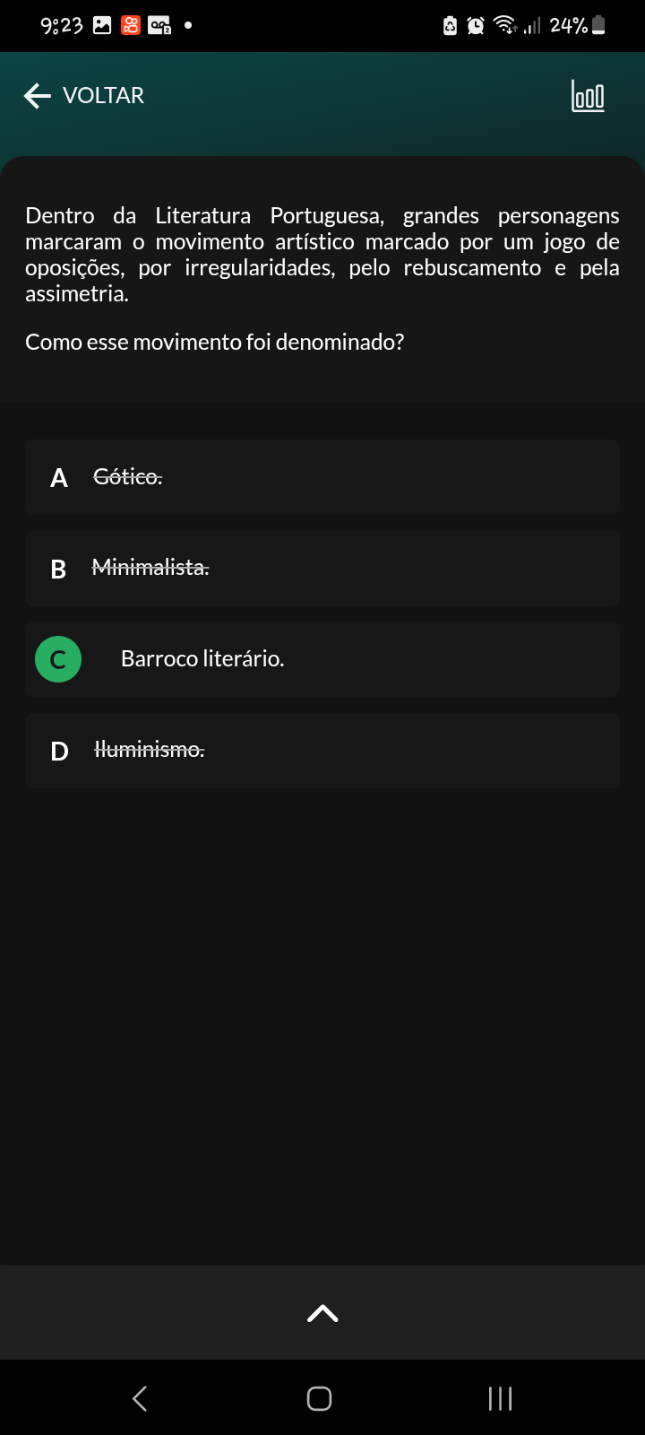 9:23 24% VOLTAR Dentro da Literatura Portuguesa, grandes personagens marcaram o movimento artístico marcado por um jogo de oposições, por irregularidades, pelo rebuscamento e pela assimetria. Como esse movimento foi denominado? A Gótico. Minimalista. Barroco literário. D