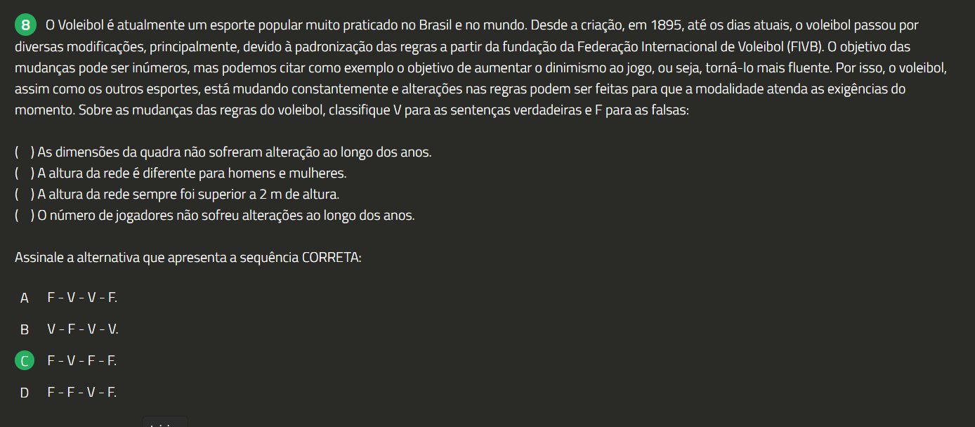 8 0 Voleibol é atualmente um esporte popular muito praticado no Brasil e no mundo. Desde a criação, em 1895, até dias atuais, 0 voleibol passou por diversas modificações, principalmente, devido à padronização das regras a partir da fundação da Federação Internacional de Voleibol (FIVB). 0 objetivo das mudanças pode ser inúmeros, mas podemos citar como exemplo 0 objetivo de aumentar 0 dinimismo ao jogo, ou seja, torná-lo mais fluente. Por isso, 0 voleibol, assim como outros esportes, está mudando constantemente e alterações nas regras podem ser feitas para que a modalidade atenda as exigências do momento. Sobre as mudanças das regras do voleibol, classifique V para as sentenças verdadeiras e F para as falsas: As dimensões da quadra não sofreram alteração ao longo dos anos. A altura da rede é diferente para homens e mulheres. A altura da rede sempre foi superior a 2 m de altura. 0 número de jogadores não sofreu alterações ao longo dos anos. Assinale a alternativa que apresenta a sequência CORRETA: A F-V-V-F. V-F-V-V. F-V-F-F. D F-F-V-F.