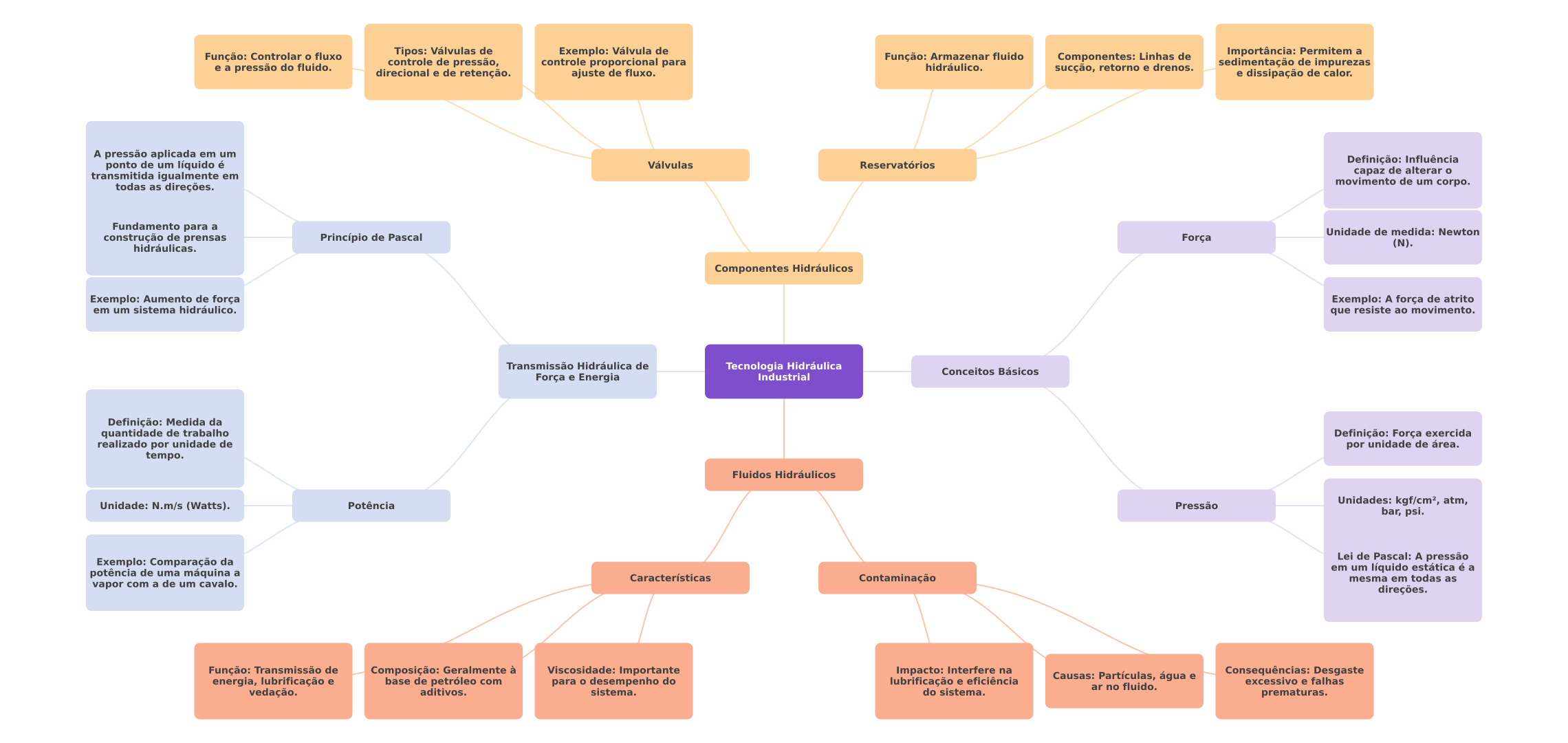 Função: Controlar fluxo Tipos: Válvulas de Exemplo: Válvula de Função: Armazenar fluido controle de pressão, Componentes: Linhas de Importância: Permitem a e a pressão do fluido. controle proporcional para hidráulico. sucção, retorno e drenos. sedimentação de impurezas direcional e de retenção. ajuste de fluxo. e dissipação de calor. A pressão aplicada em um ponto de um líquido é Definição: Influência Válvulas Reservatórios transmitida igualmente em capaz de alterar todas as direções. movimento de um corpo. Fundamento para a Unidade de medida: Newton construção de prensas Princípio de Pascal Força hidráulicas. (N). Componentes Hidráulicos Exemplo: Aumento de força Exemplo: A força de atrito em um sistema hidráulico. que resiste ao movimento. Transmissão Hidráulica de Tecnologia Hidráulica Conceitos Básicos Força e Energia Industrial Definição: Medida da quantidade de trabalho Definição: Força exercida realizado por unidade de por unidade de área. tempo. Fluidos Hidráulicos Unidade: N.m/s (Watts). Potência Pressão Unidades: kgf/cm2, atm, bar, psi. Exemplo: Comparação da Lei de Pascal: A pressão potência de uma máquina a em um líquido estática é a Características Contaminação mesma em todas as vapor com a de um cavalo. direções. Função: Transmissão de Composição: Geralmente à Viscosidade: Importante Impacto: Interfere na energia, lubrificação e base de petróleo com para desempenho do Causas: Partículas, água e Consequências: Desgaste lubrificação e eficiência excessivo e falhas ar no fluido. vedação. aditivos. sistema. do sistema. prematuras.