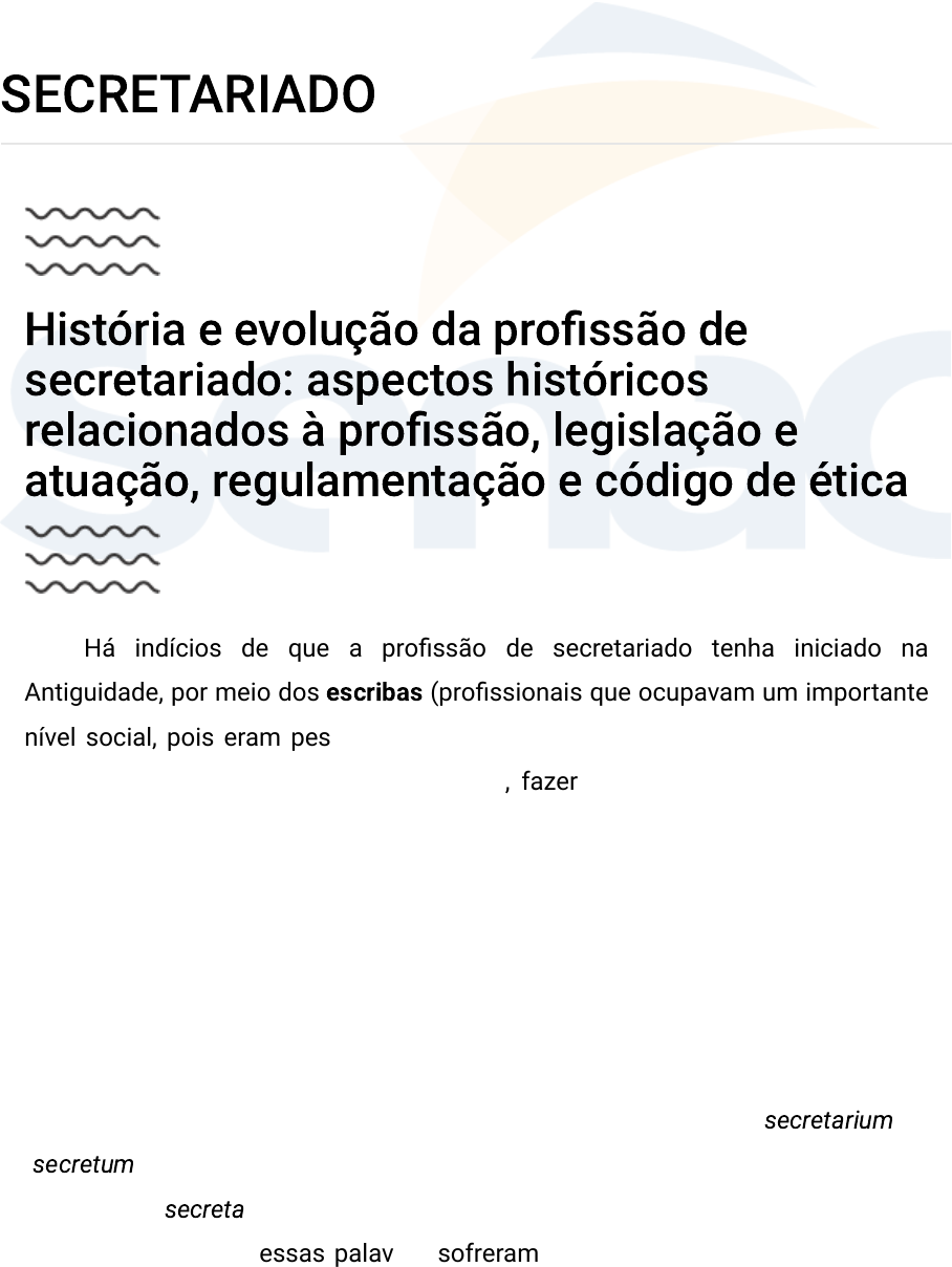SECRETARIADO História e evolução da profissão de secretariado: aspectos históricos relacionados à profissão, legislação e atuação, regulamentação e código de ética Há indícios de que a profissão de secretariado tenha iniciado na Antiguidade, por meio dos escribas (profissionais que ocupavam um importante nível social, pois eram pessoas cultas que dominavam a arte de escrever). As funções dos escribas eram redigir textos, fazer registros numéricos, escrever leis, fazer cópias de informações e arquivar as informações. Portanto, eles executavam tarefas administrativas e contábeis. Tais profissionais deram origem a muitas profissões ligadas à escrita e aos cálculos. Entretanto, naquela época, a profissão de escriba era dominada por homens. O termo “secretário” teve origem nas palavras em latim “secretarium” e “secretum”, as quais significam “lugar retirado” ou “conselho privado”, bem como na palavra “secreta”, que significa “particular”, “segredo” ou “mistério”. Com o passar dos tempos, essas palavras sofreram alterações tanto na grafia quanto no significado. Em 1877, nos Estados Unidos, a primeira mulher secretária iniciou as suas atividades. Em um escritório em Nova Iorque, ela intitulou-se secretária de um executivo, o qual não aceitou a ideia imediatamente e a questionou se não seria mais adequado contratar um homem. Contudo, a mulher reivindicou o seu espaço, e o executivo acabou cedendo. No início do século XX, já existiam aproximadamente 50.000 secretárias mulheres, o que resultou em diversas modificações nos escritórios com relação à organização, à limpeza, à decoração e ao cuidado com os ambientes. Esse avanço causou muita discordância entre os executivos, que tiveram que aceitar essa nova função nos escritórios. Com isso, as mulheres conseguiram conquistar um espaço no mundo empresarial. Todavia, o aumento do número de profissionais mulheres foi aceito pelos homens devido ao fato de elas ganharem um salário inferior ao deles (aproximadamente um terço do salário que um homem ganharia), o que era um benefício para os executivos. Aos poucos, as mulheres começaram a lutar por salários mais altos e benefícios. Quanto mais o número de secretárias no mercado de trabalho crescia, mais elas se uniam para reivindicar melhores salários e condições de trabalho. Com muito esforço, a maioria conseguiu ganhar uma semana de férias (não remunerada) por ano. Na época da Primeira Guerra Mundial, as mulheres também tiveram mais participação no trabalho em escritórios, pois começaram a substituir os homens em muitas atividades. Havia mulheres atuando como secretárias, mas fazendo, ao mesmo tempo, o papel do executivo, trabalhando em outras atividades. Isso significa que, enquanto muitos homens precisavam cumprir o serviço militar, surgiu a necessidade de haver mais pessoas nos escritórios, e as mulheres aceitaram o desafio. Quando os homens retornaram para as suas atividades, perceberam que tinham perdido um pouco de espaço. Após a guerra, as mulheres conseguiram manter as funções que foram arduamente conquistadas. Então, na década de 1920, já havia registro de mais de 1 milhão de mulheres trabalhando como secretárias e também como estenógrafas. Com todas essas mudanças, também houve alterações sociais e culturais, pois as mulheres que estavam no mercado de trabalho tinham cada vez menos tempo de cuidar dos trabalhos domésticos. Sendo assim, as casas e os apartamentos começaram a diminuir de tamanho, o que exigia menos esforço nos cuidados do lar. Além disso, na época também começaram a surgir alimentos enlatados e eletrodomésticos, os quais facilitavam a vida das mulheres. Ainda, por volta de 1930, já havia aproximadamente 3 milhões de secretárias no mundo, atuando também como datilógrafas e estenógrafas. Desde então, esse número só aumentou, mostrando o quanto as secretárias eram – e são – importantes nas empresas. A profissão chegou ao Brasil devido à expansão das multinacionais americanas, as quais já contavam com profissionais ocupando cargos de secretaria. Em meados dos anos 1950, iniciou-se um movimento que resultou em associações de secretárias. Em 20 de setembro de 1977, a Lei 1.421/77, que definiu a data de 30 de setembro como o Dia Nacional da Secretária, foi sancionada. Essa data estava relacionada ao aniversário de Lilian Sholes, que era filha do inventor da máquina de escrever, Charles Sholes. Lilian foi a primeira mulher a datilografar em público, fazendo uma demonstração da invenção do pai. Em 1978, surgiu a Lei n.º 6.556, de 5 de setembro de 1978. Tal lei foi o primeiro documento que reconheceu a profissão de secretária. Após, por meio de muita luta da ABES (Associação Brasileira de Entidades de Secretárias), a qual elaborou o Código de Ética da Secretária Brasileira, foi aprovado o documento em 30 de setembro de 1983. Em 30 de setembro de 1985, foi instituída a Lei 7.377/85, que está em vigor até os dias atuais. Essa lei regulamentou a profissão e foi uma grande conquista para as entidades da classe secretarial no Brasil. Ainda, em 1996, houve uma complementação na lei. Mesmo com todos os avanços, somente por volta de 1990 a profissão começou a ganhar destaque nas empresas, pois o papel do profissional da área começou a ser visto como indispensável para a gestão. A Internet impulsionou as formas de trabalho no Brasil, o que também foi muito importante para o secretariado. Dessa forma, as atividades da área começaram a mudar, pois os executivos e as executivas precisavam de uma pessoa que prestasse assistência, o que permitiu que os profissionais de secretariado tivessem uma visão mais estratégica das organizações para que pudessem dar o suporte necessário aos dirigentes. Com isso, os profissionais da área começaram a agregar novas funções. Como bem ressalta Veiga (2015, p. 