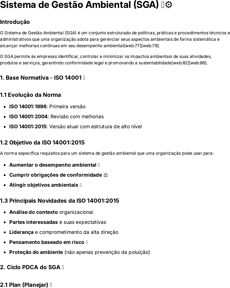 O Sistema de Gestão Ambiental �SGA) é um conjunto estruturado de políticas, práticas e procedimentos técnicos e administrativos que uma organização adota para gerenciar seus aspectos ambientais de forma sistemática e alcançar melhorias contínuas em seu desempenho ambiental[web:77][web:79]. O SGA permite às empresas identificar, controlar e minimizar os impactos ambientais de suas atividades, produtos e serviços, garantindo conformidade legal e promovendo a sustentabilidade[web:82][web:86]. A norma especifica requisitos para um sistema de gestão ambiental que uma organização pode usar para: Sistema de Gestão Ambiental �SGA� ⚙ Introdução 1. Base Normativa - ISO 14001 1.1 Evolução da Norma ISO 14001�1996: Primeira versão ISO 14001�2004: Revisão com melhorias ISO 14001�2015: Versão atual com estrutura de alto nível 1.2 Objetivo da ISO 14001�2015 Aumentar o desempenho ambiental Cumprir obrigações de conformidade ⚖ Atingir objetivos ambientais 1.3 Principais Novidades da ISO 14001�2015 Análise do contexto organizacional Partes interessadas e suas expectativas Liderança e comprometimento da alta direção Pensamento baseado em risco Proteção do ambiente (não apenas prevenção da poluição) 2. Ciclo PDCA do SGA 2.1 Plan �Planejar) Contexto da Organização Questões internas e externas Necessidades das partes interessadas Determinação do escopo do SGA Política Ambiental Apropriada à natureza e escala da organização Comprometimento com melhoria contínua Comprometimento com prevenção da poluição Comprometimento com proteção do ambiente Cumprimento de obrigações de conformidade Aspectos Ambientais Aspecto Ambiental: Elemento das atividades que pode interagir com o meio ambiente Impacto Ambiental: Qualquer modificação no meio ambiente resultante dos aspectos Critérios de significância: Magnitude, frequência, duração, reversibilidade 2.2 Do �Fazer� ⚙ Recursos e Competência Recursos humanos especializados Infraestrutura organizacional Tecnologia adequada Recursos financeiros Controle Operacional Procedimentos para situações que podem causar impactos significativos Controles para fornecedores e prestadores de serviços Projeto e desenvolvimento considerando aspectos ambientais Preparação para Emergências Identificação de situações de emergência potenciais Procedimentos de resposta Testes periódicos dos procedimentos 2.3 Check �Verificar) Monitoramento e Medição Indicadores ambientais de desempenho Calibração de equipamentos de monitoramento Avaliação do cumprimento das obrigações de conformidade Auditoria Interna Planejamento: Programa de auditoria Execução: Condução das auditorias Relatório: Documentação dos resultados Acompanhamento: Verificação das ações corretivas 2.4 Act �Agir� Não Conformidade e Ação Corretiva Identificação de não conformidades Investigação de causas-raiz Implementação de ações corretivas Verificação da eficácia das ações Melhoria Contínua Análise crítica pela direção Definição de novos objetivos Implementação de melhorias 3. Implementação do SGA 3.1 Fase Preparatória ���Comprometimento da alta direção ���Diagnóstico ambiental inicial ���Definição do escopo ���Elaboração da política ambiental A auditoria ambiental é um processo sistemático, independente e documentado para obter evidências e avaliar objetivamente se o SGA atende aos critérios estabelecidos[web:78][web:81]. 3.2 Fase de Planejamento ���Identificação de aspectos e impactos ���Identificação de requisitos legais ⚖ ���Definição de objetivos e metas ���Elaboração de programas ambientais 3.3 Fase de Implementação ���Estrutura organizacional ���Treinamento e conscientização ���Comunicação ���Documentação ���Controle operacional ⚙ 3.4 Fase de Verificação ���Monitoramento ���Auditoria interna ���Análise crítica 4. Auditoria Ambiental 4.1 Conceito 4.2 Tipos de Auditoria Auditoria de Primeira Parte �Interna) Realizada pela própria organização Objetivo: Melhoria contínua e preparação para auditorias externas Auditoria de Segunda Parte Realizada por clientes ou partes interessadas Objetivo: Verificação de fornecedores Auditoria de Terceira Parte �Certificação) Realizada por organismo certificador independente Objetivo: Certificação ISO 14001 4.3 Etapas da Auditoria Planejamento Definição de escopo e critérios Formação da equipe auditora Elaboração do plano de auditoria Execução Reunião de abertura Coleta de evidências Identificação de não conformidades Reunião de encerramento Relatório Documentação dos achados Classificação das não conformidades Recomendações de melhoria Acompanhamento Verificação das ações corretivas Análise da eficácia das correções 5. Gestão de Efluentes no SGA 5.1 Aspectos Ambientais Relacionados Geração de efluentes industriais Consumo de água nos processos Lançamento de efluentes tratados Geração de lodo do tratamento 5.2 Impactos Ambientais Potenciais Poluição hídrica por compostos orgânicos Eutrofização por nutrientes �N e P� Alteração do pH dos corpos receptores Contaminação por metais pesados 5.3 Controles Operacionais Monitoramento contínuo dos parâmetros de efluentes Calibração de equipamentos de medição Manutenção preventiva dos sistemas de tratamento Treinamento de operadores 5.4 Indicadores de Desempenho DBO �Demanda Bioquímica de Oxigênio) - mg/L DQO �Demanda Química de Oxigênio) - mg/L Sólidos suspensos - mg/L pH - adimensional Eficiência de remoção - % 6. Benefícios do SGA 6.1 Benefícios Ambientais Redução de impactos ambientais Conservação de recursos naturais Prevenção da poluição Proteção de ecossistemas 6.2 Benefícios Econômicos Redução de custos operacionais Economia de recursos (água, energia) ⚡ Prevenção 