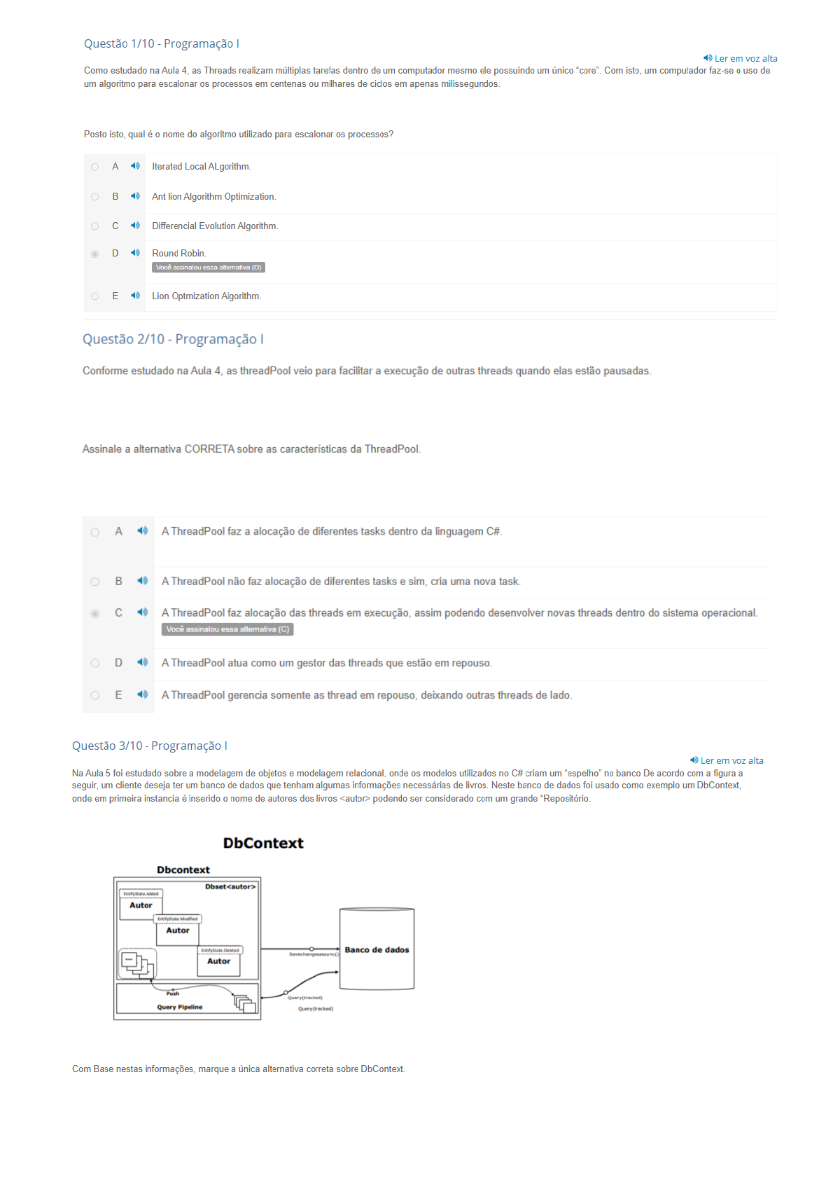 Questão 1/10 Programação Ler em voz alta Como estudado na Aula 4, as Threads realizam múltiplas tarefas dentro de um computador mesmo ele possuindo um único "core". Com isto, um computador faz-se 0 uso de um algoritmo para escalonar processos em centenas ou milhares de ciclos em apenas milissegundos. Posto isto, qual é 0 nome do algoritmo utilizado para escalonar processos? A Iterated Local ALgorithm. Ant lion Algorithm Optimization. Differencial Evolution Algorithm. D Round Você assinalou essa alternativa (D) E Lion Optmization Algorithm. Questão 2/10 Programação Conforme estudado na Aula 4, as threadPool veio para facilitar a execução de outras threads quando elas estão pausadas. Assinale a alternativa CORRETA sobre as características da ThreadPool. A A ThreadPool faz a alocação de diferentes tasks dentro da linguagem C#. A ThreadPool não faz alocação de diferentes tasks e sim, cria uma nova task. A ThreadPool faz alocação das threads em execução, assim podendo desenvolver novas threads dentro do sistema operacional. Você assinalou essa alternativa (C) D A ThreadPool atua como um gestor das threads que estão em repouso. E A ThreadPool gerencia somente as thread em repouso, deixando outras threads de lado. Questão 3/10 Programação Ler em voz alta Na Aula 5 foi estudado sobre a modelagem de objetos e modelagem relacional, onde os modelos utilizados no C# criam um "espelho" no banco De acordo com a figura a seguir, um cliente deseja ter um banco de dados que tenham algumas informações necessárias de livros. Neste banco de dados foi usado como exemplo um DbContext, onde em primeira instancia é inserido 0 nome de autores dos livros podendo ser considerado com um grande "Repositório. DbContext Dbcontext Dbset Added Autor EntifyState Modified Autor EntifyState Banco de dados Autor Push Query(tracked) Query Pipeline Query(tracked) Com Base nestas informações, marque a única alternativa correta sobreA DbContext são atributos de uma classe do EF para conseguir manipular as entidades. As alterações ocorridas ao longo da inclusão podem ser realizadas diretamente no banco de dados e não devem comunicar com 0 DbContext sobre estas atualizações. C DbContext é uma classe abstrata e há a necessidade de herdá-la implementando alguns métodos,para usá-la em nossa aplicação. Você assinalou essa alternativa (C) D DbContext não traduz querys LINQ em SQL devido ao tamanho do arquivo não ser compatível com a plataforma SQL E DbContext consegue traduzir querys LINQ em SQL utilizando um repositório pequeno e com a classe secundária do Questão 4/10 Programação Ler em voz alta Na Aula 6 e nos códigos apresentados ao longo da disciplina, foi estudado sobre 0 protocolo HTTP, onde 0 REST e SOAP são duas formas de prover serviços para este tipo de protocolo. Ao comparar essas duas opções para desenvolver algoritmo, um programador poderá encontrar algumas características que as diferem e outras que são implementadas por ambas. Assinale a única alternativa correta sobre 0 protocolo HTTP. A SOAP e REST aceitam 0 uso HTML+CSS como formato das respostas. REST utiliza vários formatos, como JSON, RSS ou mesmo XML, Já SOAP somente usa XML para fornecer a resposta. Você assinalou essa alternativa (B) SOAP e REST somente usam 0 JSON como formato das respostas. D REST inclui 0 tratamento de erro por meio de códigos padronizados, enquanto SOAP usa verbos HTTP como GET, PUT e DELETE para tratamento de erro. E SOAP pode ser usado apenas com 0 protocolo (HTTP), enquanto REST permite usar outros tipos de protocolos. Questão 5/10 Programação Ler em voz Na Aula 5 foi citado sobre 0 EF enity framwork), sendo ele um modelador de objetos em C# que utiliza bancos para criar um espelho do modelo. Além disso, 0 EF possui vários estados paras suas entidades. Assinale a única alternativa correta que apresente algumas de suas entidades. A Entidades são novas e são inseridas no banco de dados; as entidades não foram alteradas ainda desde que foram consultadas no banco de dados; as entidades não podem ser modificadas depois que foram consultadas no banco de dados; as entidades existem no banco de dados, mas já estão gravadas para serem excluídas quando CloseChanges; As entidades podem ser acompanhadas pelo Entidades são novas e ainda não foram inseridas no banco de dados; as entidades não foram alteradas ainda desde que foram consultadas no banco de dados; as entidades podem ser modificadas depois que foram consultadas no banco de dados; as entidades existem no banco de dados, mas já estão gravadas para serem excluídas quando FilterChanges; As entidades não estão sendo acompanhadas pelo C Entidades são novas e ainda não foram inseridas no banco de dados; as entidades não foram alteradas ainda desde que foram consultadas no banco de dados; as entidades podem ser modificadas depois que foram consultadas no banco de dados; as entidades existem no banco de dados, mas já estão gravadas para serem excluídas quando SaveChanges; As entidades não estão sendo acompanhadas pelo Você assinalou essa alternativa (C) D Entidades são novas e ainda não foram inseridas no banco de dados; as entidades não foram alteradas ainda desde que foram consultadas no banco de dados; as entidades podem ser modificadas depois que foram consultadas no banco de dados; as entidades existem no banco de dados, mas já estão gravadas para serem excluídas quando DellChanges; As entidades não estão sendo acompanhadas pelo DbContext. E Entidades são novas e ainda não foram inseridas no banco de dados; as entidades não foram alteradas ainda desde que foram consultadas no banco de dados; as entidades podem ser modificadas depois que foram consultadas no banco de dados; as entidades existem no banco de dados, mas já estão gravadas para serem excluídas quando ClearChanges; As entidades não estão sendo acompanhadas peloQuestão 6/10 Programação Na Aula 4, foi citado sobe 0 