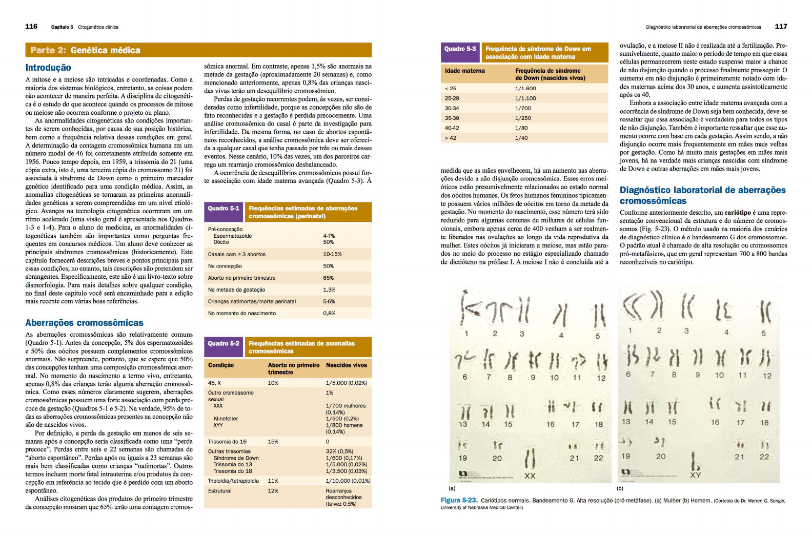 116 Capítulo 5 Citogenética clínica Parte 2: Genética médica Introdução A mitose e a meiose são intricadas e coordenadas. Como a maioria dos sistemas biológicos, entretanto, as coisas podem não acontecer de maneira perfeita. A disciplina de citogenéti ca é o estudo do que acontece quando os processos de mitose ou meiose não ocorrem conforme o projeto ou plano. As anormalidades citogenéticas são condições importan tes de serem conhecidas, por causa de sua posição histórica, bem como a frequência relativa dessas condições em geral. A determinação da contagem cromossômica humana em um número modal de 46 foi corretamente atribuída somente em 1956. Pouco tempo depois, em 1959, a trissomia do 21 (uma cópia extra, isto é, uma terceira cópia do cromossomo 21) foi associada à síndrome de Down como o primeiro marcador genético identificado para uma condição médica. Assim, as anomalias citogenéticas se tomaram as primeiras anormali dades genéticas a serem compreendidas em um nível etioló gico. Avanços na tecnologia citogenética ocorreram em um ritmo acelerado (uma visão geral é apresentada nos Quadros 1-3 e 1-4). Para o aluno de medicina, as anormalidades ci togenéticas também são importantes como perguntas fre quentes em concursos médicos. Um aluno deve conhecer as principais síndromes cromossômicas (historicamente). Este capítulo fornecerá descrições breves e pontos principais para essas condições; no entanto, tais descrições não pretendem ser abrangentes. Especificamente, este não é um livro-texto sobre dismorfologia. Para mais detalhes sobre qualquer condição, no final deste capítulo você será encaminhado para a edição mais recente com várias boas referências. - A. • Aberraçoes cromossom1cas As aberrações cromossômicas são relativamente comuns (Quadro 5-1 ). Antes da concepção, 5% dos espermatozoides e 50% dos oócitos possuem complementos cromossômicos anormais. Não surpreende, portanto, que se espere que 50% • - A • das concepções tenham uma compos1çao cromossoffilca anor- mal. No momento do nascimento a termo vivo, entretanto, apenas 0,8% das crianças terão alguma aberração cromossô mica. Como esses números claramente sugerem, aberrações cromossômicas possuem uma forte associação com perda pre coce da gestação (Quadros 5-1 e 5-2). Na verdade, 95% de to das as aberrações cromossômicas presentes na concepção não são de nascidos vivos. Por definição, a perda da gestação em menos de seis se manas após a concepção seria classificada como uma "perda precoce". Perdas entre seis e 22 semanas são chamadas de "aborto espontâneo". Perdas após ou iguais a 23 semanas são mais bem classificadas como crianças "natimortas". Outros termos incluem morte fetal intrauterina e/ou produtos da con cepção em referência ao tecido que é perdido com um aborto espontâneo. Análises citogenéticas dos produtos do primeiro trimestre da concepção mostram que 65% terão uma contagem cromos- sômica anormal. Em contraste, apenas 1,5% são anormais na metade da gestação (aproximadamente 20 semanas) e, como mencionado anteriormente, apenas 0,8% das crianças nasci das vivas terão um desequilíbrio cromossômico. Perdas de gestação recorrentes podem, às vezes, ser consi deradas como infertilidade, porque as concepções não são de fato reconhecidas e a gestação é perdida precocemente. Uma análise cromossômica do casal é parte da investigação para infertilidade. Da mesma forma, no caso de abortos espontâ neos reconhecidos, a análise cromossômica deve ser ofereci da a qualquer casal que tenha passado por três ou mais desses eventos. Nesse cenário, 10% das vezes, um dos parceiros car rega um rearranjo cromossômico desbalanceado. A ocorrência de desequilíbrios cromossômicos possui for te associação com idade materna avançada (Quadro 5-3). À Pré-concepção Espermatozoide Oócito Casais com > 3 abortos Na concepção 4-7% 50% 10-15% 50% Aborto no primeiro trimestre 65% Na metade da gestação 1,3% Crianças natimortas/morte perinatal No momento do nascimento 5-6% 0,8% Frequências estimadas de anomallas crom ômicas Condição 45,X Outro cromossomo sexual xxx Klinefelter XYY Trissarnia do 16 Outras trissarnias Síndrome de Down Trissarnia do 13 Trissarnia do 18 Tripio id ia/tetrapio id ia Estrutura l Aborto no primeiro Nascidos vivos trimestre 10% 1/5.000 (0,02%) 1% 15% 11% 12% 1/700 mulheres (0,14%) 1/500 (0,2%) 1/800 homens (0,14%) o 32% (0,5%) 1/600 (0,17%) 1/5.000 (0,02%) 1/3.500 (0,03%) 1/10,000 (0,01%) Rearranjos desconhecidos (talvez 0,5%) Quadro 5-3 Frequência de síndrome de Down em associação com Idade materna Idade materna Frequência de síndrome de Down (nascidos vivos) 42 1/40 medida que as mães envelhecem, há um aumento nas aberra ções devido a não disjunção cromossômica. Esses erros mei óticos estão presumivelmente relacionados ao estado normal dos oócitos humanos. Os fetos humanos femininos tipicamen te possuem vários milhões de oócitos em tomo da metade da gestação. No momento do nascimento, esse número terá sido reduzido para algumas centenas de milhares de células fun cionais, embora apenas cerca de 400 venham a ser realmen te liberados nas ovulações ao longo da vida reprodutiva da mulher. Estes oócitos já iniciaram a meiose, mas estão para dos no meio do processo no estágio especializado chamado de dictióteno na prófase I. A meiose I não é concluída até a - 1 2 • ~1 6 7 8 - --- - . - ' ' 13 14 15 ~. 19 20 .,.....,.. ........ , ~ ... ~ , ,_. • .,.. C:M•011ura ~..n'AtlOhi ... -.s1f1J1t e-•. (a) 3 4 9 10 t -, - 16 XX 17 1 ~ - 21 - . 5 J 12· 18 • 22 Diagnóst ico laboratorial de aberrações cromossômicas 117 ovulação, e a meiose II não é realizada até a fertilização. Pre sumivelmente, quanto maior o período de tempo em que essas células permanecerem neste estado suspenso maior a chance de não disjunção