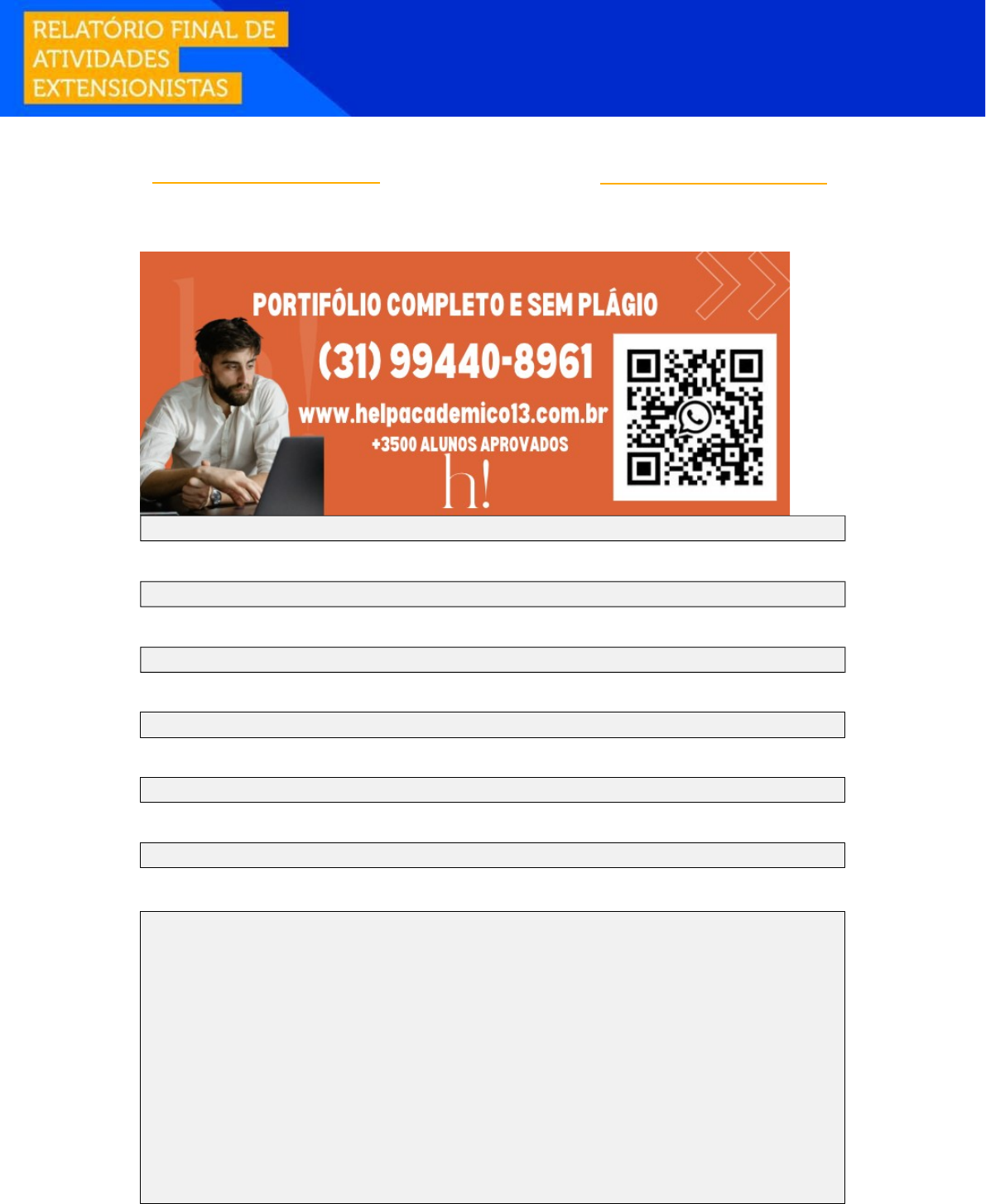DADOS DO ALUNO Aluno: [Nome completo] RA: [Número do RA do aluno] POLO / UNIDADE: CURSO: ENGENHARIA CIVIL - BACHARELADO COMPONENTE CURRICULAR: PROJETO DE EXTENSÃO III - ENGENHARIA CIVIL PROGRAMA DE EXTENSÃO: PROGRAMA DE INOVAÇÃO E EMPREENDEDORISMO. FINALIDADE E MOTIVAÇÃO: A finalidade da extensão no Programa de Inovação e Empreendedorismo está na articulação de múltiplas competências desenvolvidas durante o curso, criando soluções de produtos e serviços em que que atenda as necessidades do outro, de forma empática, eficaz e sustentável, trazendo a tecnologia e o conhecimento da engenharia civil para a sociedade, beneficiando a comunidade local com o conhecimento adquirido. Os locais que poderão contemplar esse projeto extensionista podem ser: parcerias com a prefeitura; associações de bairros, escolas, praças da cidade, parcerias com empresas públicas e privadas, casas de repouso, creches, edificações públicas como foco em construção civil, estruturas e geotecnia (análise e sugestão de projetos, manutenção de estruturas de concreto, taludes, pavimentação, instalações hidrossanitárias, instalações elétricas, elaboração de desenhos técnicos). COMPETÊNCIAS: I - Desenvolver e utilizar novos materiais, ferramentas e técnicas; II - Ler e interpretar projetos apresentados em forma gráfica; III - Supervisionar, operar e promover a manutenção de sistemas, obras e serviços de Engenharia Civil. PERFIL DO EGRESSO: O perfil do egresso idealizado pela IES para o curso de Engenharia Civil possibilita a formação do engenheiro civil crítico, reflexivo, criativo, visão holística, humanista e ético, capaz de aplicar tecnologias inerentes à sua área de atuação, sendo que pelas atividades extensionistas vinculadas ao Programa de Inovação e Empreendedorismo, esse egresso poderá desenvolver habilidades e capacidade para atuar de modo 1 responsável e comprometido, interagindo com as novas situações e demandas da sociedade, com isenção e responsabilidade social, comprometido com legislação e atos normativos do exercício do profissional, primando pela busca do conhecimento e da aprendizagem autônoma, investigativa, empreendedora e cooperativa com o emprego de perspectivas multidisciplinares. Ainda, desenvolver a capacidade de planejamento e condução de experimentos; exercer atividades de concepção, supervisão, coordenação; analisar, interpretar e agir em situações pertinentes à engenharia civil, a partir de atitudes críticas, reflexivas e éticas, pois adquiriram habilidades suficientes para, eticamente, atuar em projetos de construção civil e de infraestrutura, utilizando técnicas adequadas de observação, compreendendo as necessidades da sociedade, com forte formação técnica e embasamento teórico, especificando materiais de construção e controlando a qualidade dos processos. SOFT SKILLS (COMPETÊNCIAS SOCIOEMOCIONAIS): Tomada de Decisão Análise e resolução de problemas Aprendizado Ativo OBJETIVOS DE APRENDIZAGEM: Os objetivos da extensão em Engenharia Civil vinculados ao Programa de Inovação e Empreendedorismo estão relacionados com a disseminação do saber técnico das áreas da engenharia civil para a comunidade local, prestando serviços e desenvolvendo produtos que possam solucionar problemáticas identificadas na comunidade, trazendo maior segurança, eficiência e conforto, atendendo a sociedade nas necessidades e transferindo conhecimento acadêmico para a comunidade, preparando o egresso para uma atuação global, focado no mercado de trabalho, consciência social, ética e desenvolvimento de competências de aplicação de projetos e soluções técnicas na sua área de formação CONTEÚDOS: I - Expressão gráfica; II - Construção civil; III - Estruturas; IV - Geotecnia. INDICAÇÕES BIBLIOGRÁFICAS: CUNHA, Alessandra Martins ...[et al]. Construção civil. Porto Alegre : SAGAH, 2017. CORREA, Roberto Machado. Desenho técnico civil: projetos de edifícios e outras construções. Rio de Janeiro: Elsevier, 2019. SANTOS NETO, Pedro Murrieta. Mecânica dos solos. Rio de Janeiro : Elsevier, 2018. CORREA, Priscila Marques. Estruturas em concreto armado. Porto Alegre : SAGAH, 2018. RELATÓRIO FINAL Aluno e Aluna, após realizar suas atividades de extensão, é necessário que você o formalize, enviando esse Relatório Final para ser avaliado junto ao seu Ambiente Virtual (AVA) e também para você poder comprovar sua atuação. Para o preenchimento, busque as anotações junto ao TEMPLATE PCDA para auxiliar na apresentação das atividades desenvolvidas. Todos os campos são de preenchimento obrigatório! DESCRIÇÃO DA AÇÃO COM RESULTADOS ALCANÇADOS Metas dos Objetivos de Desenvolvimento Sustentável (ODS) aderentes a este projeto: CAMPO OBRIGATÓRIO – busque no seu Template PDCA quais Metas você selecionou como aderentes ao seu projeto, conforme cada Objetivo de Desenvolvimento Sustentável (ODS) da Organização das Nações Unidas (ONU) que você explorou no seu planejamento. Liste as Metas selecionadas (pelo menos uma opção): Local de realização da atividade extensionista: Durante a ação: Caso necessário, houve mudança de estratégia para alcançar o resultado: Resultado da ação: Conclusão: Depoimentos (se houver): RELATE SUA PERCEPÇÃO DAS AÇÕES EXTENSIONISTAS REALIZADAS NO PROGRAMA DESENVOLVIDO CAMPO OBRIGATÓRIO – relate em no mínimo 15 (quinze) linhas sua experiência com as ações extensionistas. O texto deve ser de sua autoria e inédito, evite plágio. Questões norteadoras: (1) Você notou que suas habilidades profissionais foram aprimoradas, com a atuação nas ações extensionistas? (2) Você identificou melhoria/resolução do problema identificado? (3) Você conseguiu articular os conhecimentos adquiridos no curso com as ações extensionistas? Ao escrever seu texto evite deixá-lo em forma de respostas as questões norteadoras, relate sua experiência em forma 