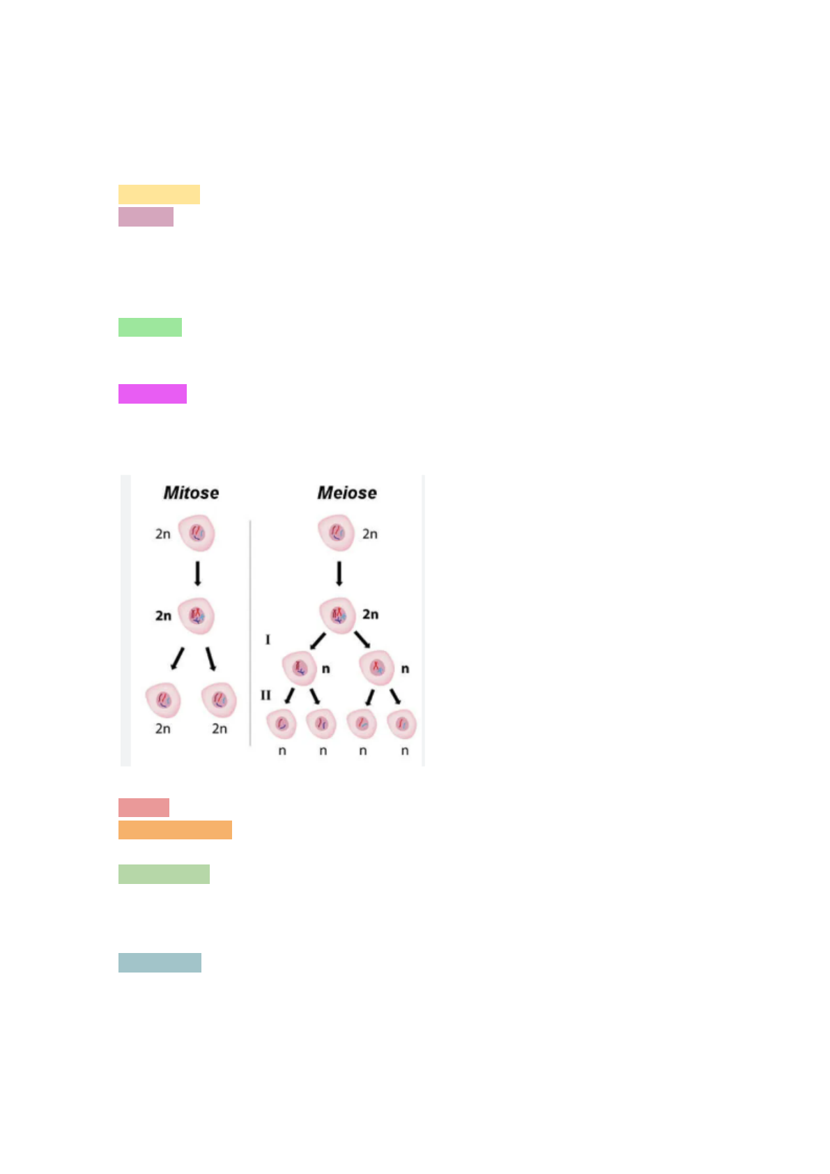 Conceitos em genética - aula 1 - 12/08 RNA = Genética = Estudo dos genes e da hereditariedade. Gene = Gene é uma sequência específica de DNA que contém a informação necessária para a síntese de uma proteína ou um RNA (como tRNA, rRNA, microRNA). O gene é transcrito numa molécula de RNA, processo que chama-se transcrição. O RNAm vai ser traduzido num polipeptídio, que são formados de aminoácidos, que formam proteínas. Mitose = Divisão celular que ocorre nas células somáticas, resultando em duas células filhas diploides com cromossomos completos Meiose = ocorre apenas nas células progenitoras de gametas (ovócitos e espermatozoides), produzindo células haploides, garantindo a variabilidade genética quando gametas maternos e paternos se unem na fecundação. Loco = Posição de um gene no cromossomo. Cromossomo = Estrutura citológica formada por uma molécula de DNA associada ou não à proteínas e RNA. Cromatina = Cromatina é o DNA associado a RNA e proteínas (histonas e não-histonas) nos eucariotos, responsável por organizar e regular a atividade gênica. É o cromossomo durante a divisão celular, a diferença é o estado do ciclo celular. Genoma = Material genético contido no conjunto haplóide de uma espécie. O embrião vai ter genoma materno e paterno. O genoma de duas pessoas não é igual, mas a diferença é tal e mostra que são humanas. Se fosse comparado a um gorila, a diferença é beeem maior. Em nós vemos cor de cabelo, unhas, altura, tipo sanguíneo. Em gêmeos o genoma é igual Código genético = Cada trinca de bases do RNAm (chamada códon) indica qual aminoácido colocar na proteína. O código genético é justamente a “tabela de correspondência” entre cada códons e seu aminoácido. Alelo = Uma versão diferente de um gene, e a combinação dos alelos do pai e da mãe forma o genótipo, que determina o fenótipo da característica. Genótipo = Genótipo é a composição de alelos de um indivíduo para um gene ou para todos os genes. Ex: AA, Aa, aa, que é definido a partir de IA IB Ia Ib i Fenótipo = características observáveis de um organismo, resultado da interação entre genótipo e ambiente. Homozigoto = alelos iguais no mesmo lócus de cromossomos homólogos. Heterozigoto = alelos diferentes no mesmo lócus de cromossomos homólogos.